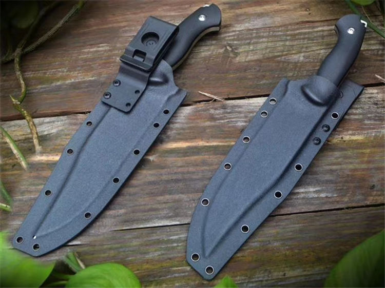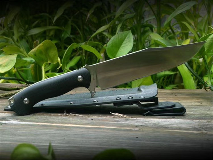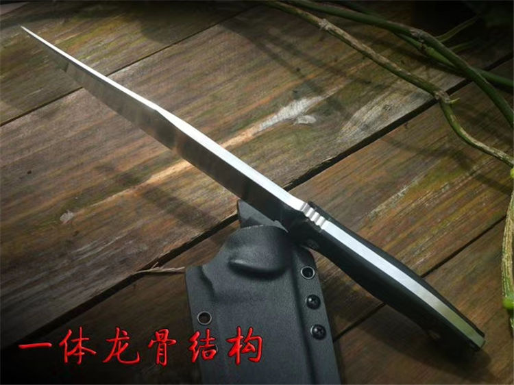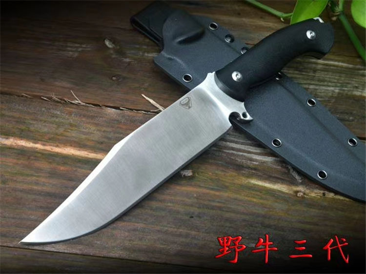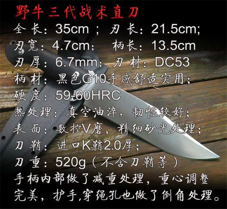野牛三代直刀 全长:35cm 刃长:21.5cm 刃宽:4.7cm 柄长:13.5cm 刃厚:6.7mm 刃材:DC53 柄材:黑色G10手感舒适实用 硬度:59-60Hrc (真空油淬)韧性较好 刀套:进口K鞘2.0厚刀 重:520g (不含刀鞘等) 总重:651g 表面:数控V磨,精细砂光处理; 手柄一体龙骨内部做了感重处理,重心调整完美,护手,穿绳孔做了倒角