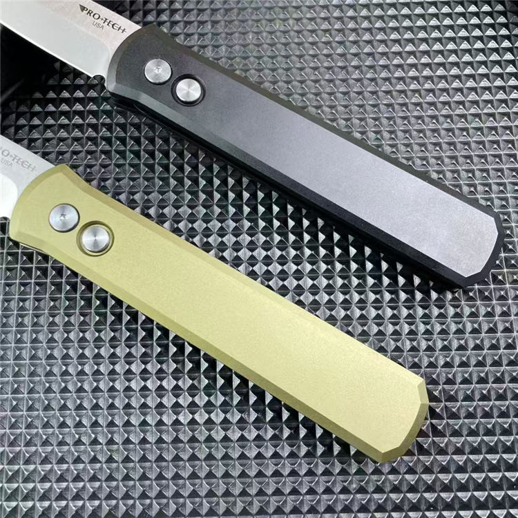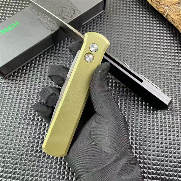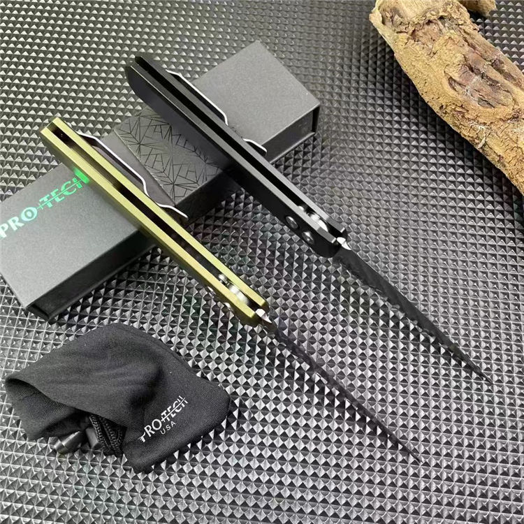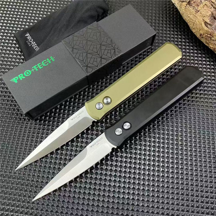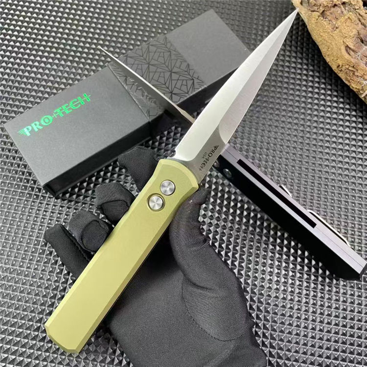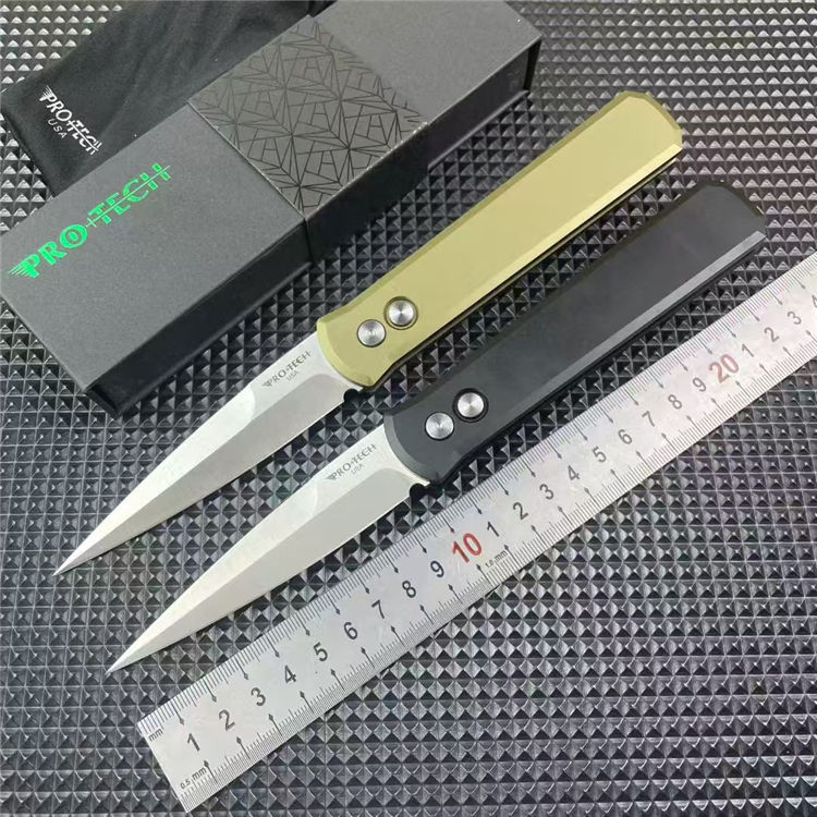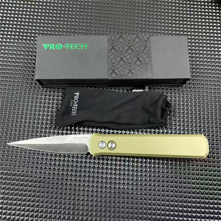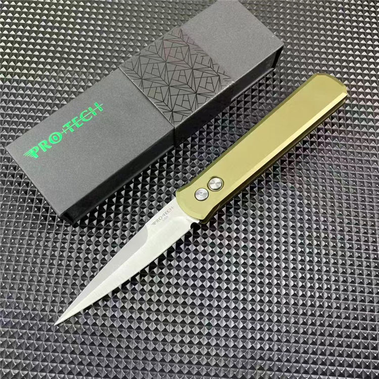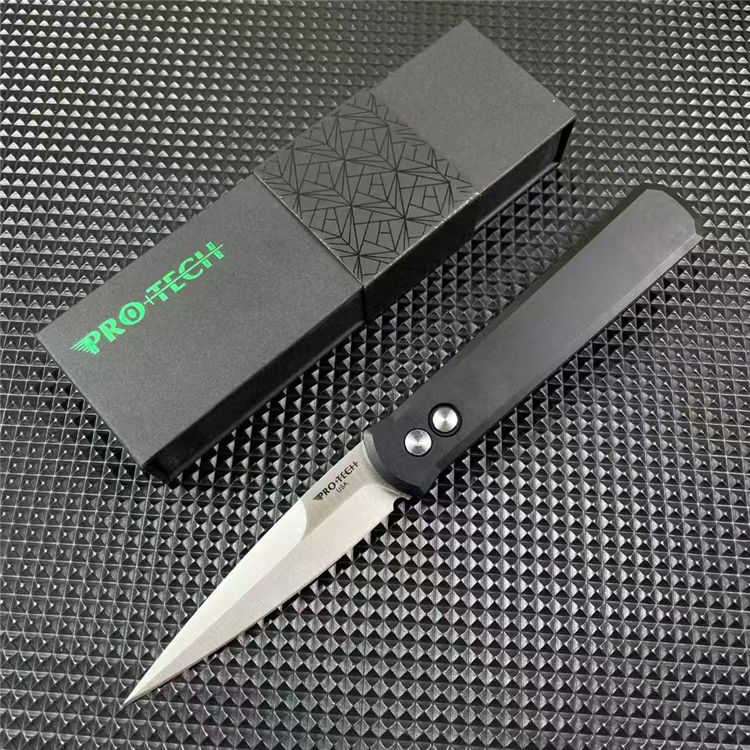 PROTECH超技术920跳刀 品牌:超技术 货号:920教父 类型:侧跳刀 全长:235mm 刃钢:154-CM深冷热处理 表面:精抛光拉丝刀刃 硬度:59-60HRC 刃厚:3.2mm 刃长:10mm 柄长:135mm 柄材及处理:6061-T6太空铝,全CNC加工 重量:约110g 喷砂背夹,彩盒包装