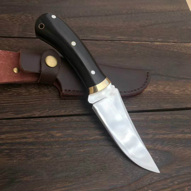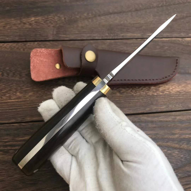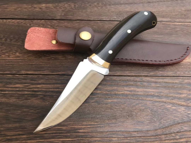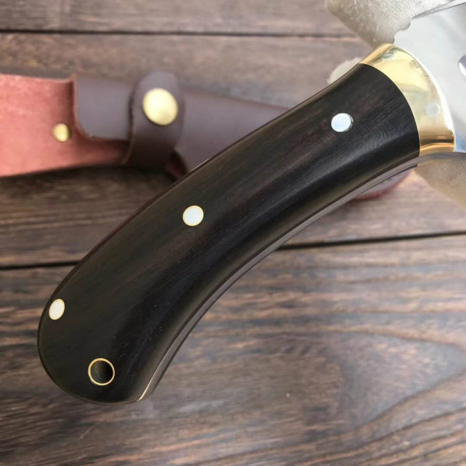 温克勒突然袭击直刀 全长:230mm 刃长:110mm 柄长:114mm 刃宽:39mm 刃厚:4.9mm 刃材:优质9铬钢 重量:500g(含包装) 硬度:58-59HRC以上 表面:镜光 柄材:黑檀木+铜 锁型:定锁 其他:配牛皮套