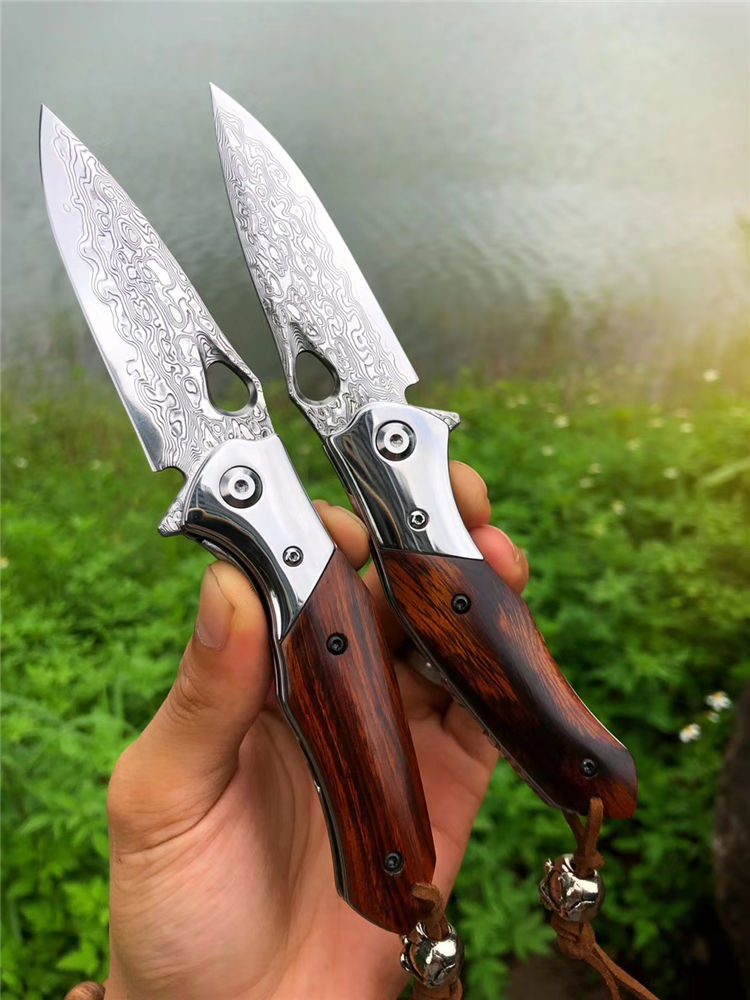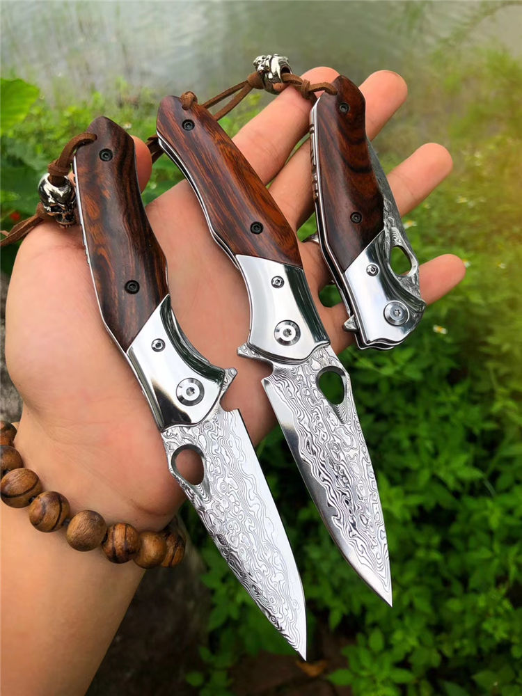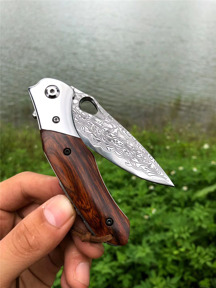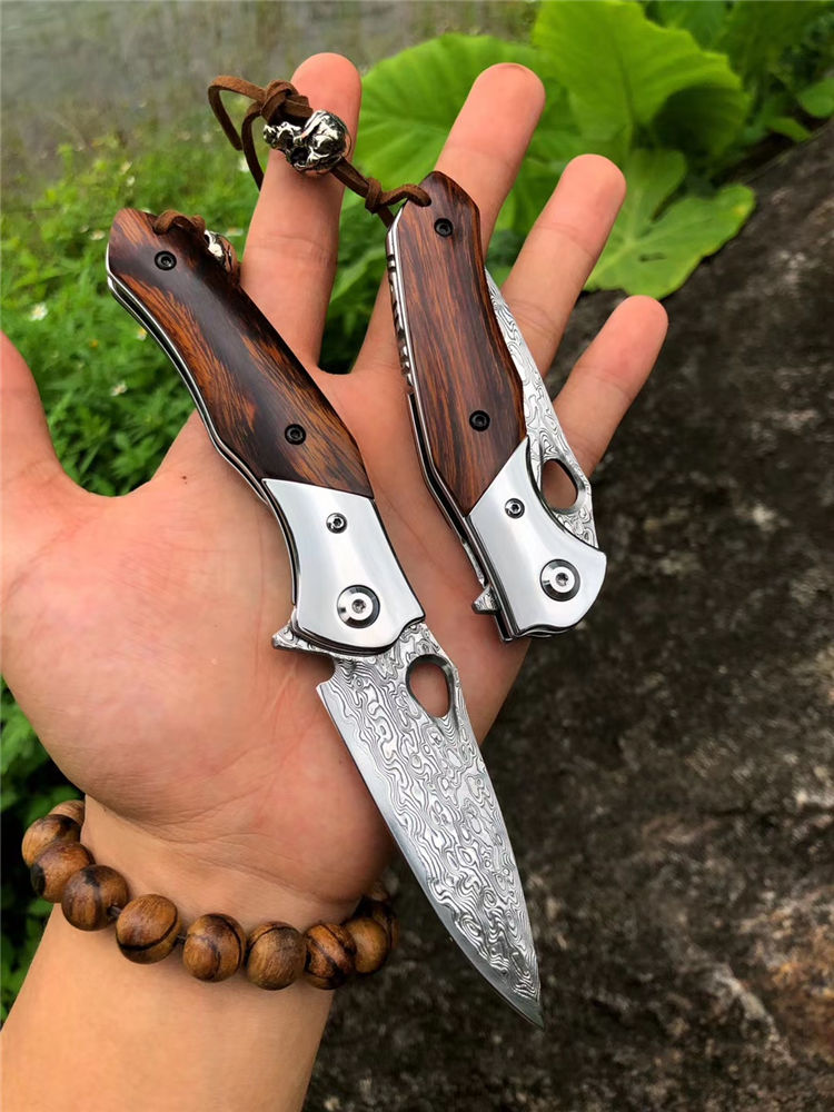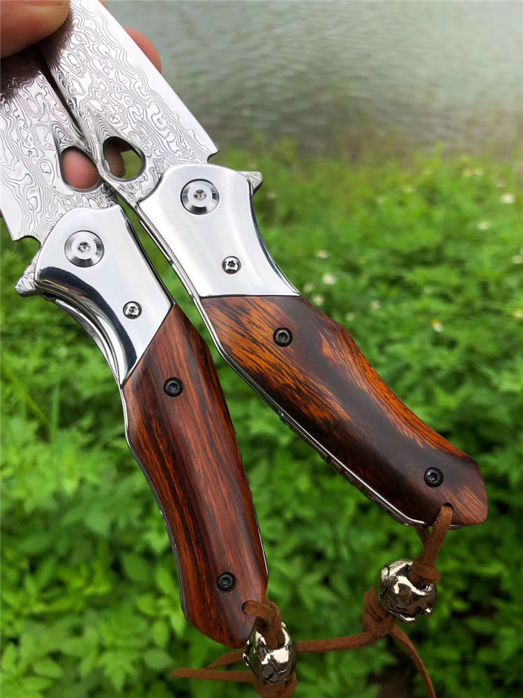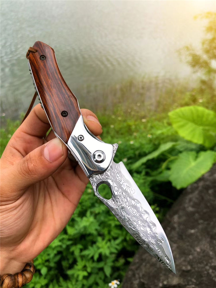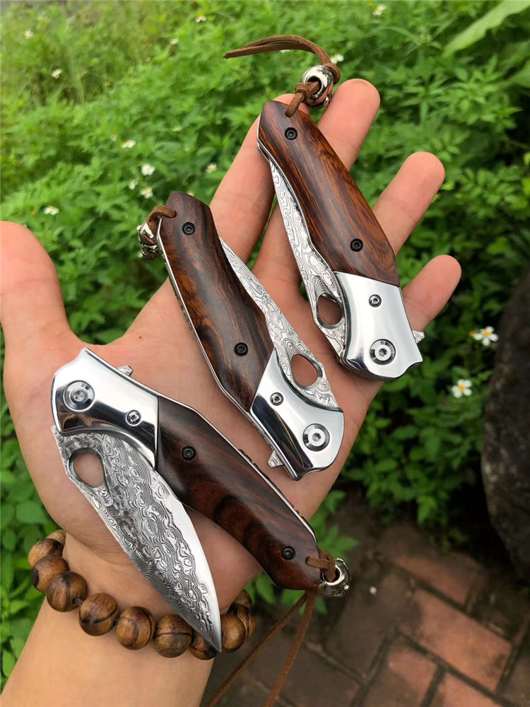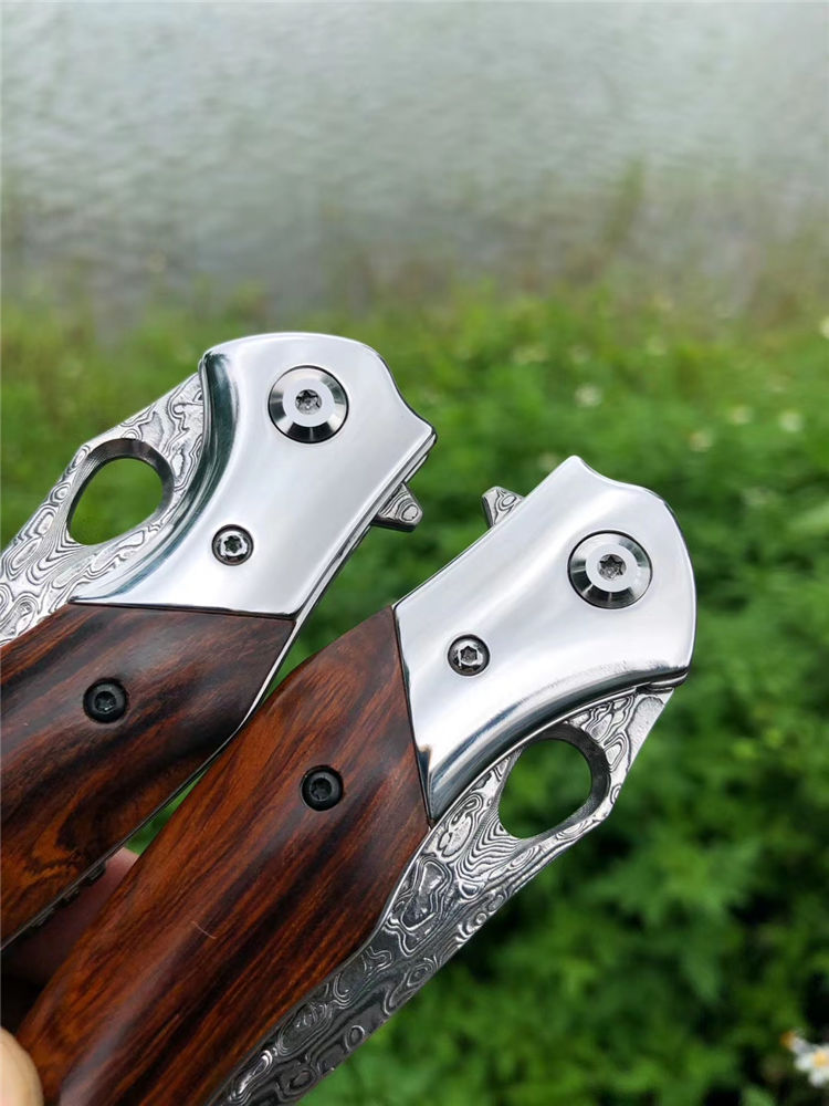 大马士革幻翅砂铁木柄折刀 总长:18.5cm 刃长:8cm 闭合:10cm 刃宽:2.2cm 厚度:3mm 刃材:进口锻造大马士革VG10钢,专业高温真空处理 硬度:60HRC 开刃方式:经二次水冷手工开刃 手柄:轴承滚珠开合+304钢头+美国砂铁木 包装:黑色手工小盒
