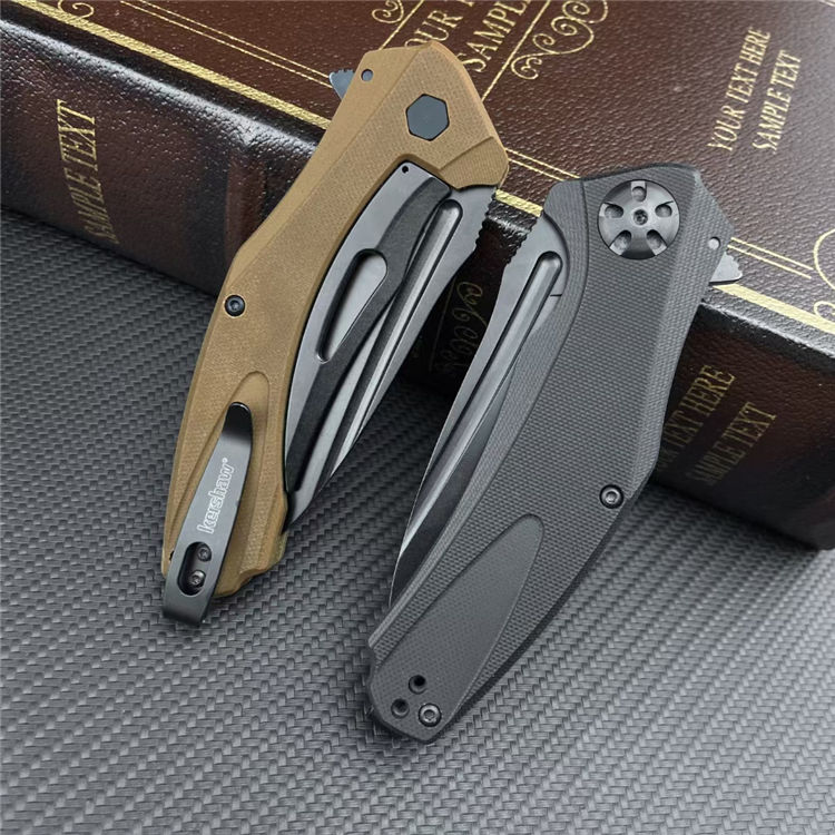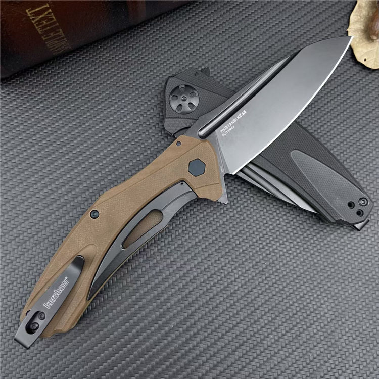 卡秀7008折刀 刃材:8Cr13MoV钢 柄材:G10+不锈钢体 全长:22.2厘米 刀片长:9.5厘米 闭合长度:12.4厘米 刃厚:3.1毫米 刀片表面处理:镀黑涂层 硬度:58HRC 刀净重:118克