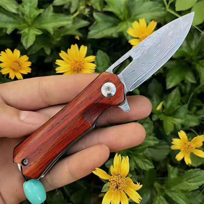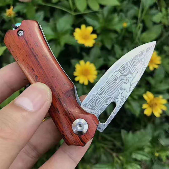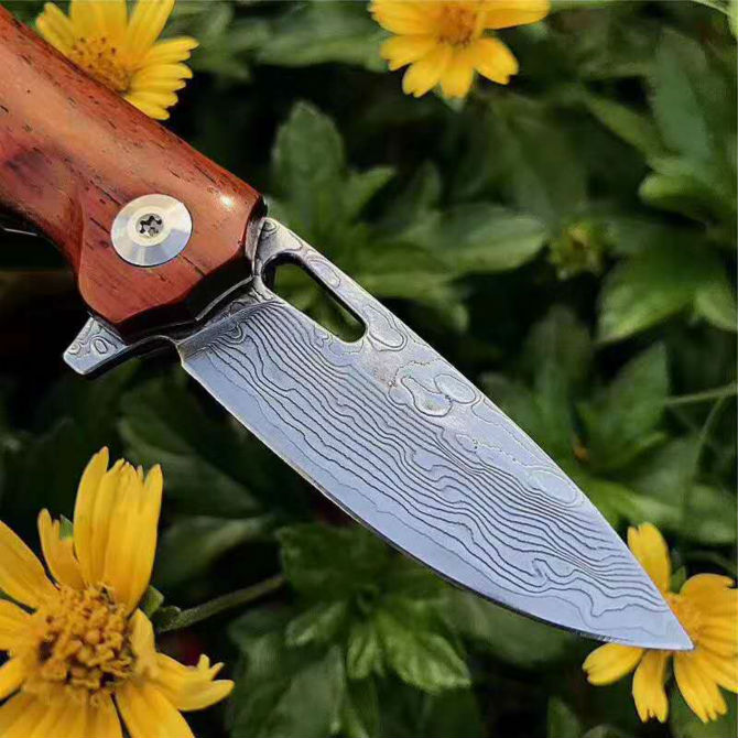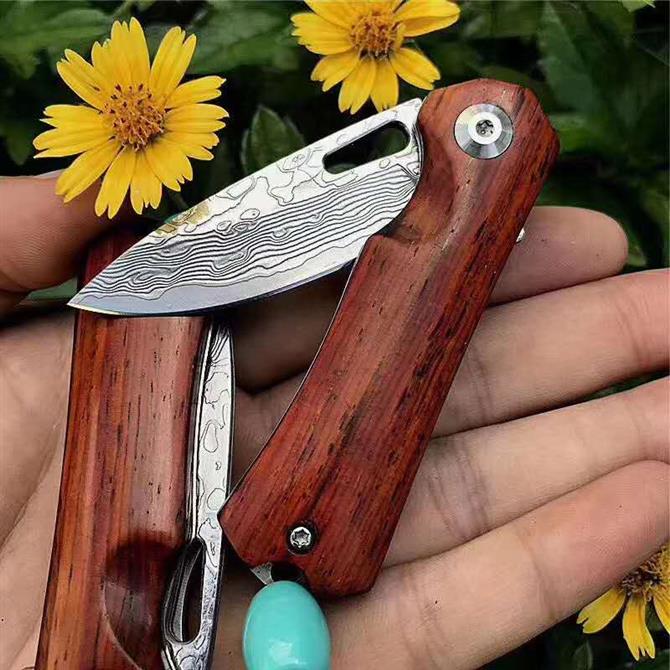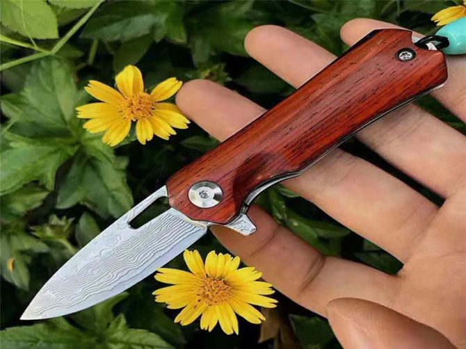 大马士革小鳄鱼折刀 总长:13.2cm 刃长:6.1cm 刃宽:1.8cm 刃厚:2.4mm 柄长:7.1cm 钢材:夹钢大马士革 柄材:微粒黄檀+钛合金背骨 包装:手工黑盒
