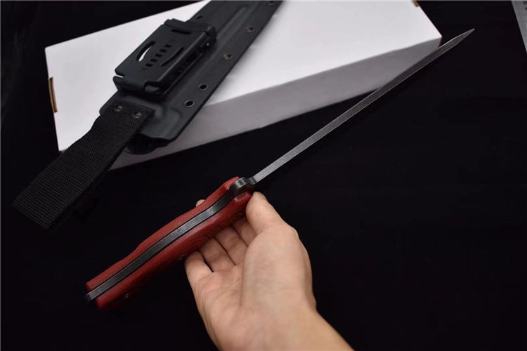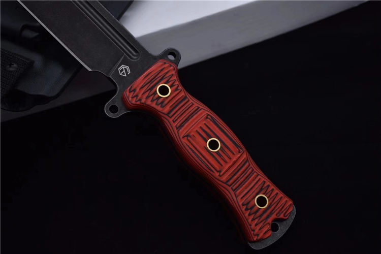 2020定制款黑色款升级版轻骑兵直刀 全长:333mm 柄长:138mm 刃长:195mm 刃厚:6.0mm 刃宽:42mm(最宽处) 刃材:DC53;如假包换 重量:500g(刀净重,不含鞘) 硬度:61HRC真空热处理 柄材:进口橙黑夹层G10 刀鞘:美国进口Kydex(两边加钉坚固) 开v方式:数控V精磨 表面处理:玻璃珠喷砂;防刮透明镀烙效果 热处理:真空油淬(增加晶体颗粒细腻度,具有最好的韧性) 包装:黑色礼品盒