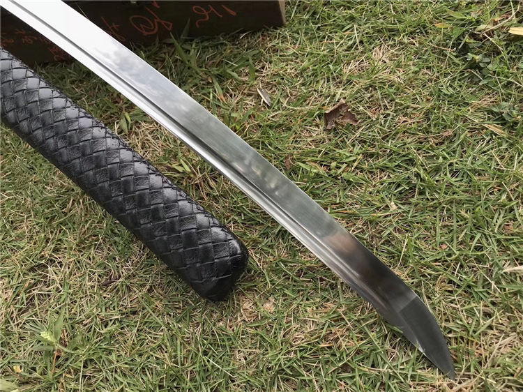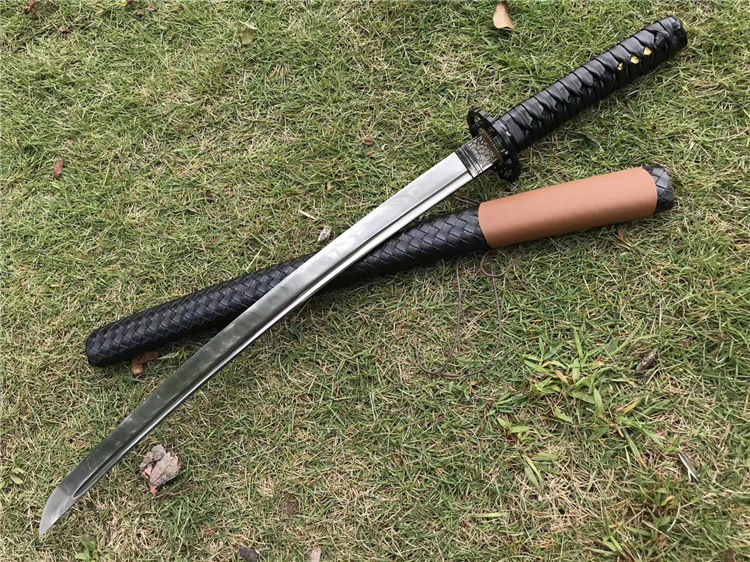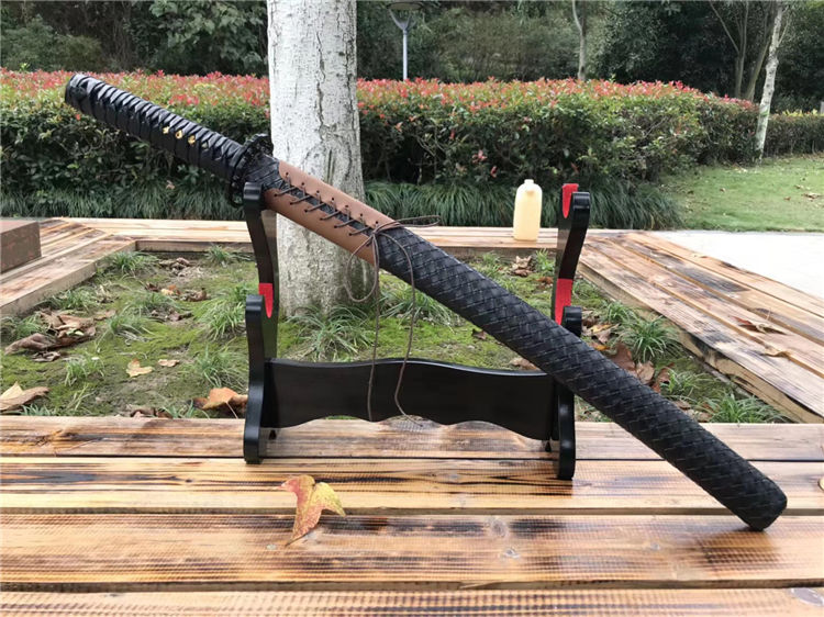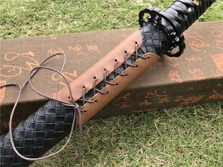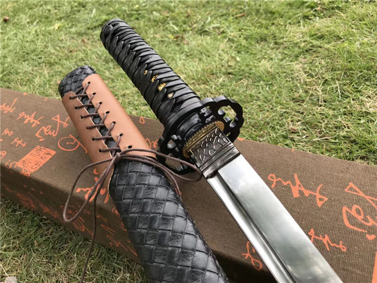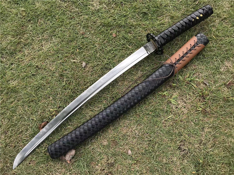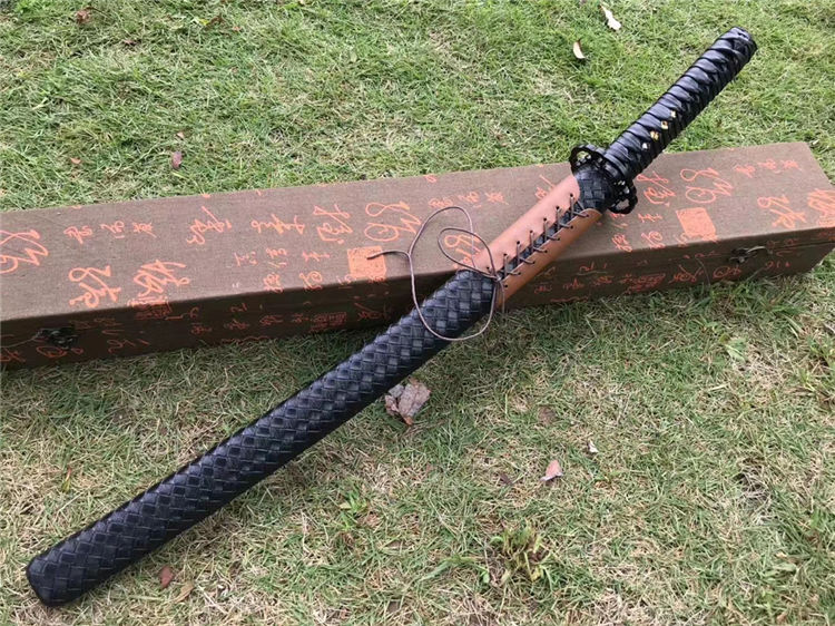 天邪胁差武士刀 全长:78cm 刃长:52cm 柄长:23cm 刃宽:3.2cm 材质:弹簧钢 配高端锦盒,实木鞘外套皮