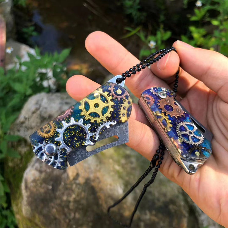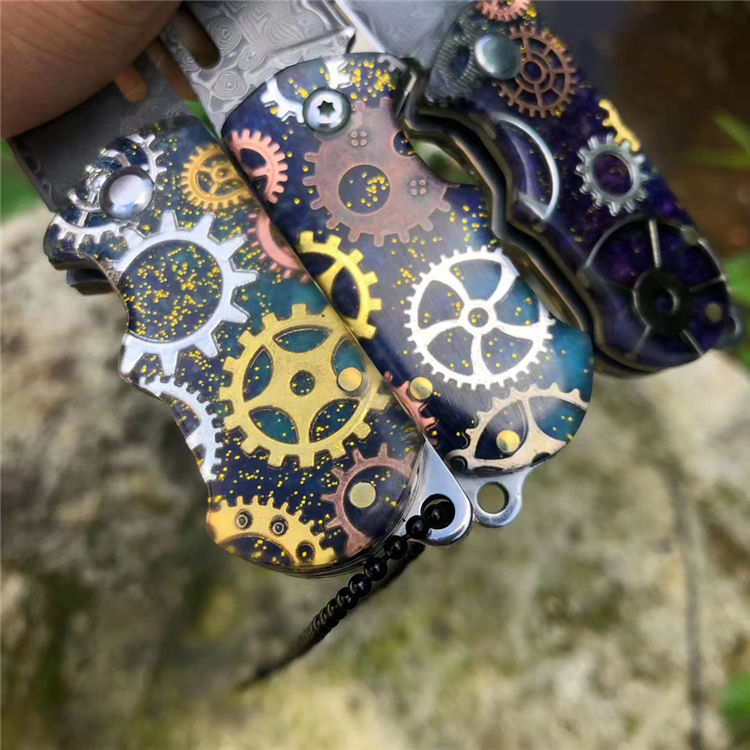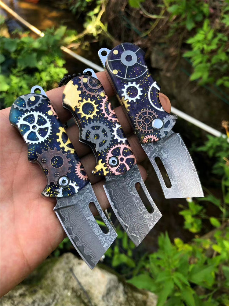 大马士革梦幻小齿轮折刀 总长:10cm 刃长:4cm 折合长:6cm 厚度:3mm 宽度:2.3cm 钢材:大马士革钢 硬度59HRC 柄材:钢头扎模图案+ 真齿轮拼接亚克力材料一体融合