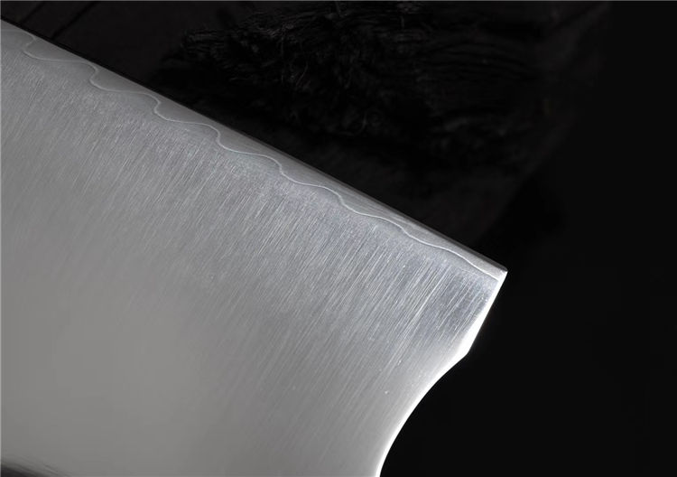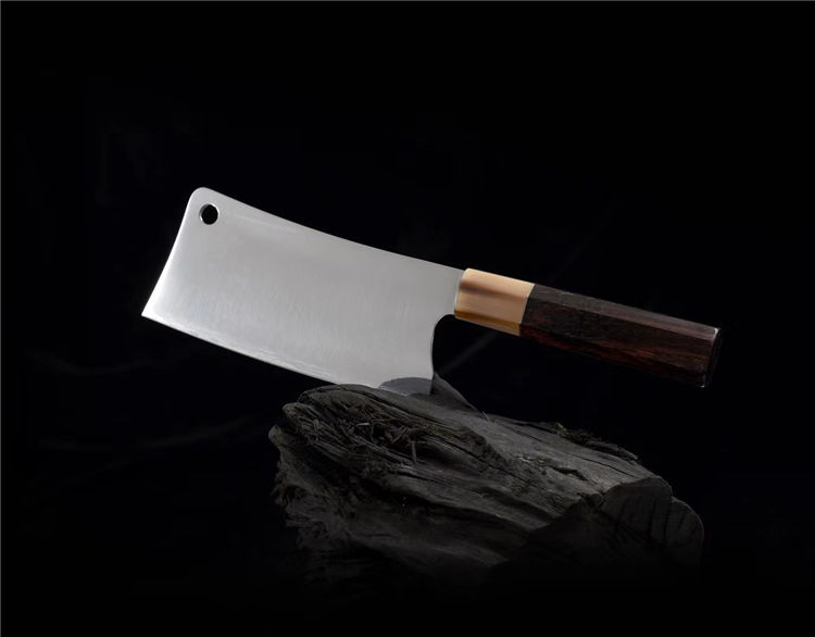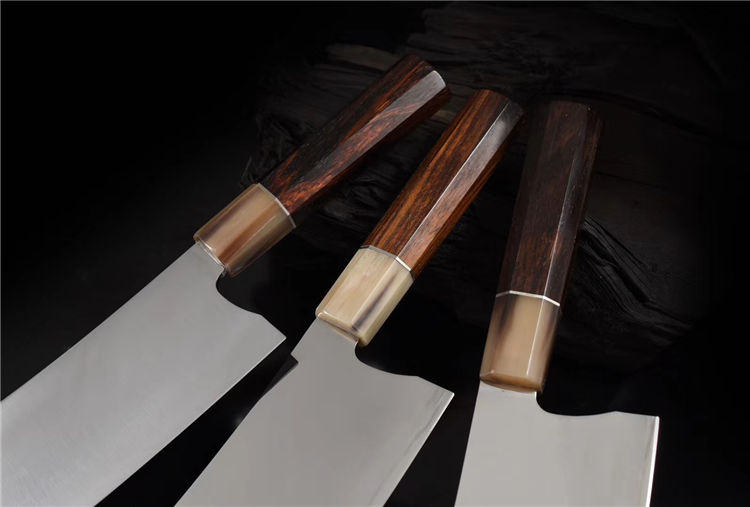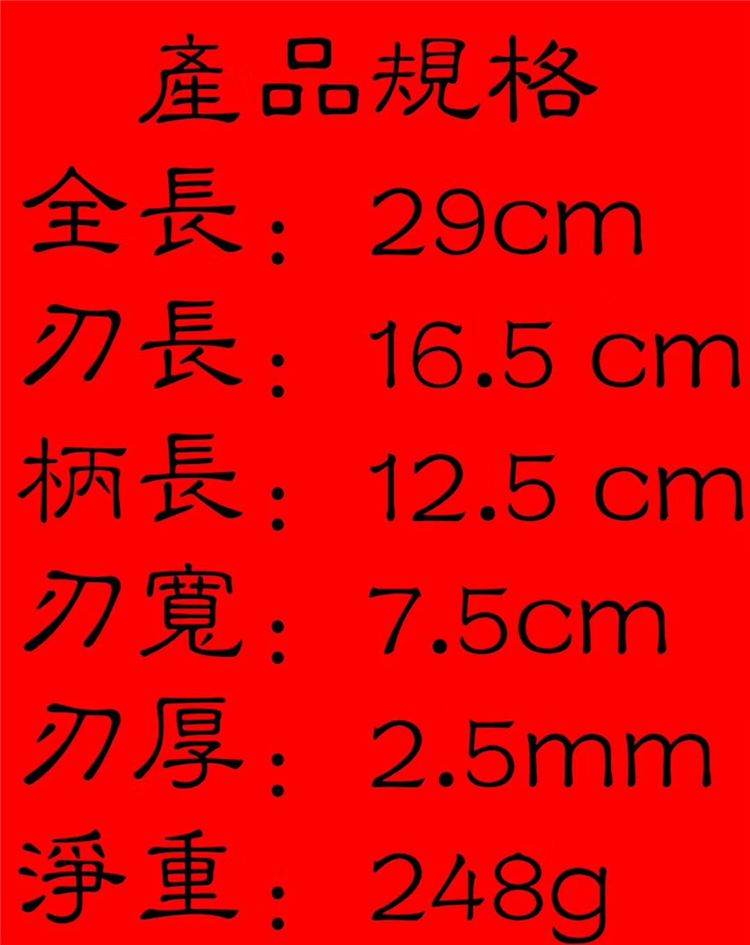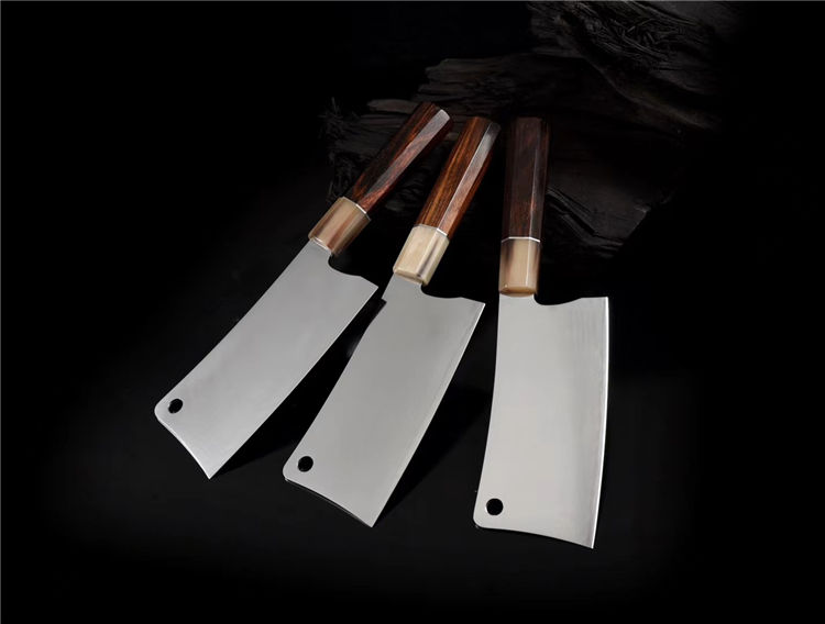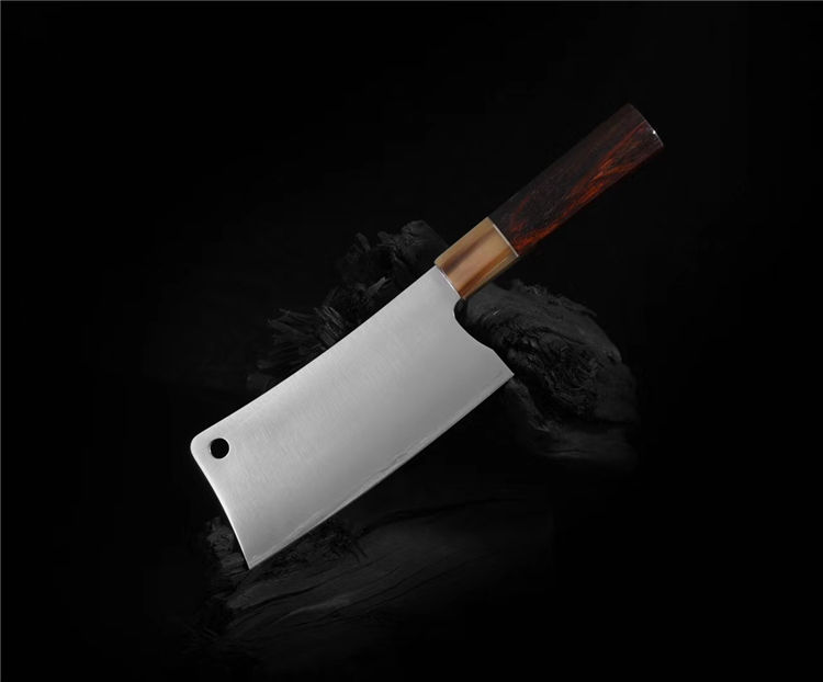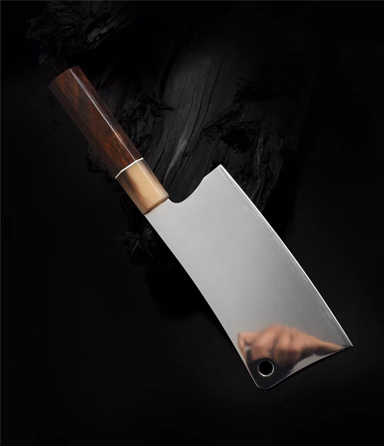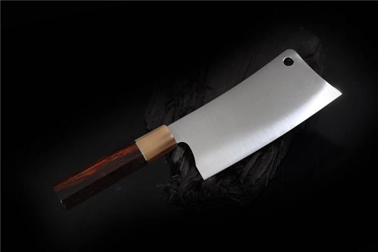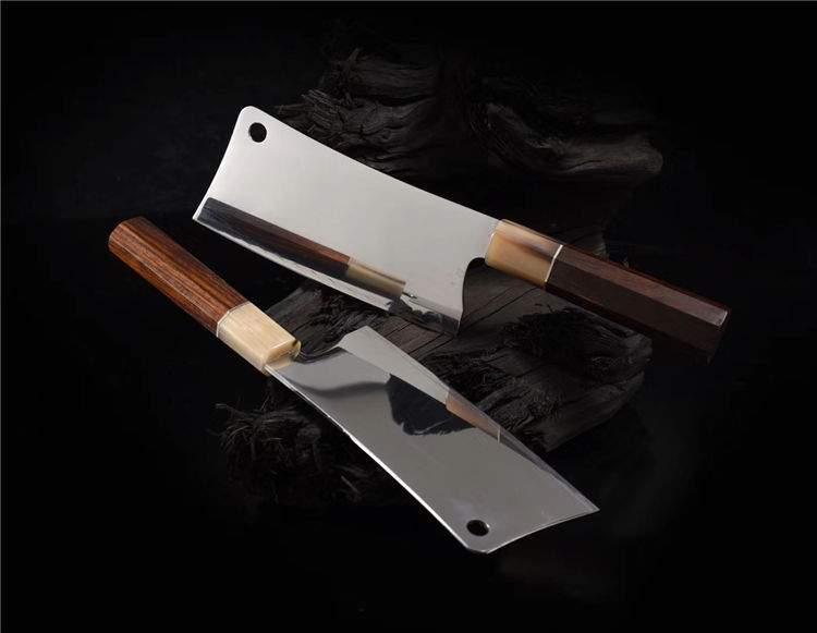 纯手工斩切厨刀 锋利无比、永不生锈、斩切两用 工艺:真空热处理硬度58~60HRC 装具:无 刃材:三枚禾夹钢 柄材:白牛角、红酸枝 鞘材:无 赠品-高端锦盒、布