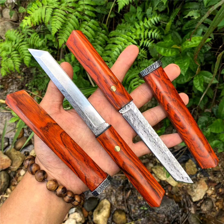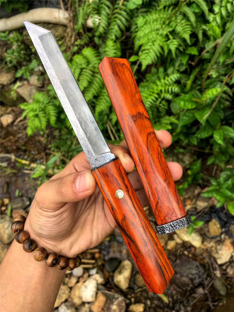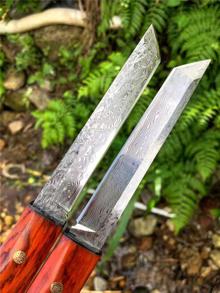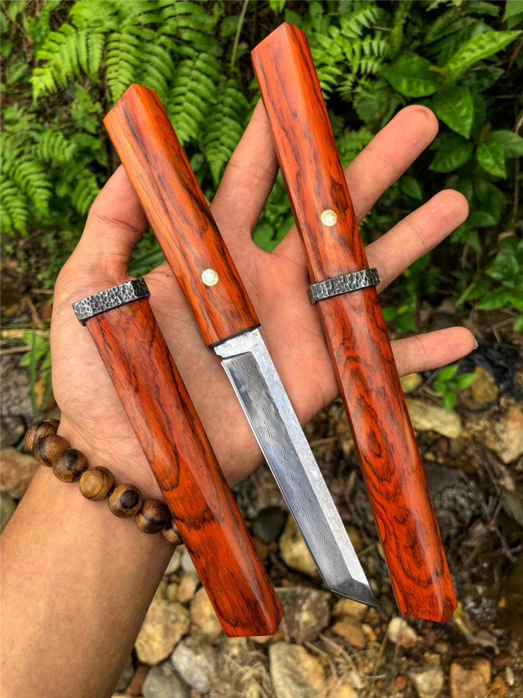 大马士革藤野武士刀 总长:23cm 刃长:11.7cm 柄长:10cm 刃宽:1.8cm 刃厚度:3.5mm 钢材:大马士革钢(72层) 硬度:60HRC,真空热处理,手工二次开刃 柄鞘:微粒黄檀木制作 包装:黑色手工盒