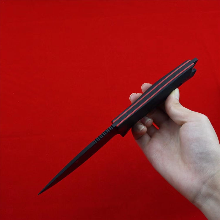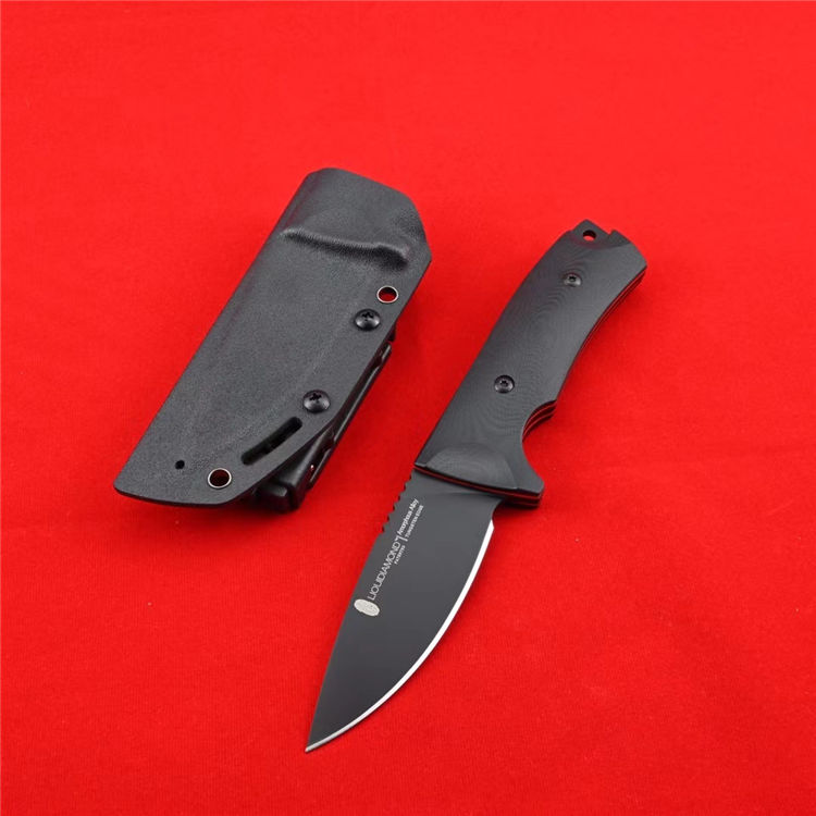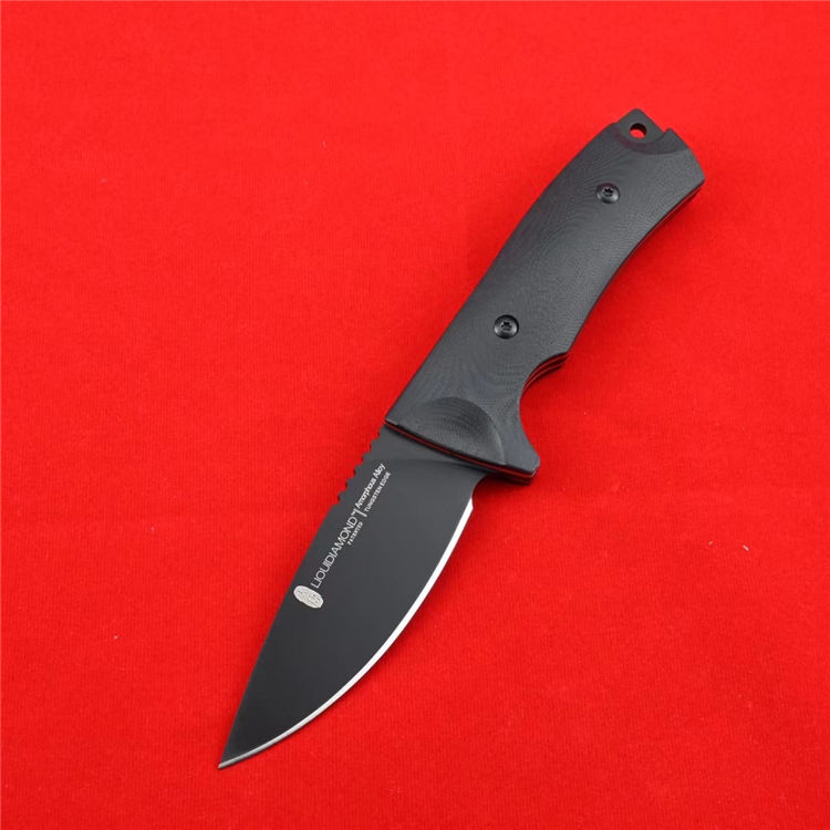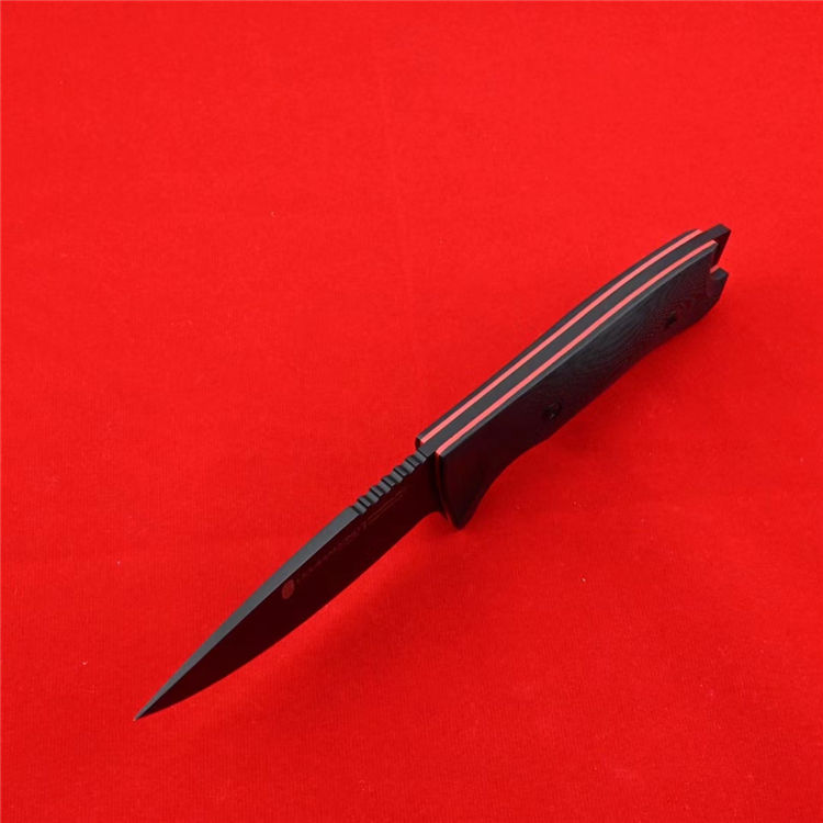 大唐直刀 全长:225mm 刃长:100mm 刃宽:35mm 刃厚:4.8mm 柄长:125mm 刃材:日本进口VG10 硬度:60RHC 表面效果:镀工业硬烙黑色納米技术防刮涂层 柄材:手柄双色G10 表面:CNC曲面狐度加工 开V,精准数控水磨大平磨开V 开刃方式:二次开刃 净重:220克 包装:精美包装合子