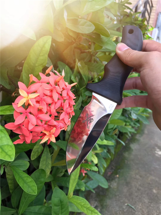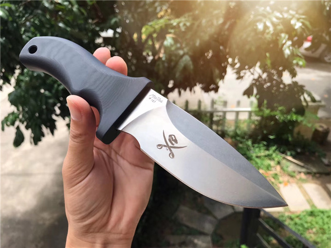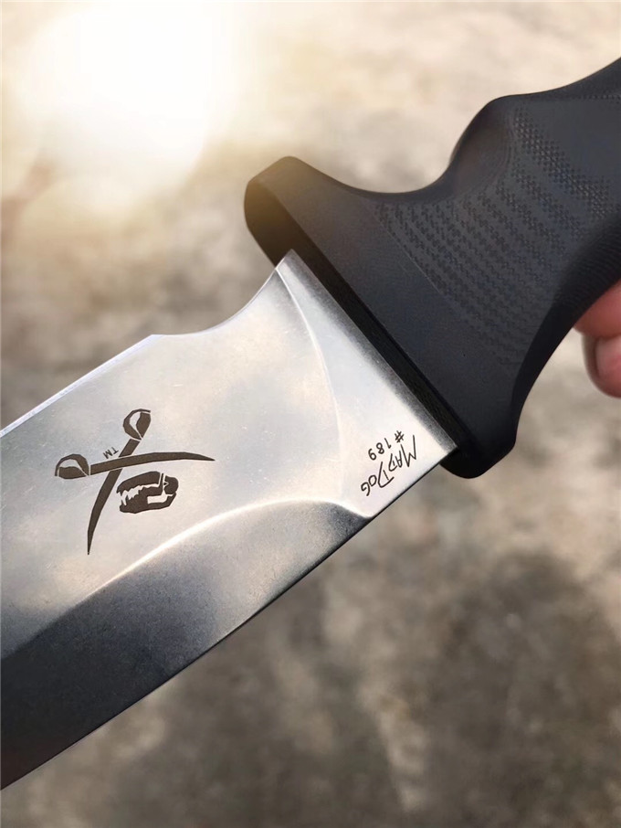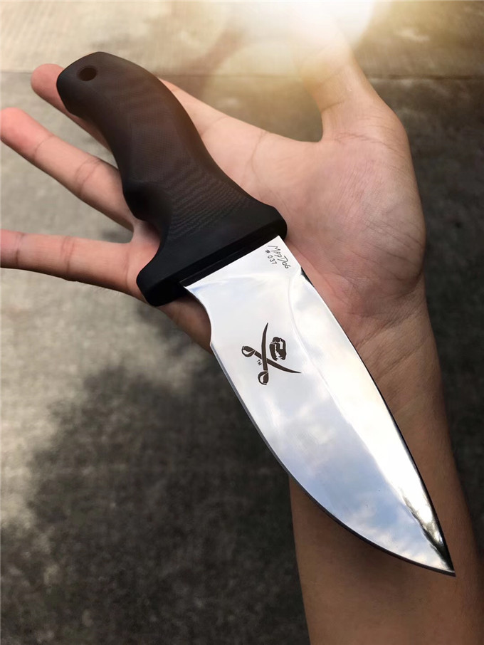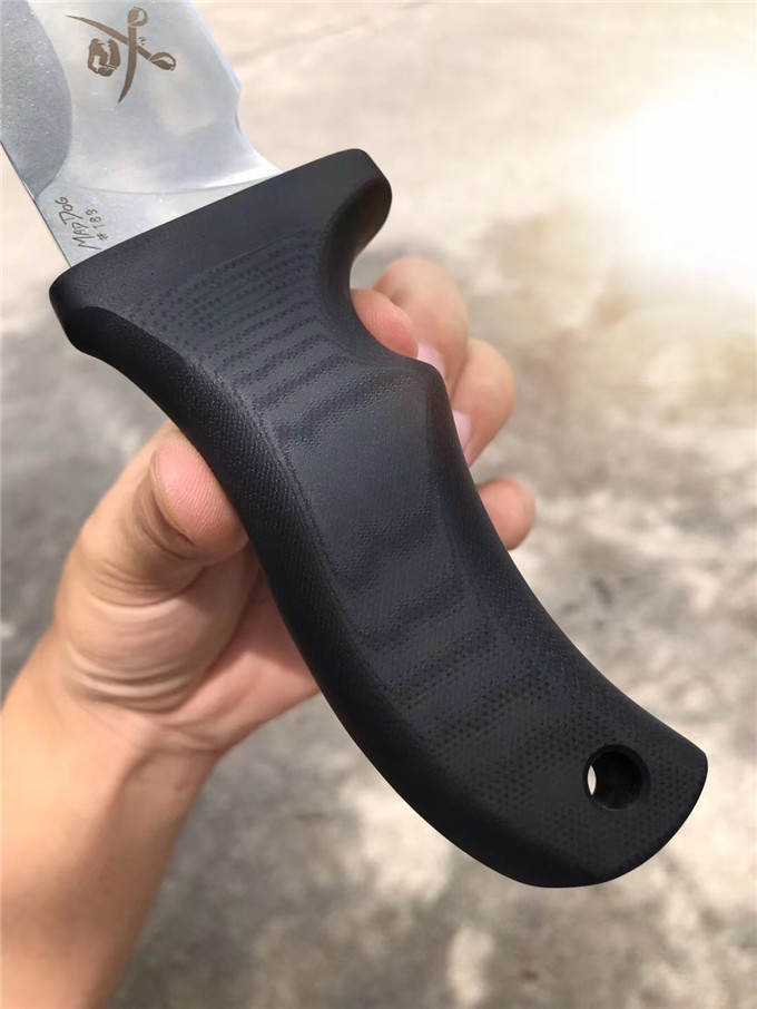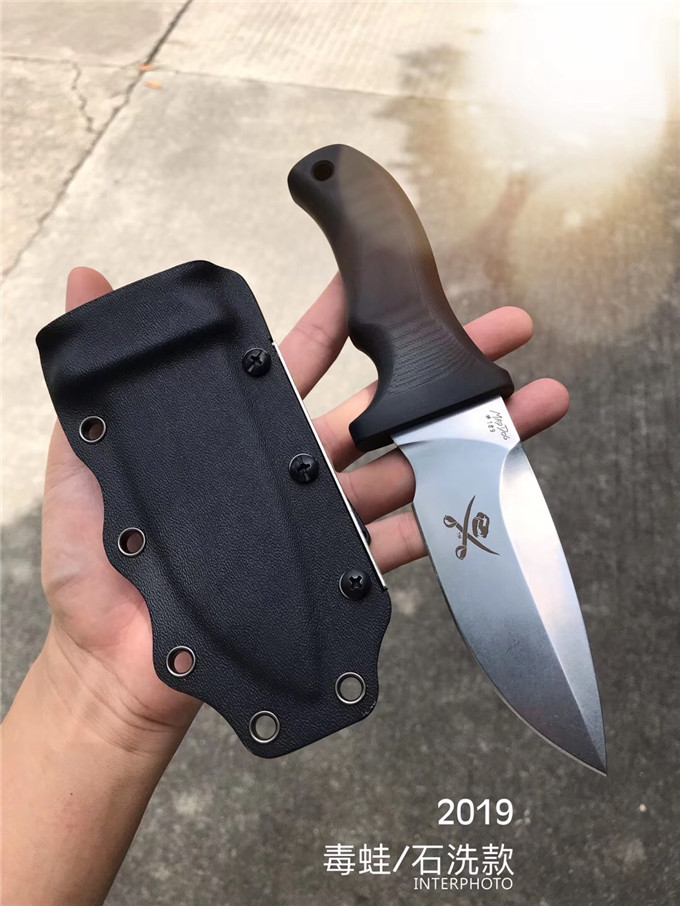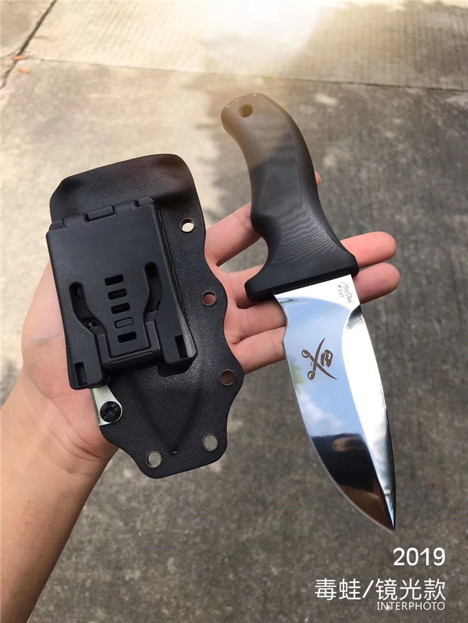 疯狗毒蛙直刀 全长:22.4厘米 刃长:9.5厘米 刃厚:4.5毫米 钢材:贸易公司提供A2钢材,真空深冷热处理工艺,韧性硬度保持性超级好 硬度:60-62HRC 柄材:黑色G10,手感超好 刀片最宽处:4厘米 刀净重:245克,含鞘共350克 包装:牛皮硬纸盒