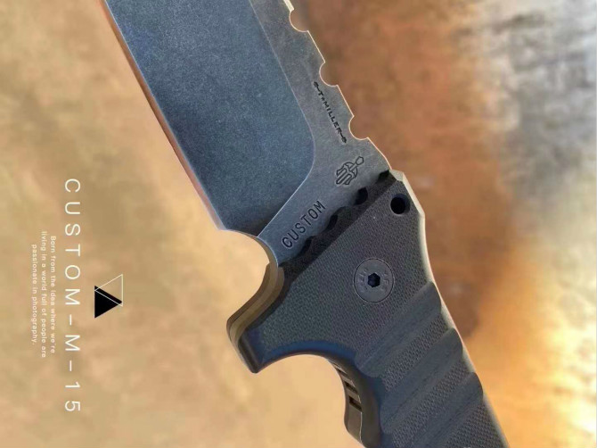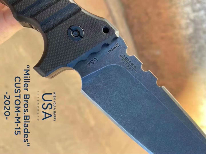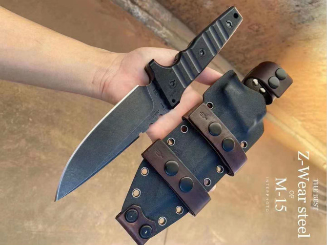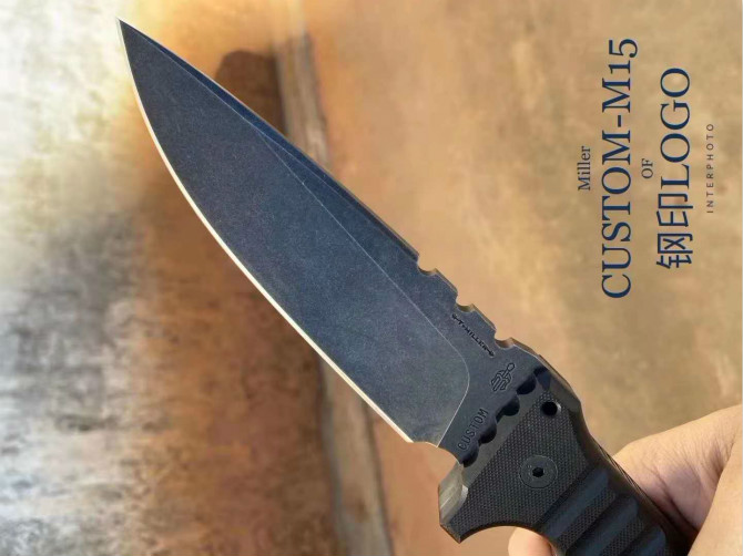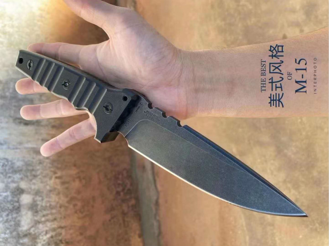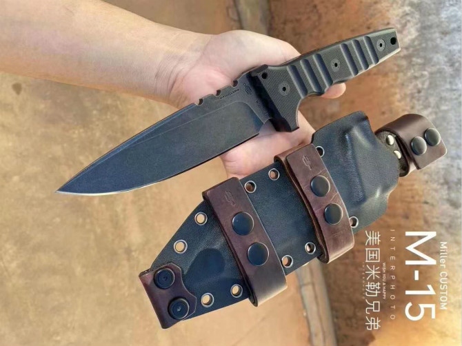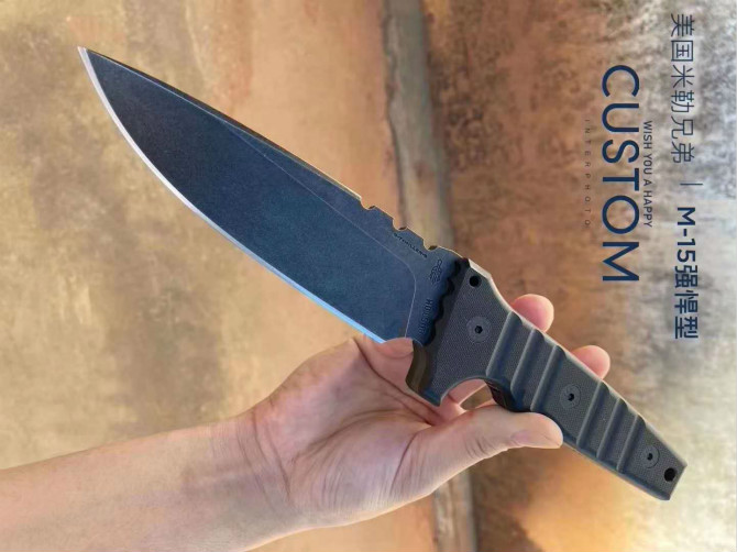 米勒暴力直刀 型号:CustomM-15合作量产款 钢材:Z-WearPMSteel 硬度:60-62HRC 热处理:专业真空深冷让处理油淬 总长:29.2cm 刃长:14cm 厚度:7.1MM 刃宽:4.3cm 柄材:G-10 表面效果:黑石洗与迷彩石洗钢印LOGO 刀鞘:进口2.5厚K鞘+进口意大利手工制作植鞣皮 包装:黑色手工盒子(合作代工出口版简包)