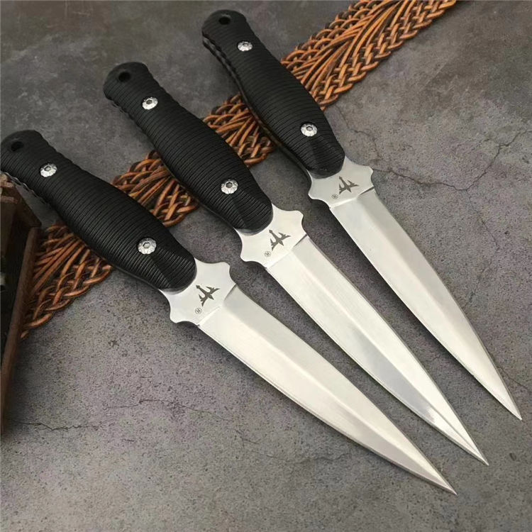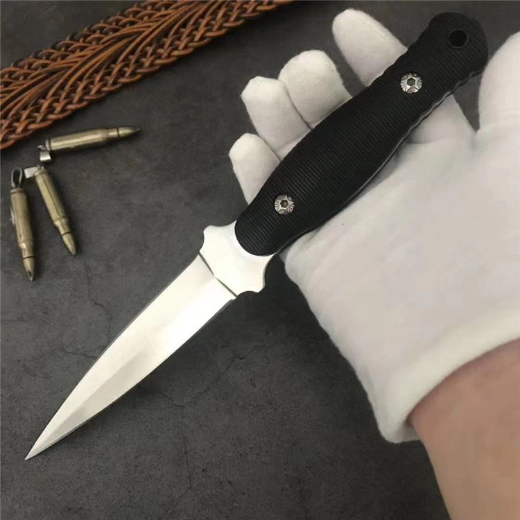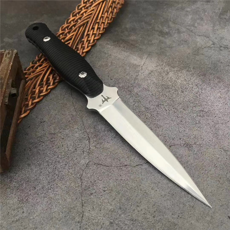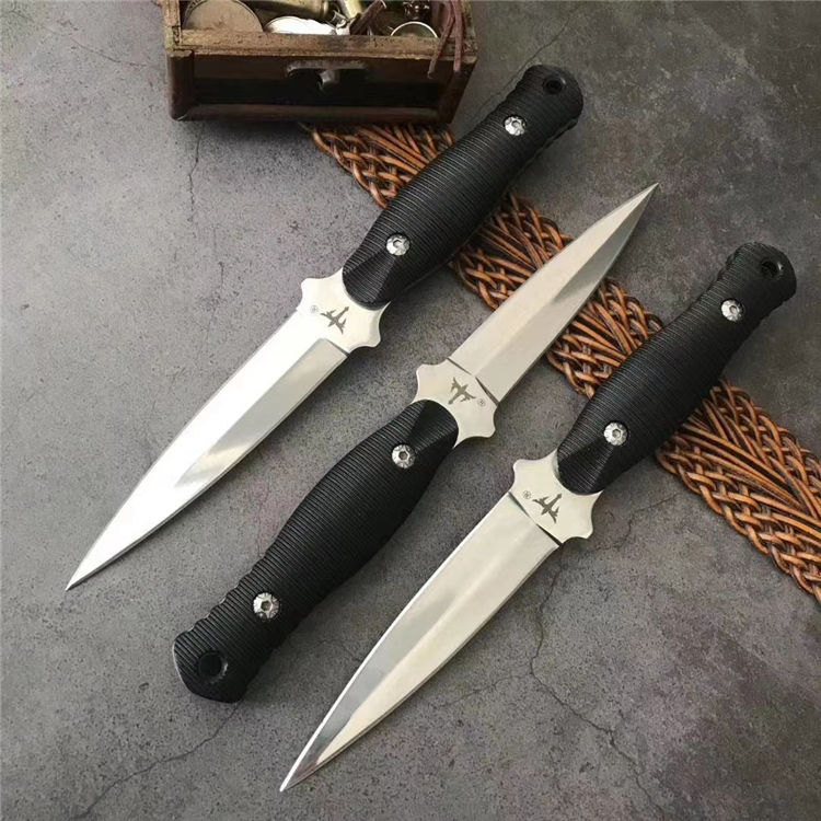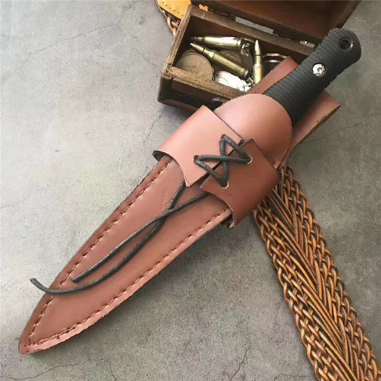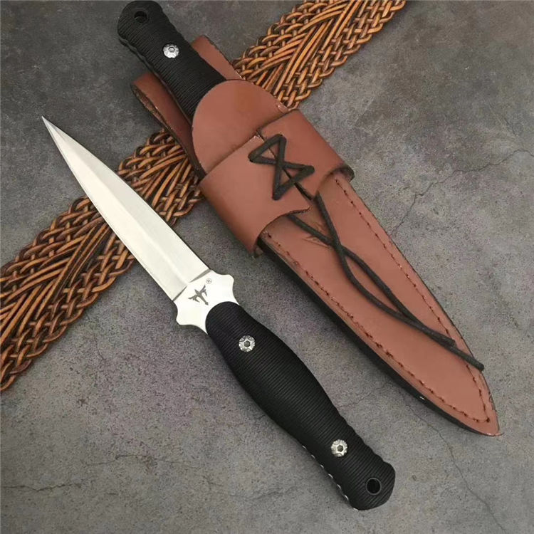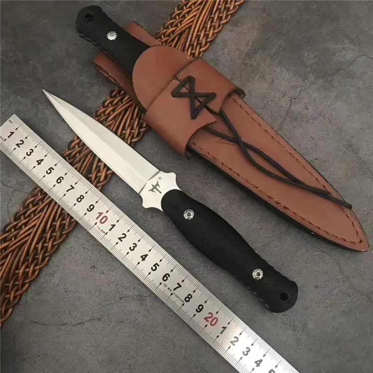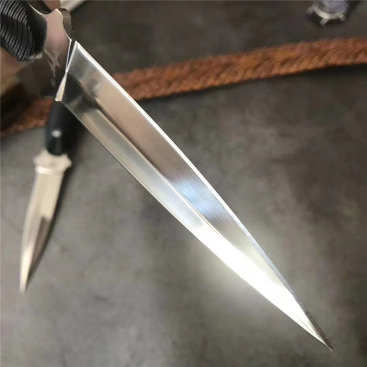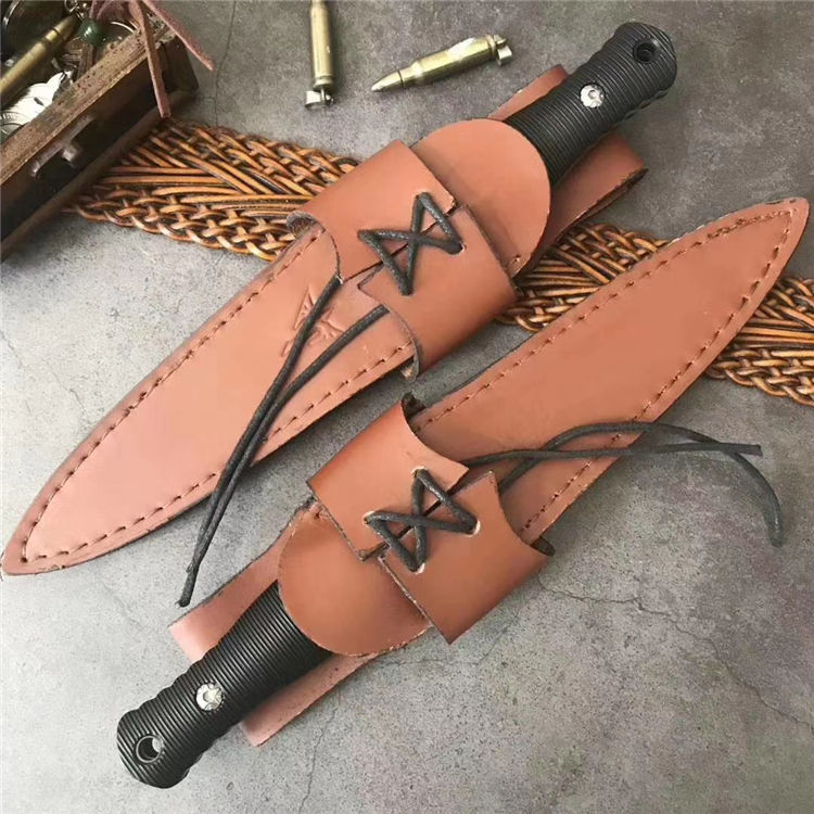 狼瑔虎牙双刃直刀 全长:23.5cm 刃长:10.5cm 刃宽:23cm(最宽处) 柄长:11cm 刃厚:0.3cm 刃材:440 硬度:58RHC 表面:镜光 柄材:ABS 重量:178克(含套) 刀套:皮套产品 特点:一体双刃