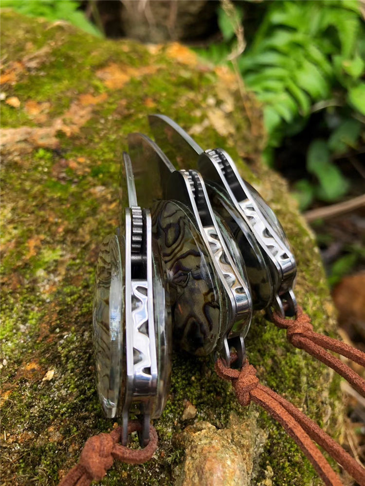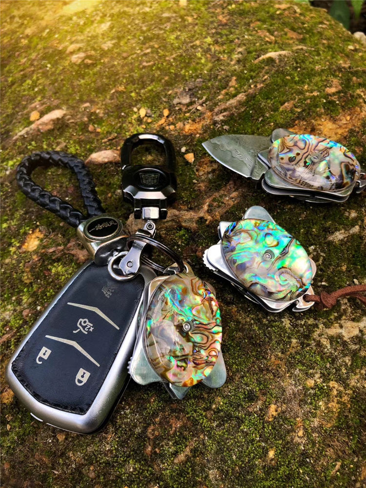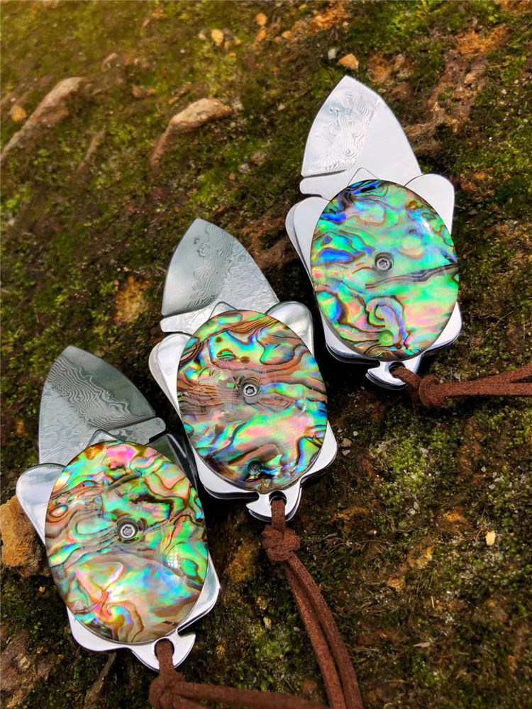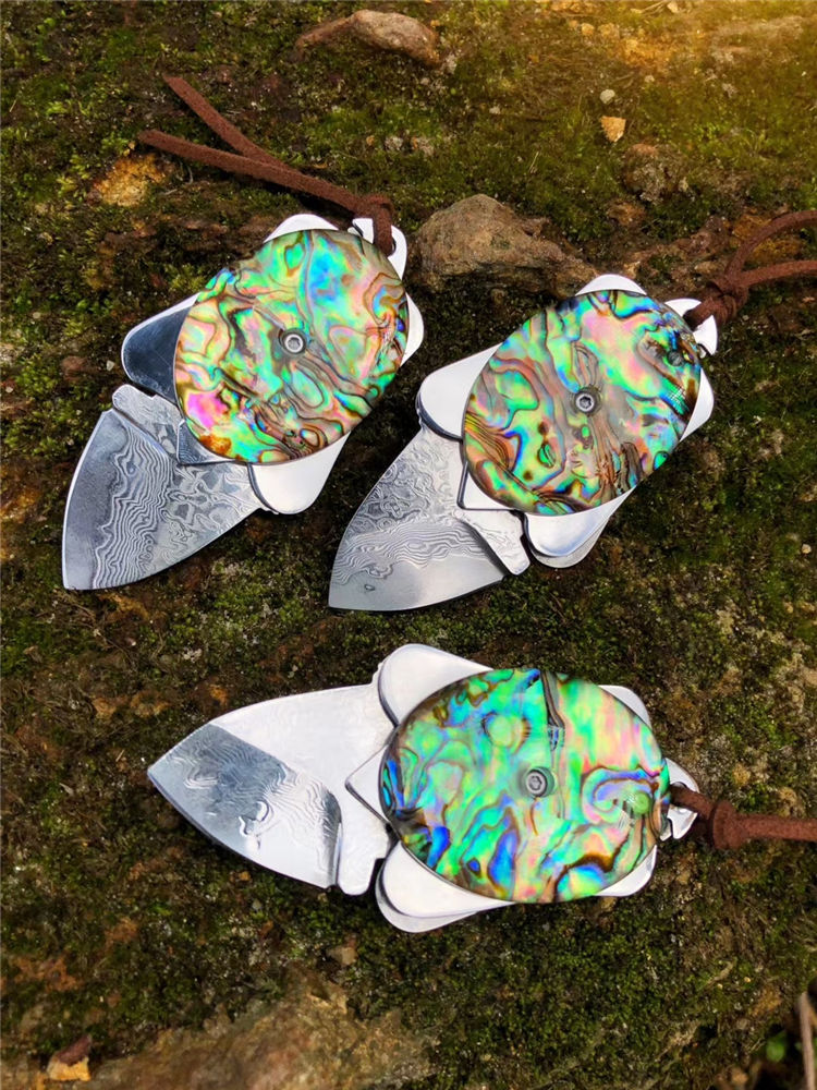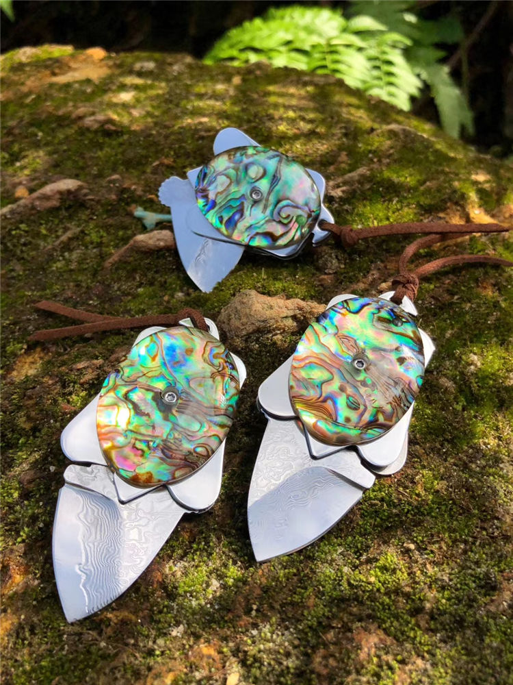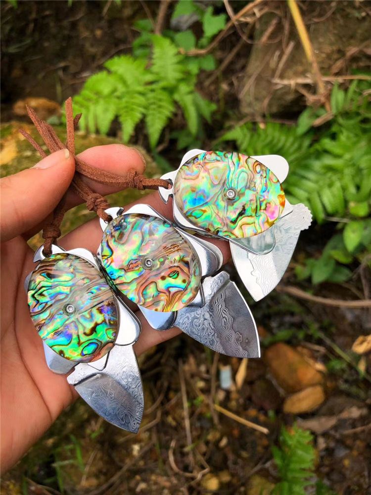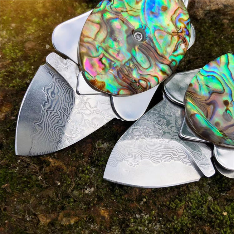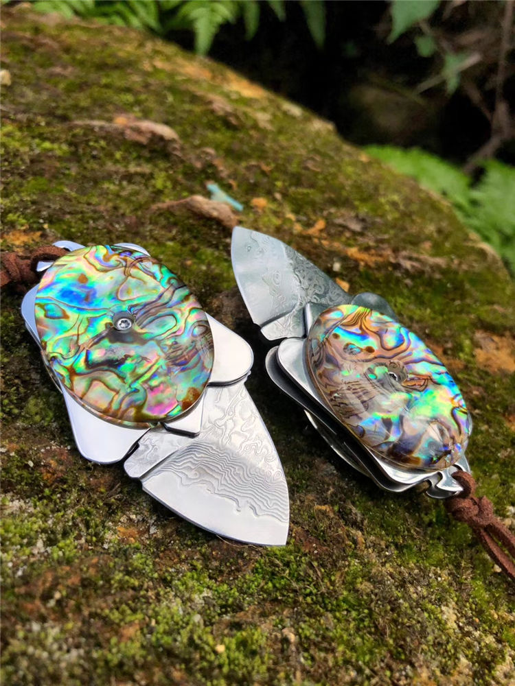 大马士革如意宝折刀 总长:8cm 刃长:3cm 折合长度:5cm 钢材:大马士革vg10钢 刃厚:2mm 刃宽:2.7cm 硬度:59HRC 柄材:天然鲍鱼贝壳制作 包装:黑色小硬盒
