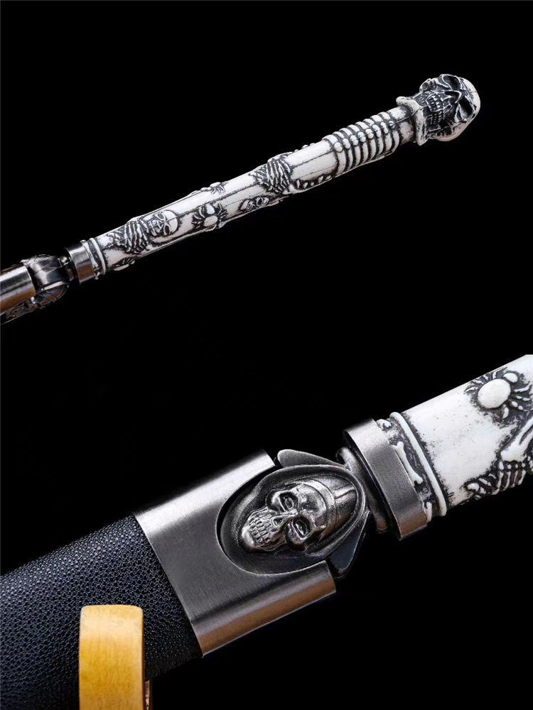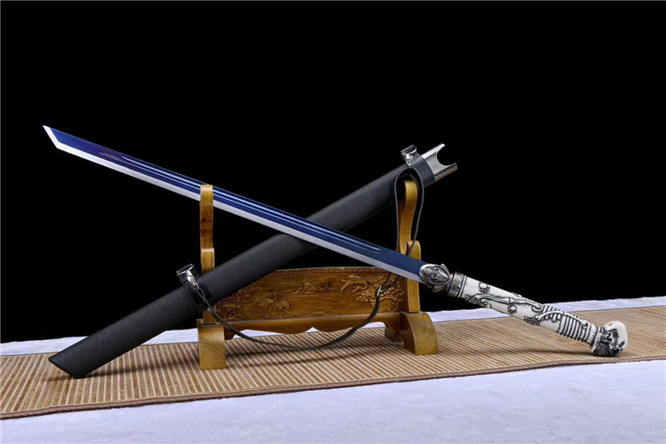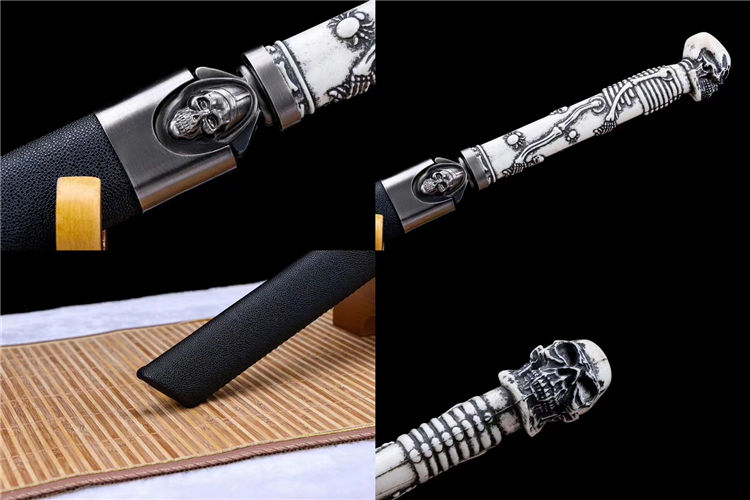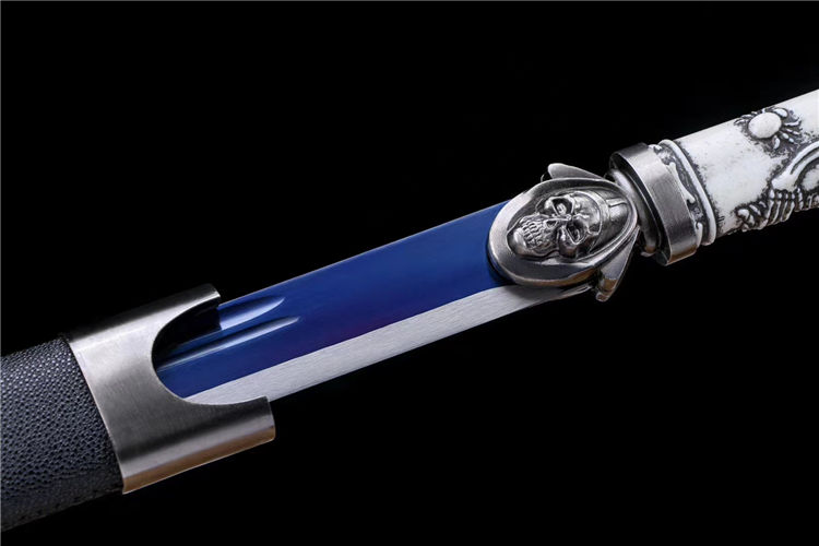 鬼头斩唐横刀 刃材:极限锰钢手工锻造、双血槽设计、烤蓝、刃厚将0.7cm改为0.4cm、使得性能上得到了前所未有的突破 装具:独家鬼头套装《独一无二》 柄材:独家鬼头柄设计《镀磨砂白带黑》 鞘材:珍珠鱼皮鞘《赠背带》 适合:收藏 防身 情侣配送 乔迁送礼 武术健身 精美摆设 赠品:精美锦盒、护理油 性能:锋利度极高、轻松横扫一排水、韧性可达90度、硬度高达60HRC 工艺:刀身千锤百炼、经打胚、热锻、铲、锉、磨、热处理(淬火)回火、初修、精修、等龙泉古法数十道手工制作而成