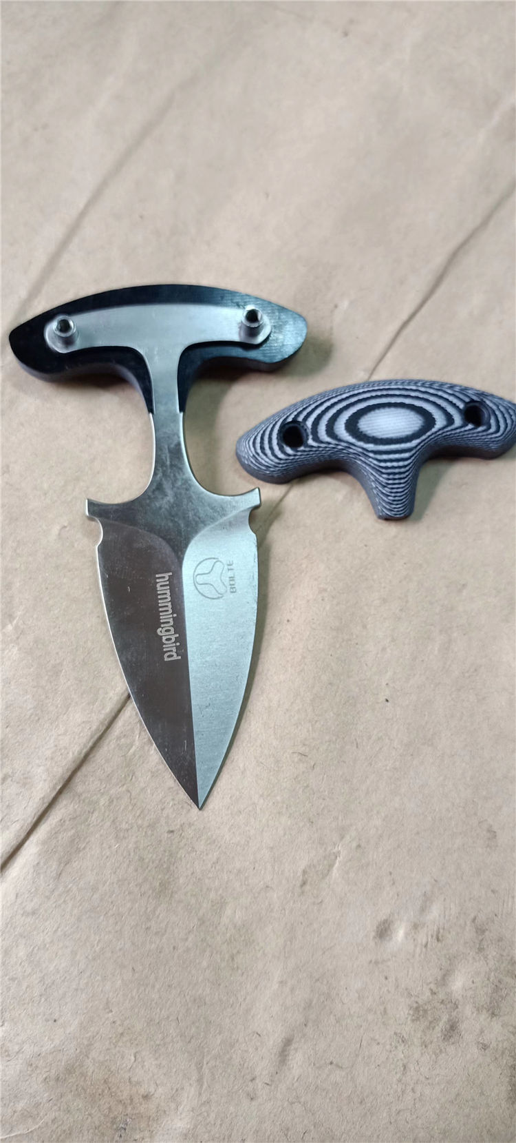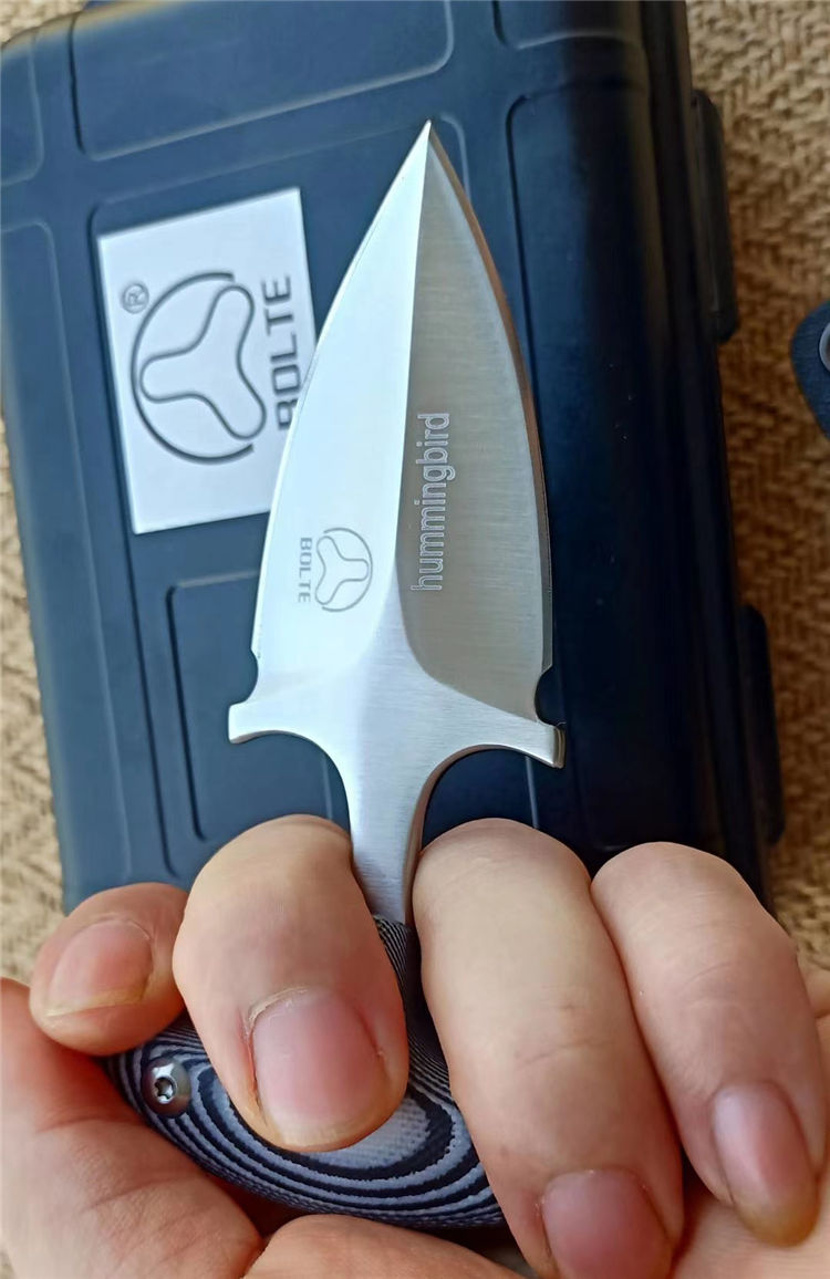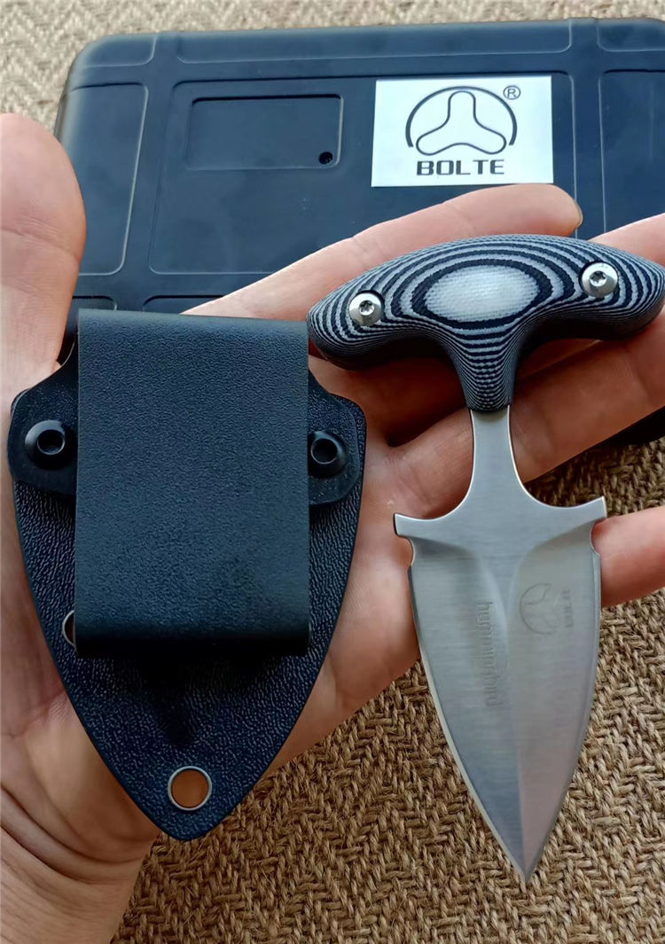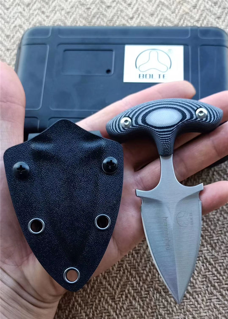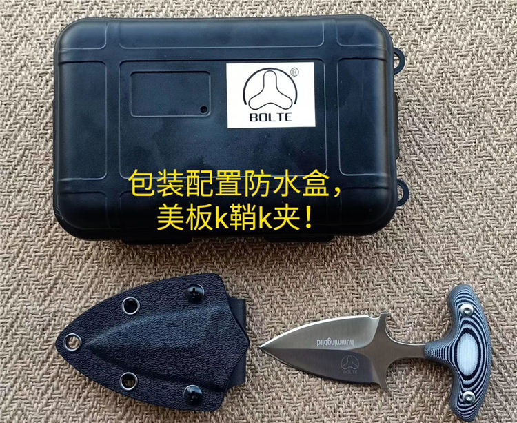 博尔特蜂鸟手刺 全长:118mm 刃长:56mm 柄长:50mm 刃厚:3.9mm 刃最宽处:35mm 刃材:进口瑞典山特维克14c28n钢(线切割开料) 硬度:61+-1HRC 热处理:真空淬油热处理 柄材:黑色G10+定制加固螺丝钉 刀鞘:美国进口板料制作K鞘+带K夹 净重:80g 刃面:凹磨,平面幼拉丝处理,刃线立体感超强 类型:以锋利度,韧性保持度最出色 包装:黑色防水盒