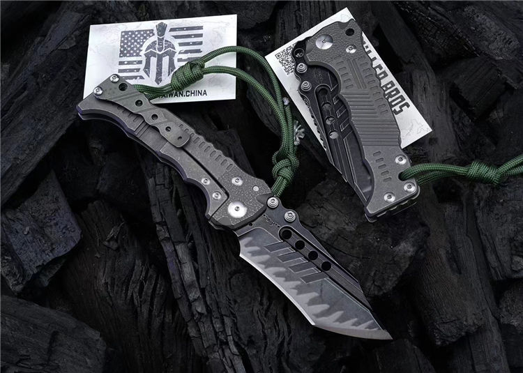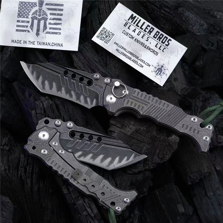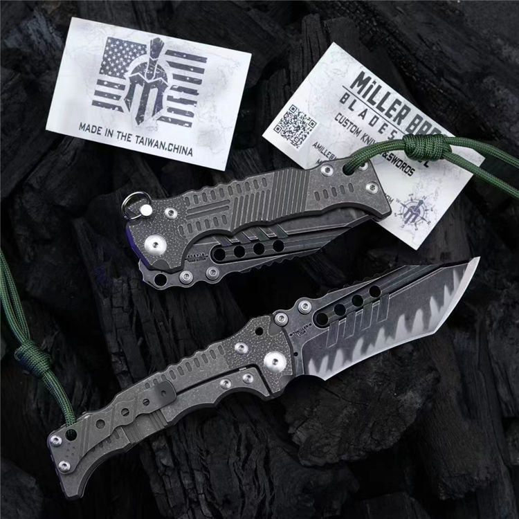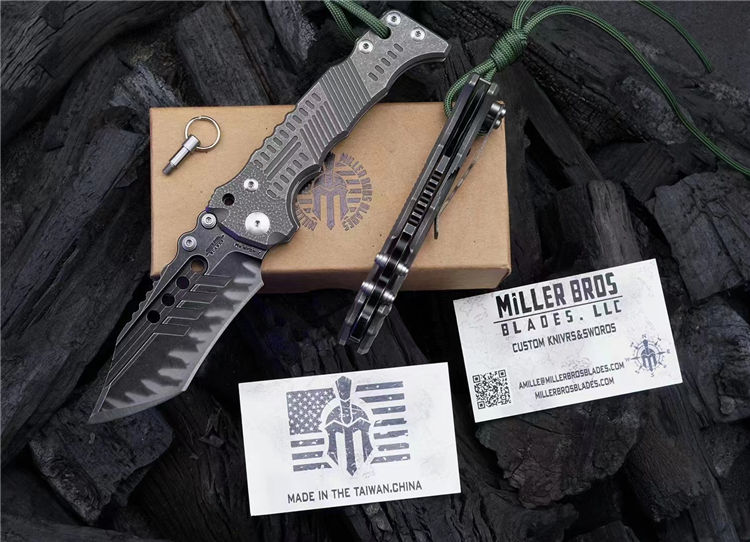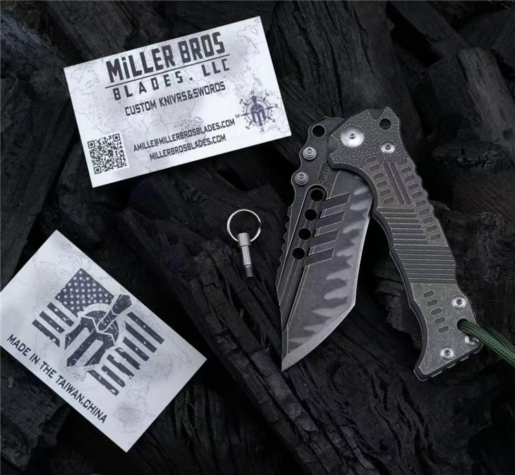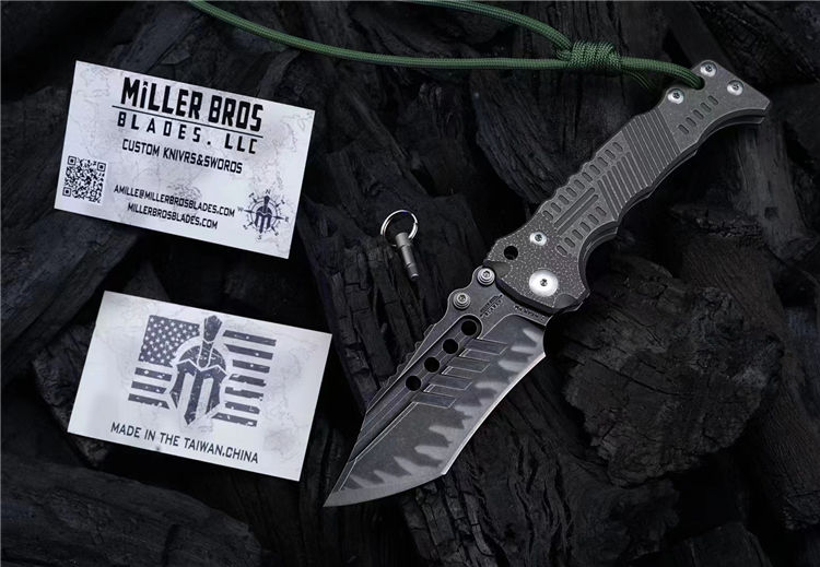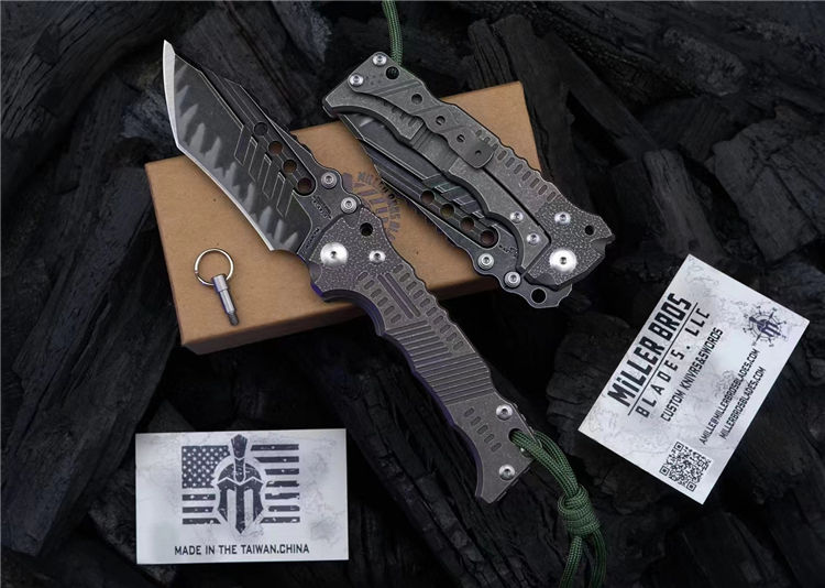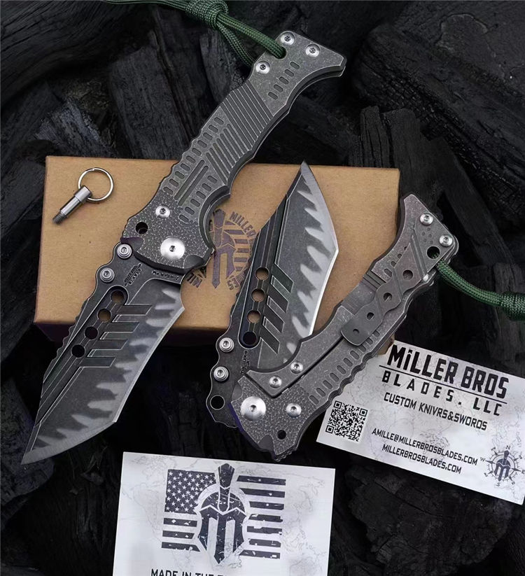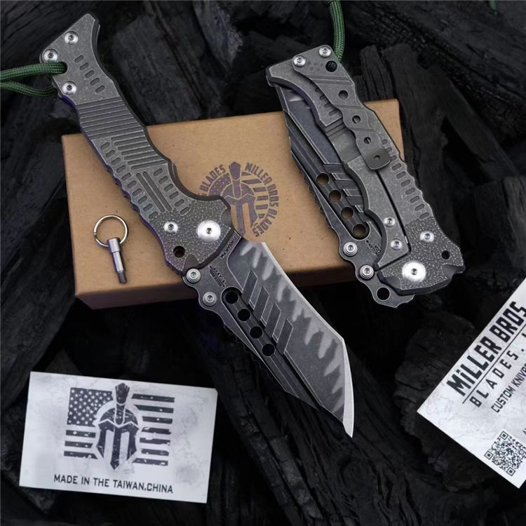 米勒T-1系列重型战术折刀 型号:M-1 全长:21.3CM 刃长:9CM 宽度:4.6CM 刃厚:0.5CM 刃材:Z-Wear工具钢A8 硬度:60HRC 刀柄:TC4钛合金手工+CNC 刀夹:TC4钛合金手工 重量:200G 产地:美国公司授权中国大陆代工 表面效果:镀钛发黑石洗做旧 包装:手工复古盒子