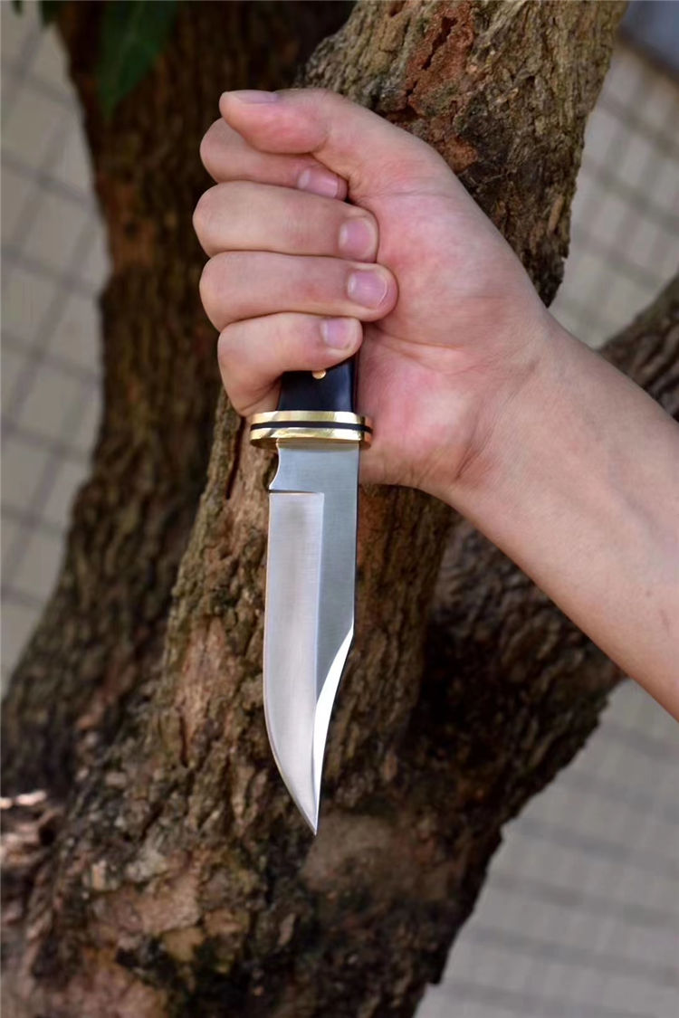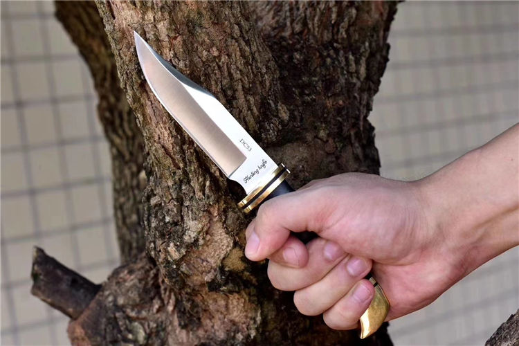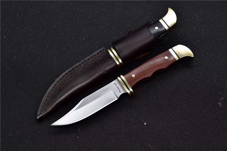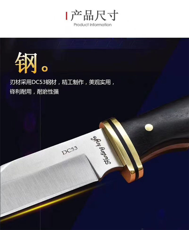 DC53钢HUNTER战术直刀 全长:218mm 刃长:98mm 刃宽:25mm 刀柄:98mm 刃厚:3.8mm 刀套:皮套 硬度:60HRC 钢材:DC53 刀柄:黄铜护手,手柄微粒黄檀木/黑檀木 刀重:200g 重量:约350g(含鞘盒)