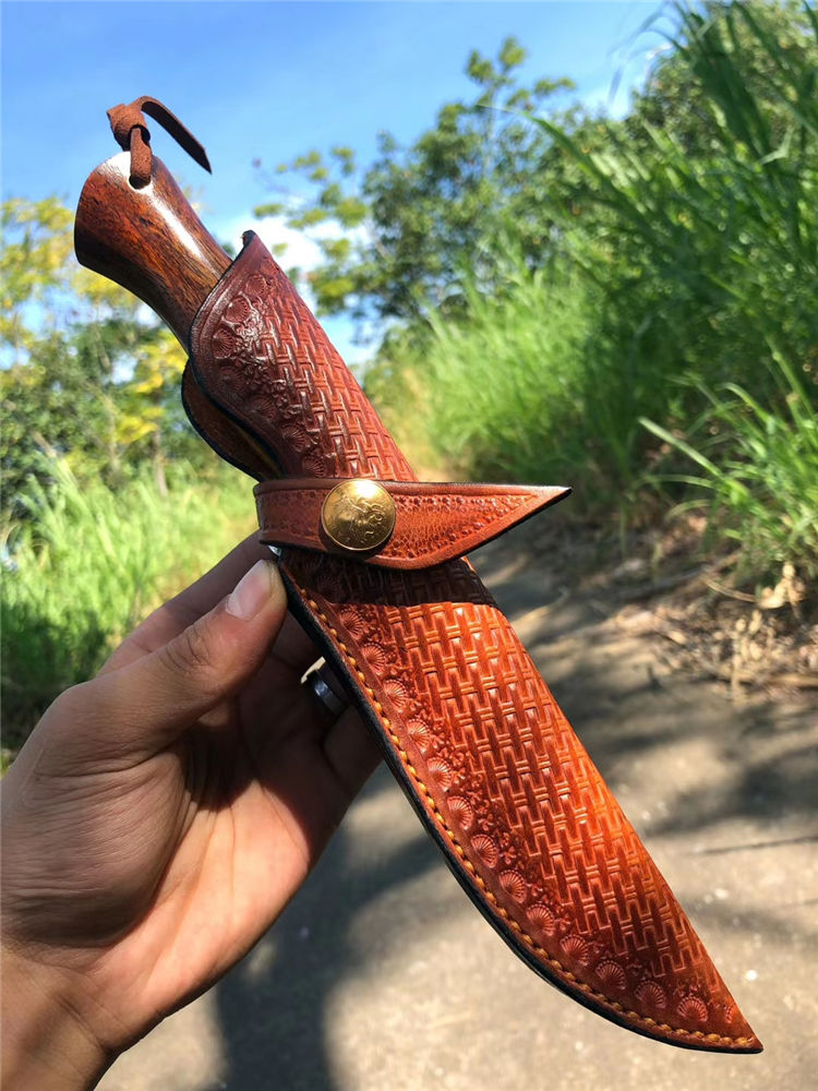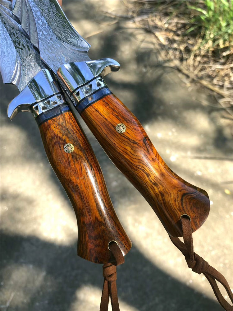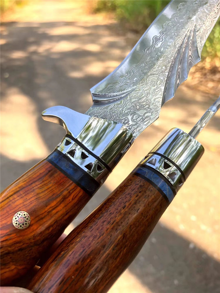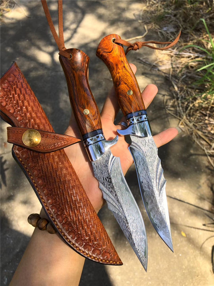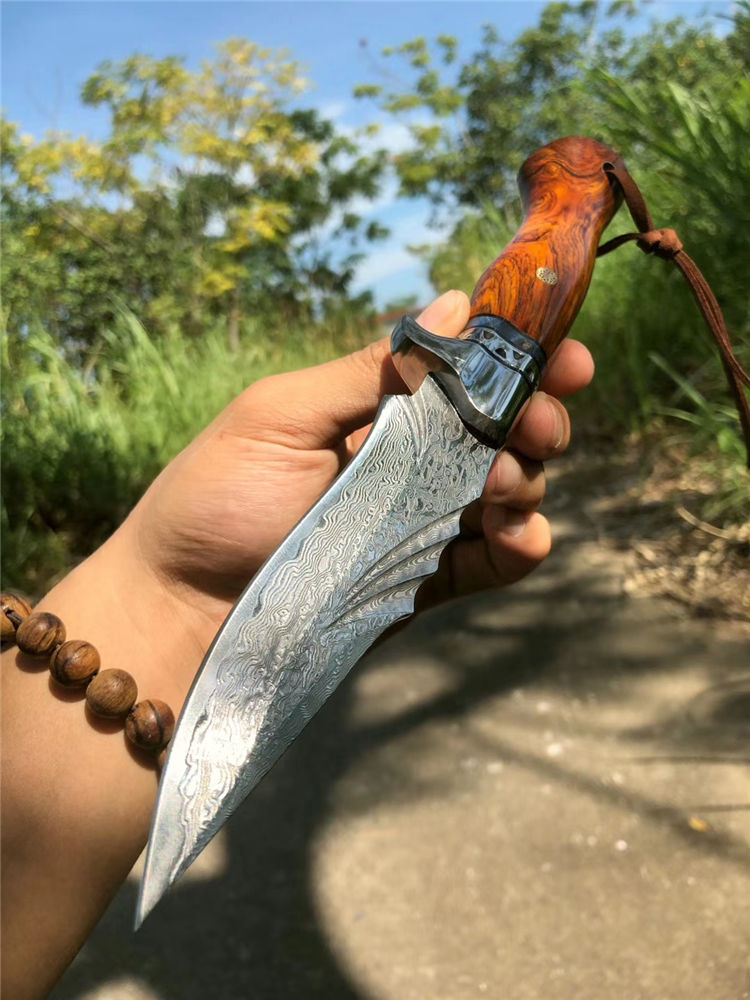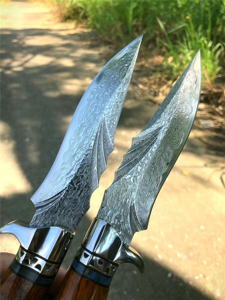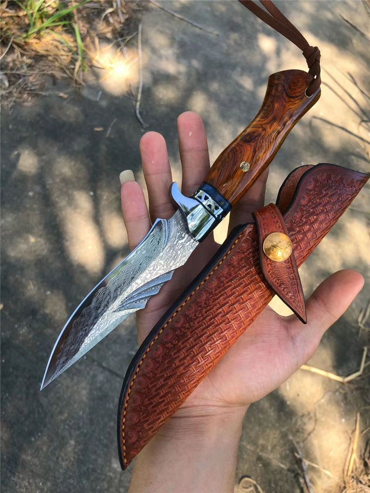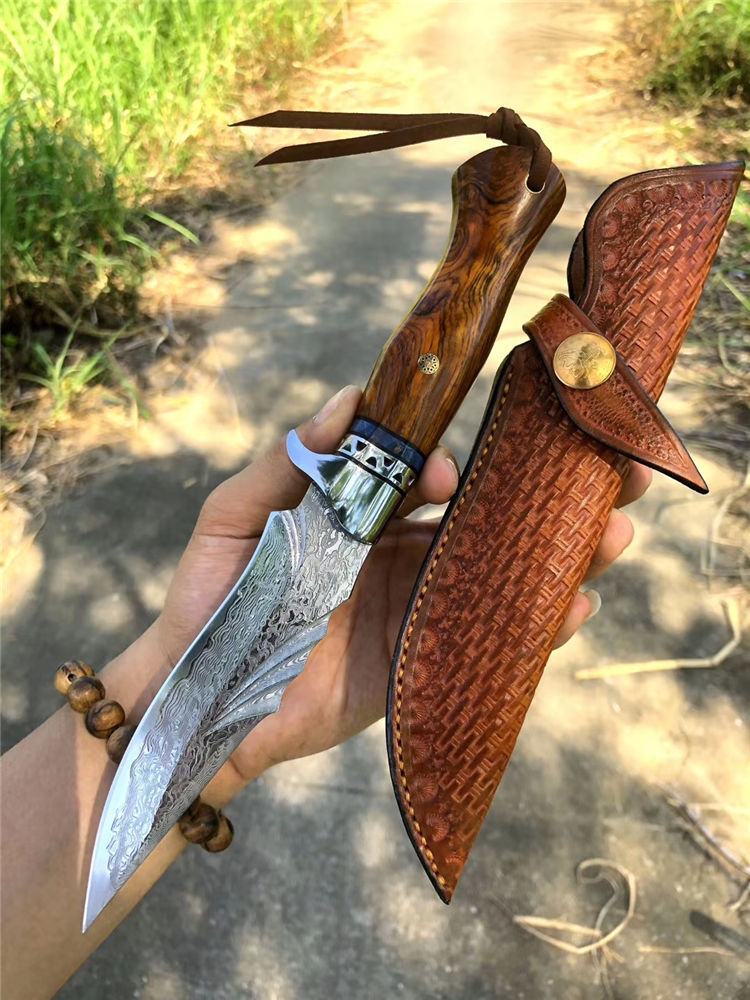 大马士革仁直刀 全长:25cm 刃长:12.5cm 柄长:12cm 刃宽:3.1cm 刃厚:3.5mm 刃材:进口锻造大马士革钢,高温空热处理 硬度:60HRC 手柄:手工研磨钢头+稳定木隔片+黄檀木 包装:黑色手工盒装