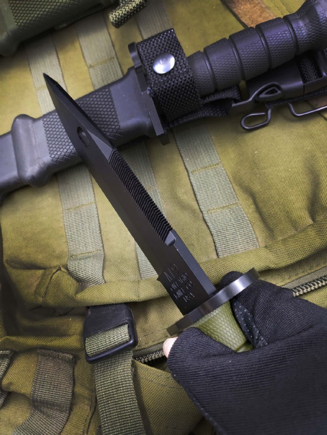 安大略版M9式多用军刺 品名:M9军刺 全长:310mm 刃材:440C 深冷热处理 表面镀黑钛处理 硬度:58-60HRC 刃厚:6.0mm 刃长:179mm 刀刃最宽处:37mm 柄长:129mm 柄材及处理:尼龙+玻璃纤维,黑绿两种颜色 总重量:约810g。 刀身重:约413g 刀鞘重:约397g 配战术刀鞘