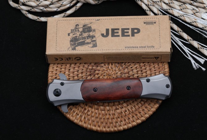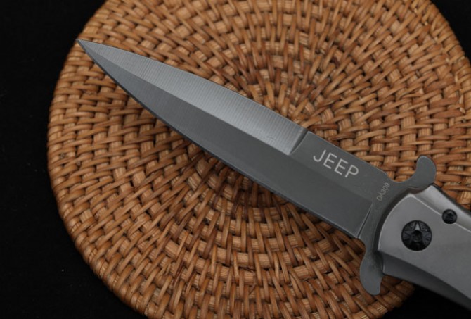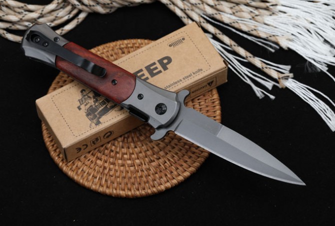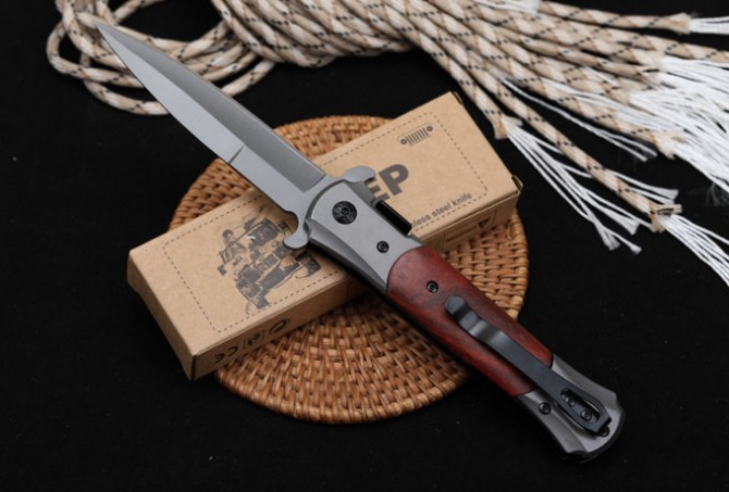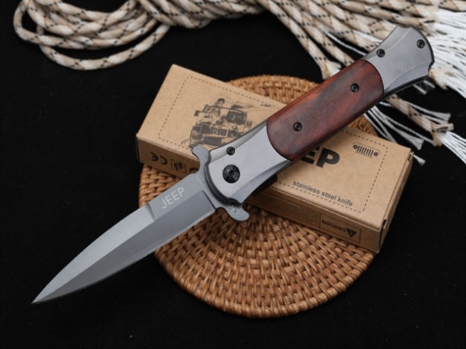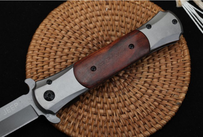 剑鱼DA309快开折刀 总长:22.2cm 刃长:9.3cm 柄长:12.6cm 刃宽:1.9cm(最宽处) 刃厚:3.0mm 刃材:5CR13MOV 硬度:58HRC 刀柄:全钢+酸枝木 表面:灰钛 重量:152g含包装