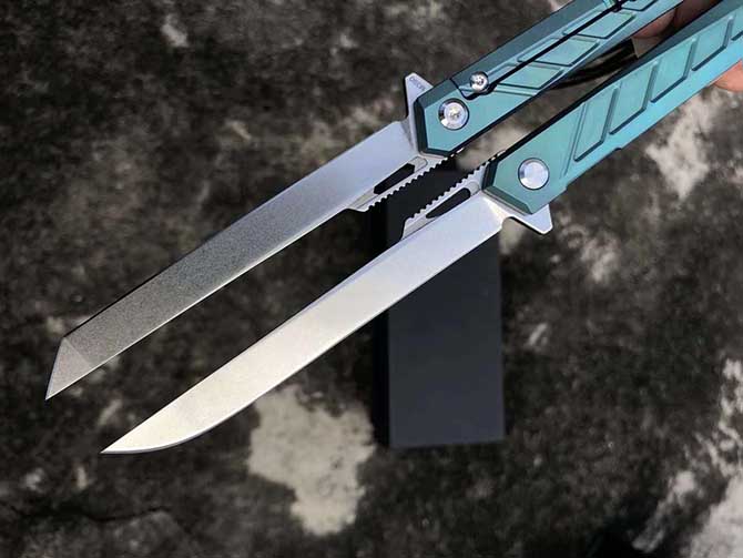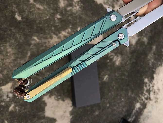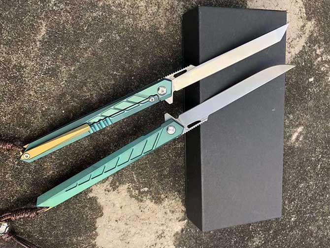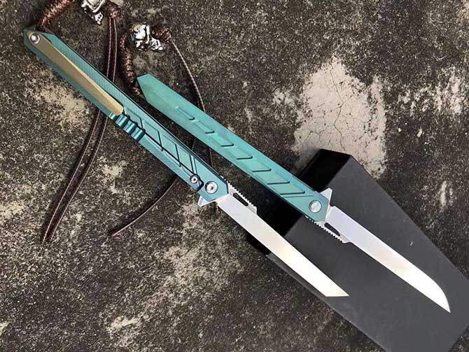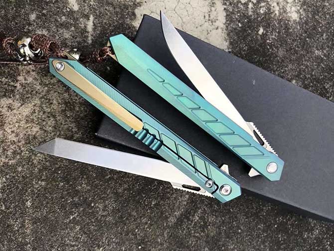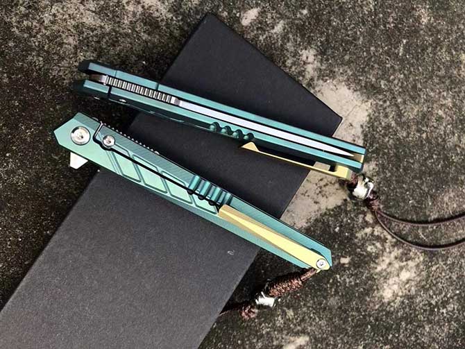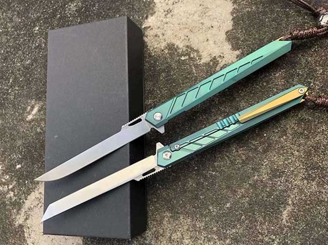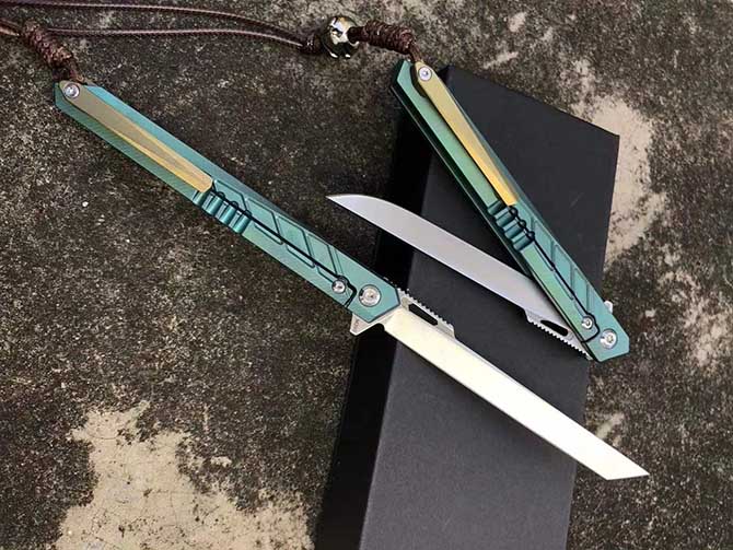 TC4钛合金神笔折刀 总长:21cm 刃长:9cm 手柄:11.5cm 刃厚:2.2mm 钢材:M390粉末钢 硬度:60HRC 柄材:TC4钛合金 包装:黑色小盒
