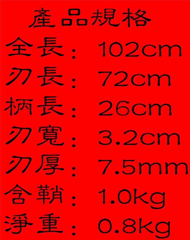 军魂武士直刀 专业测试、请勿模仿 工艺:龙泉古法传统手工艺 装具:无 刃材:特殊钢烧刃 柄材:实木皮柄 鞘材:实木皮鞘 赠品:锦盒、养护油、布