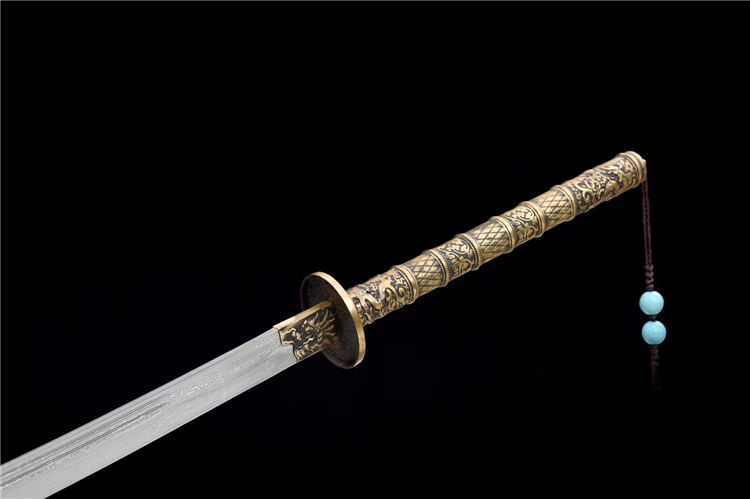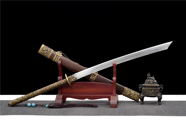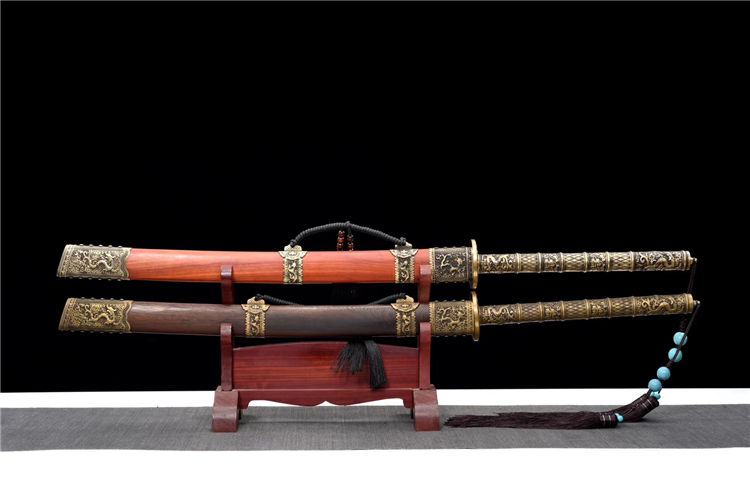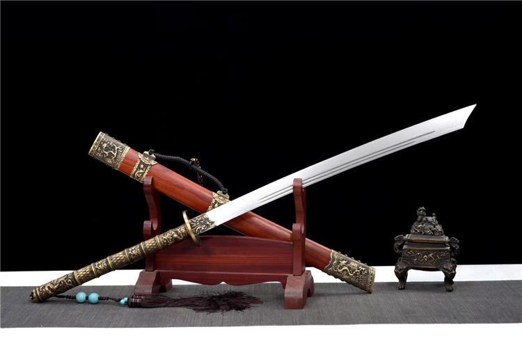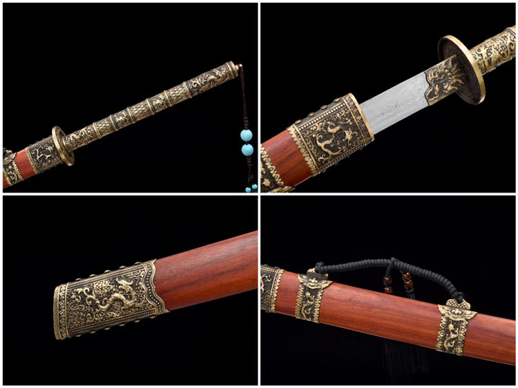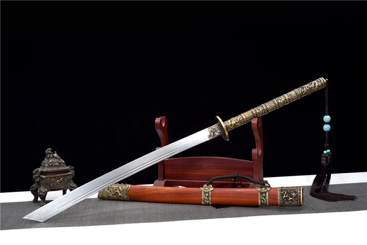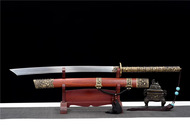 铜装康熙宝刀 工艺:龙泉古法传统手工艺 装具:铜装 刃材:高性能花纹钢 柄材:铜柄 鞘材:红木花梨木鞘 赠品:精美锦盒、养护油、布