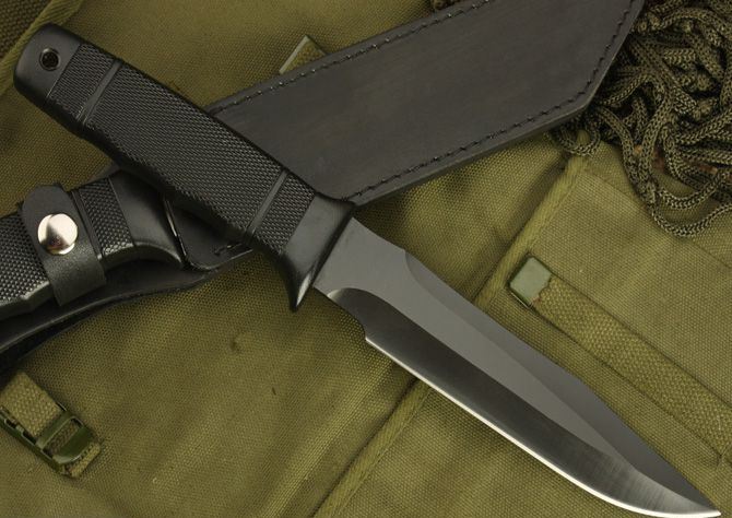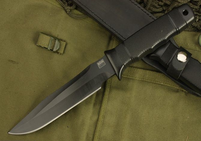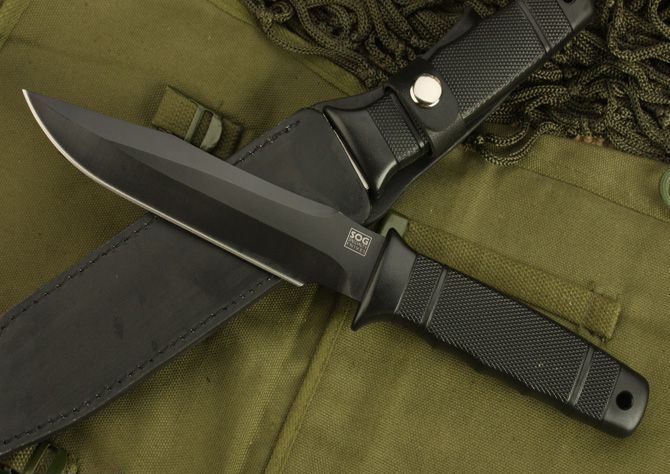 代工SOG野营刀(黑版) 全 长: 30cm 刃 长: 14cm 刃 厚: 5mm 刃 材: 4CR13 硬 度: 58HRC 重 量: 420 表 面: 电泳 柄 材: ABS 刀 鞘: 牛皮