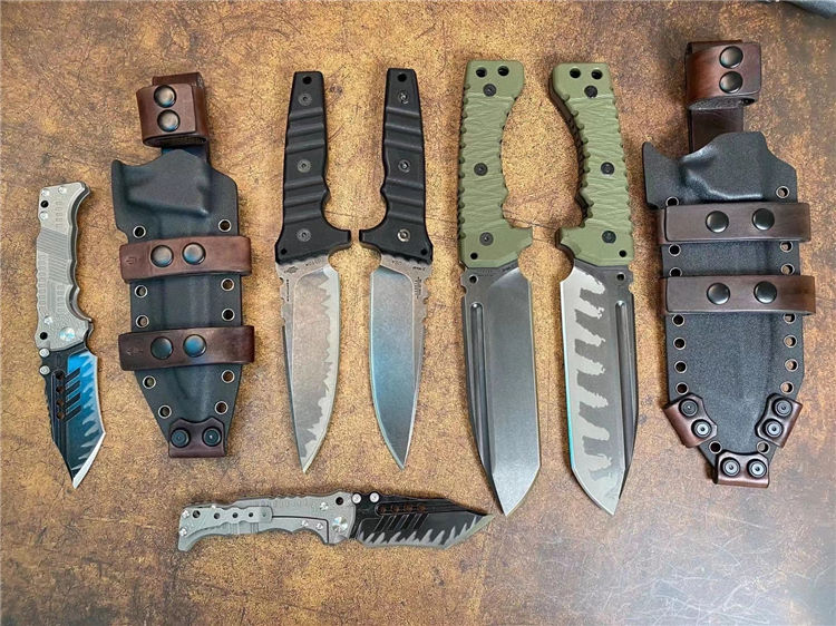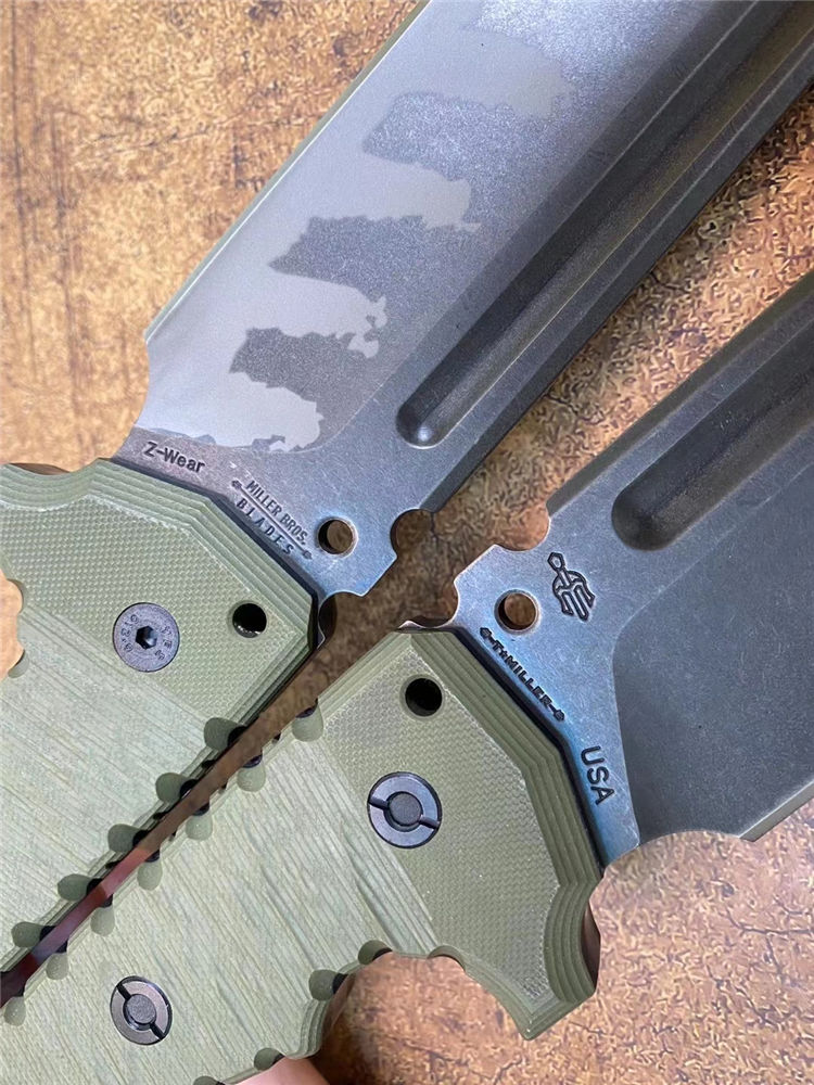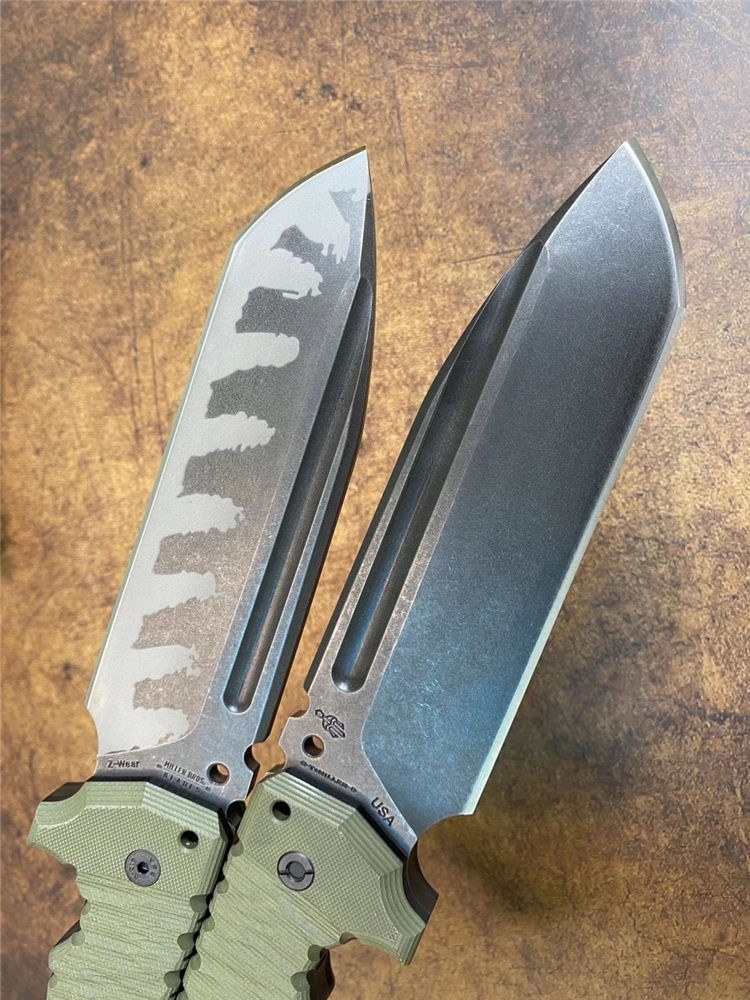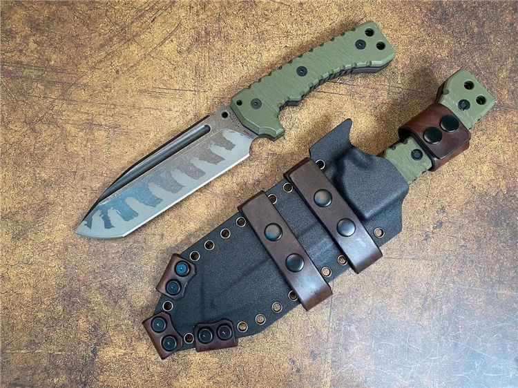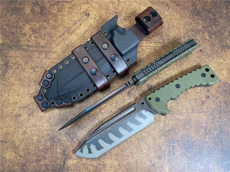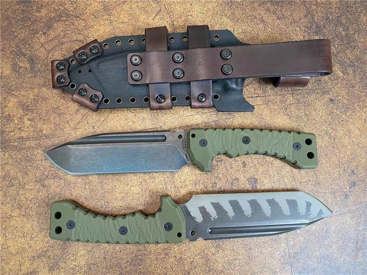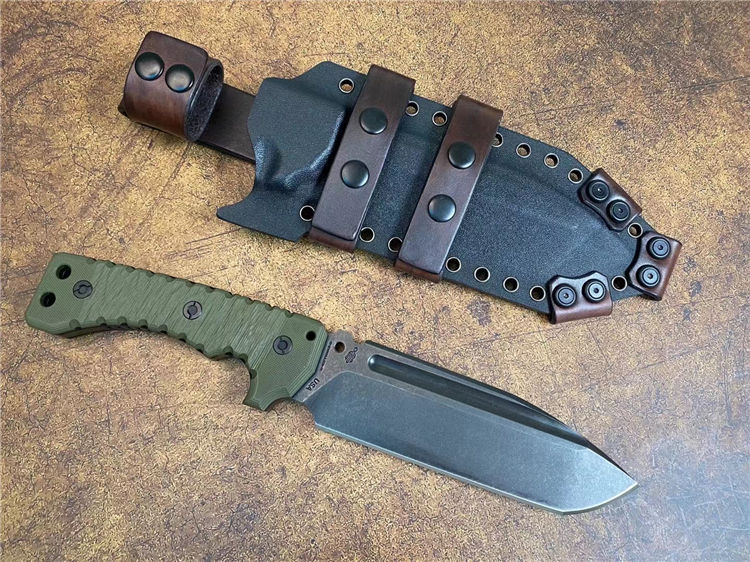 米勒M32进化版直刀 钢材:Z-wear 硬度:62-63HRC 手柄:G10军绿色+黑色 总长:328mm 刃长:165mm 刃厚:7-7.1mm 刃宽:5.3mm 总量:含鞘1250G K鞘:手工进口K版鞘+意大利进口植鞣皮手工制作 包装:黑色手工盒子