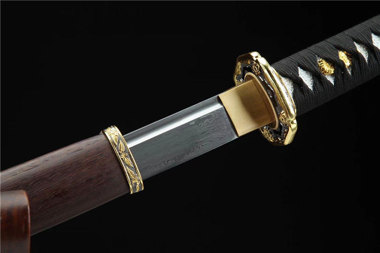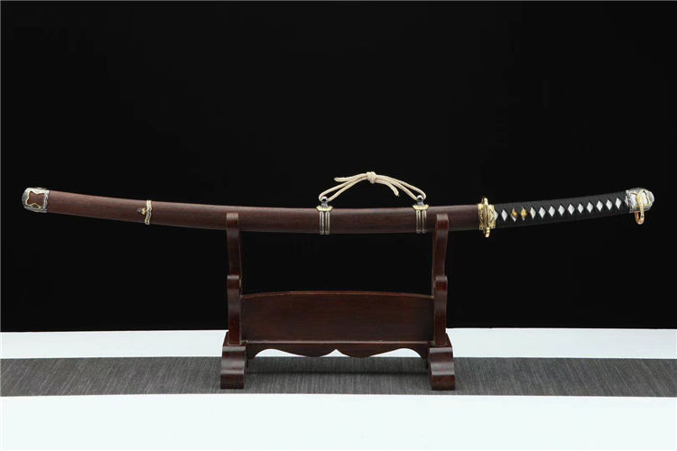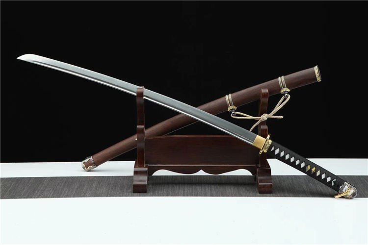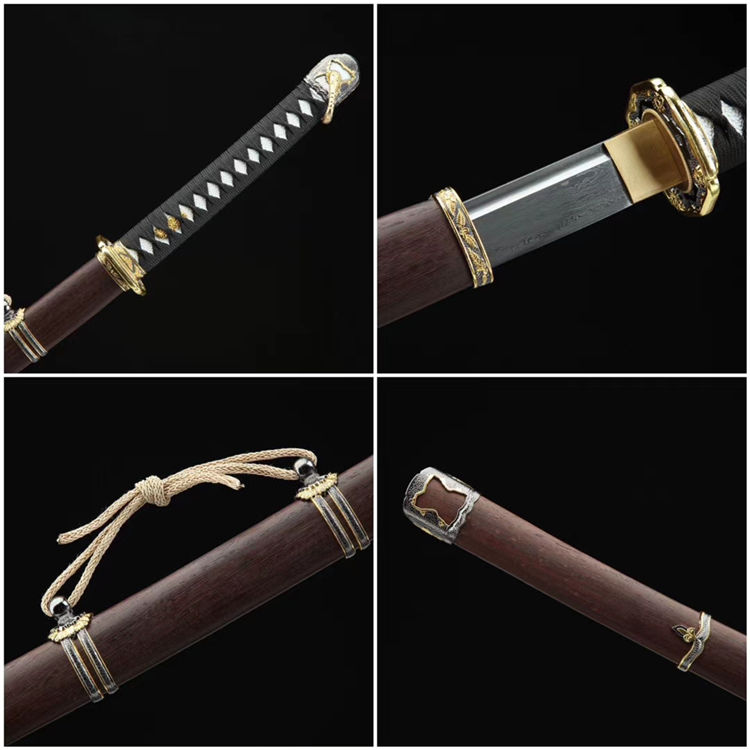 花梨木九八军刀 工艺:龙泉古法传统手工艺 装具:合金装 刃材:高性能花纹钢 柄材:实木绕绳柄 鞘材:花梨木鞘 赠品:精美锦盒、养护油、布