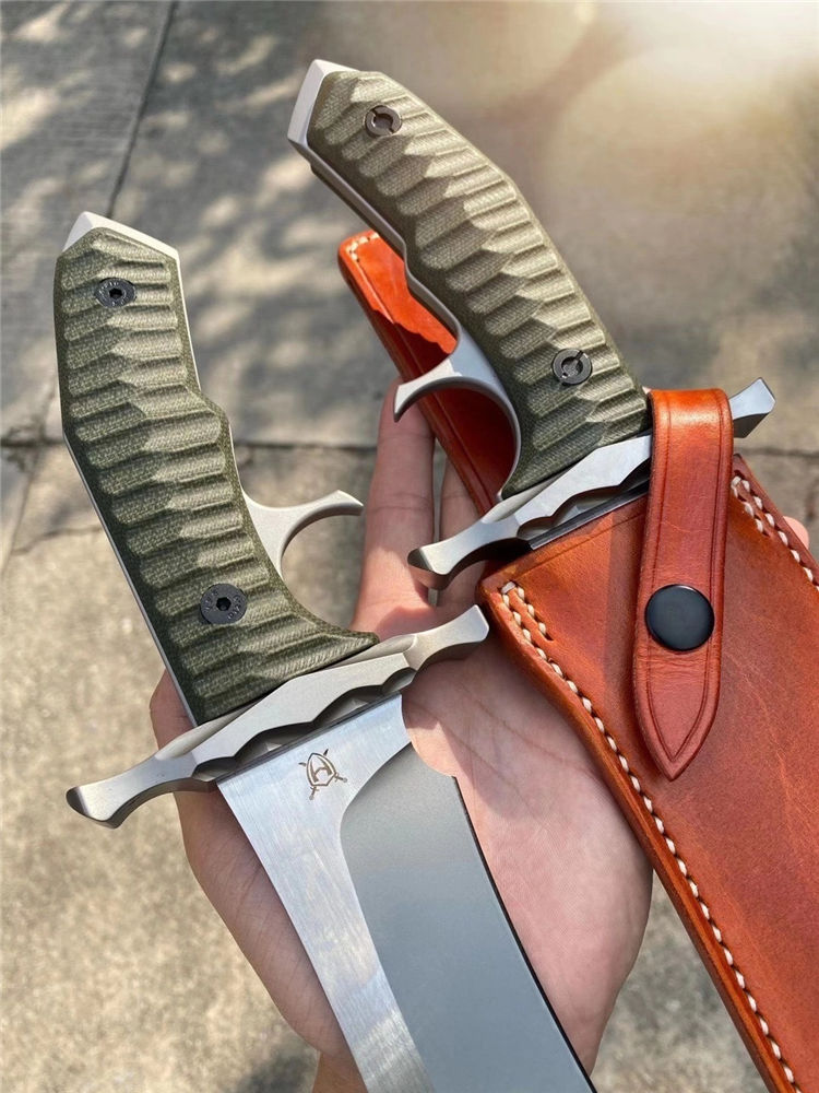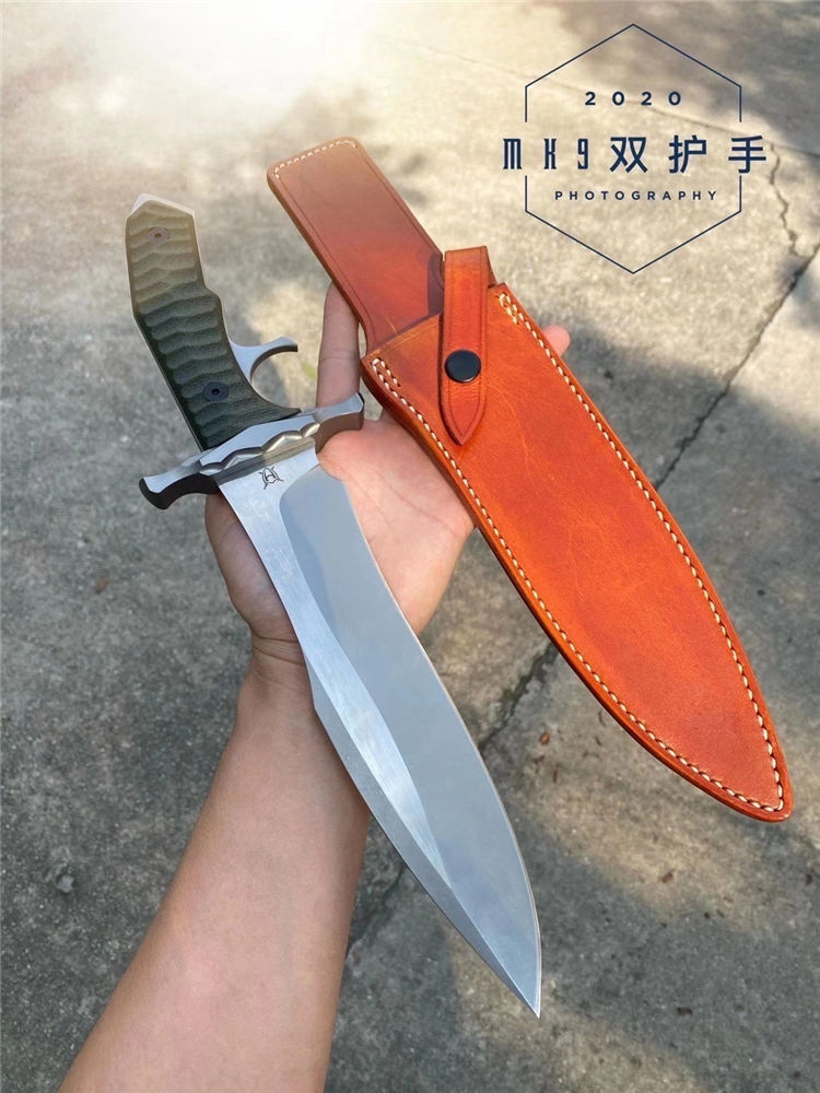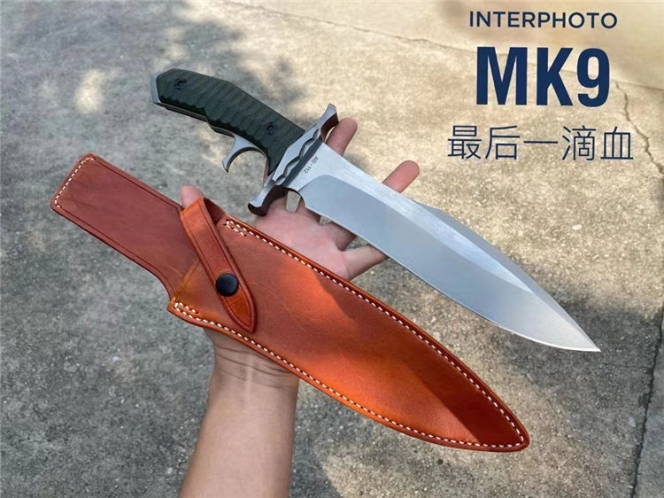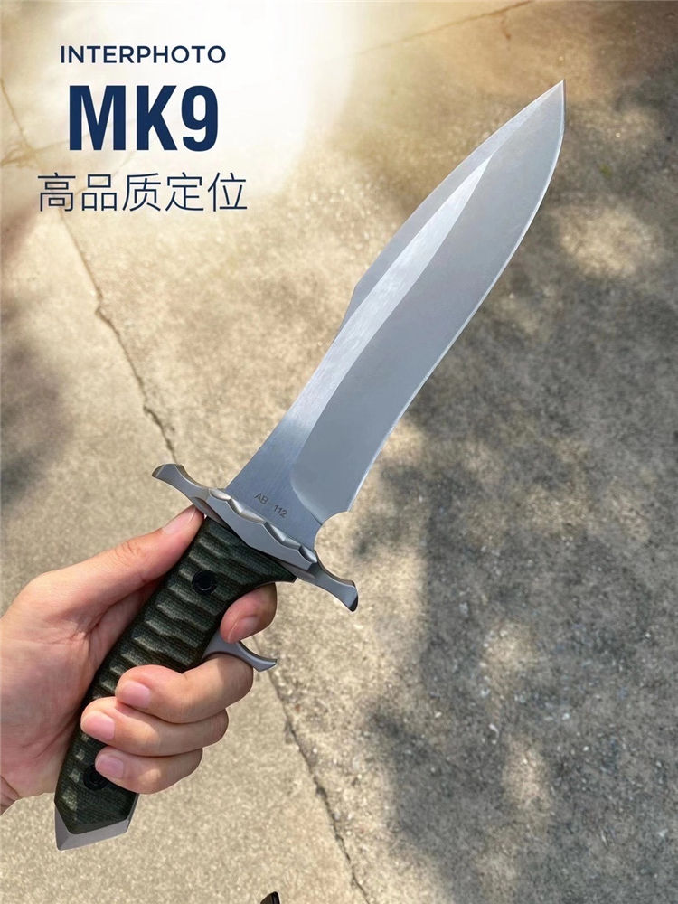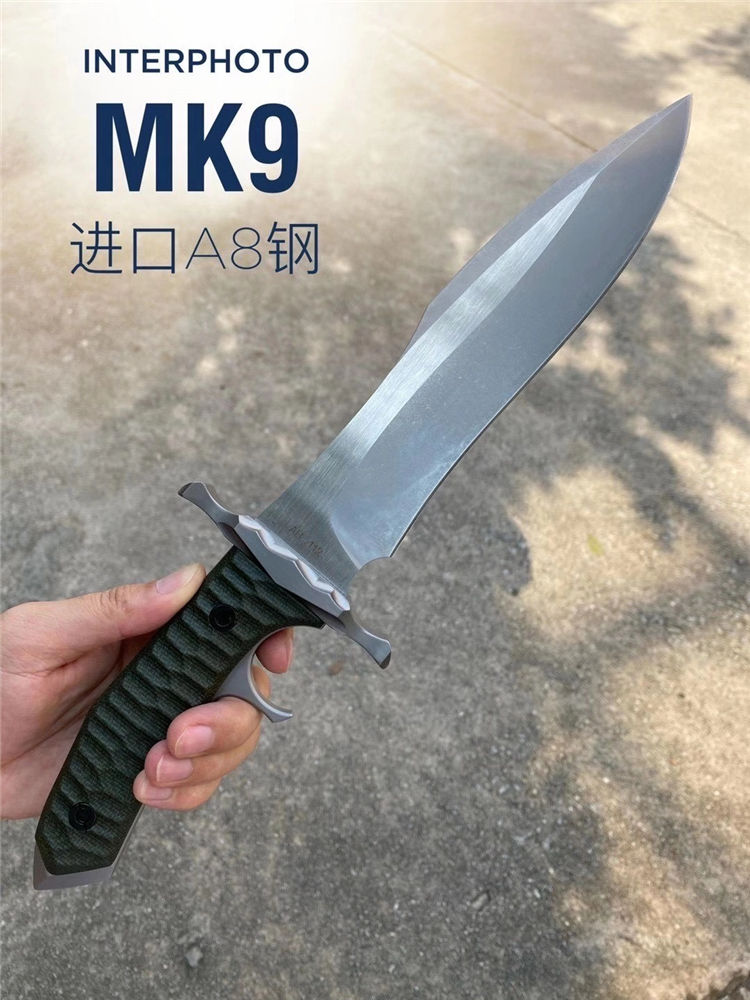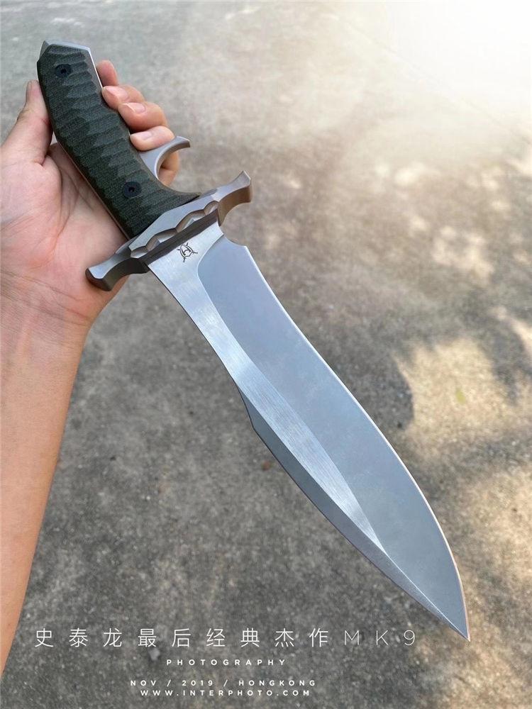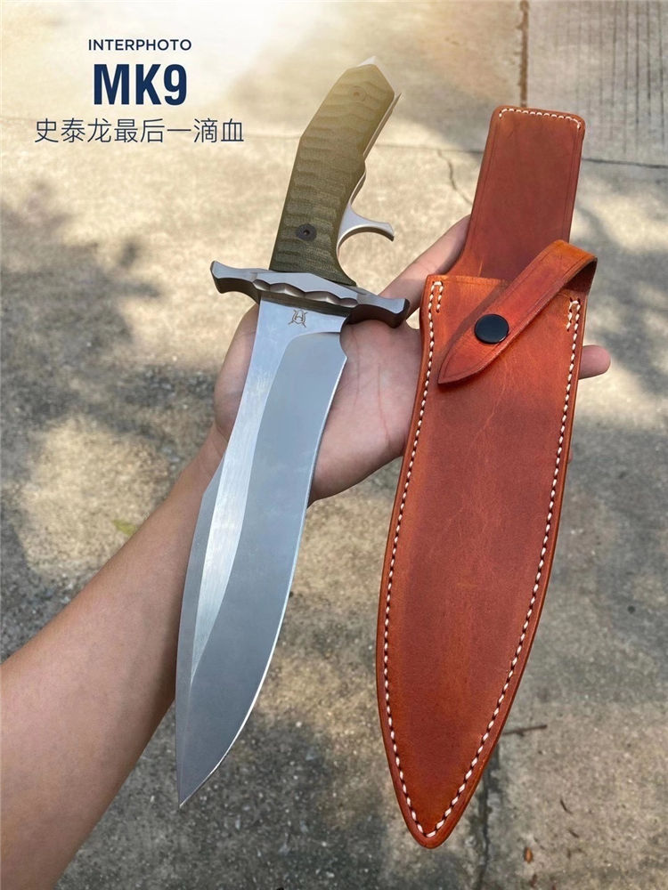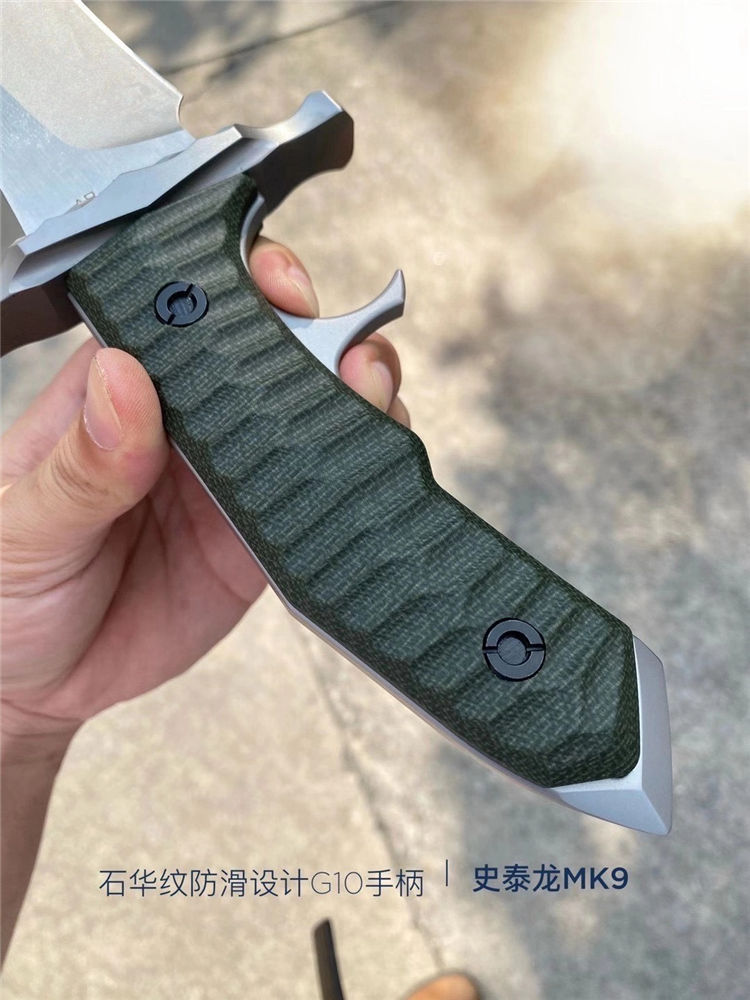 史泰龙MK9直刀 材质:A8 全长:383mm 厚度:5.8MM 刃长:228mm 柄长:155mm 刃宽:49mm 硬度:59(真空热处理)真空处理韧性非常好,多次回火护手钛合金喷砂处理护 手宽:100mm 贴片:橄榄绿亚麻柄12.9级战术锣丝 刃面数控磨,珠光石洗效果表面拉丝 重量:640g 一体龙骨,手柄是复杂结构,分段式镶堪工艺,手柄龙骨退火