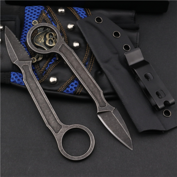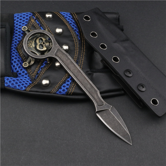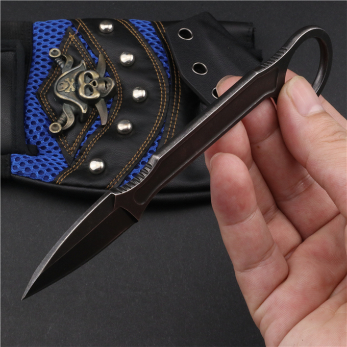 巴斯蒂内利黑桃手刺 总长:146mm 刃长:46mm 刃厚度:3.8mm 刃宽:19mm 刀片材质:440C 刀片表面处理:黑色石洗 硬度:59-60HRC 刀套:K鞘 净重:45g 毛重:119g 包装:黑色礼盒