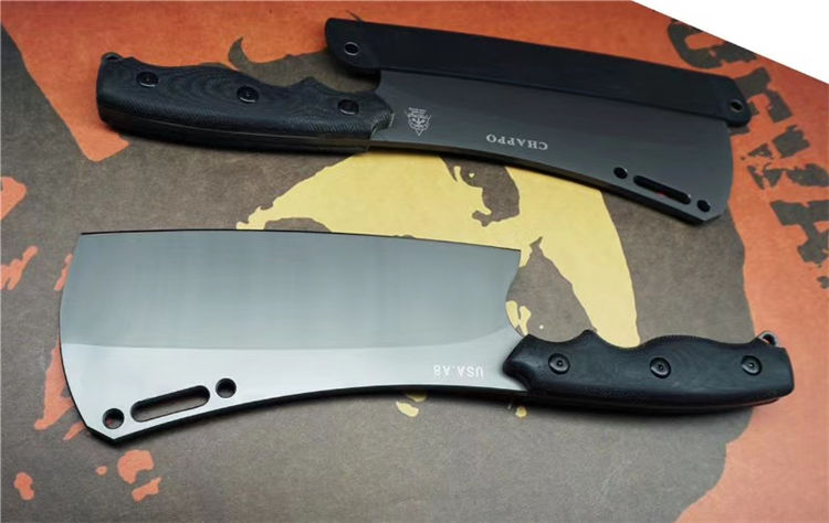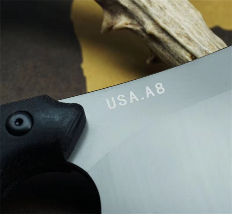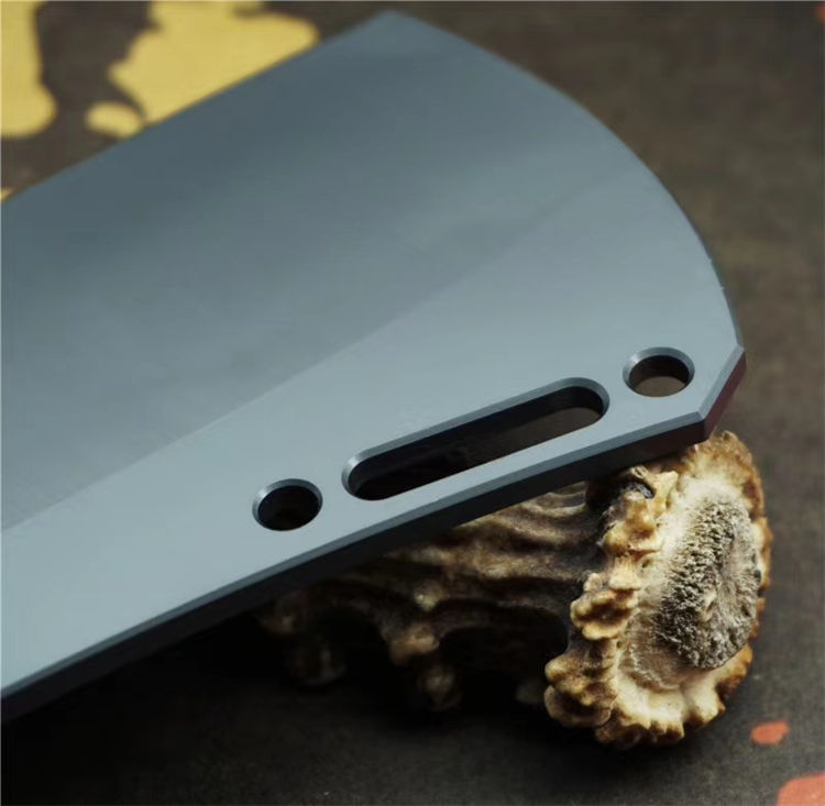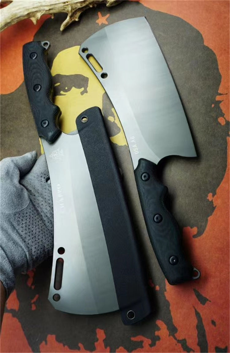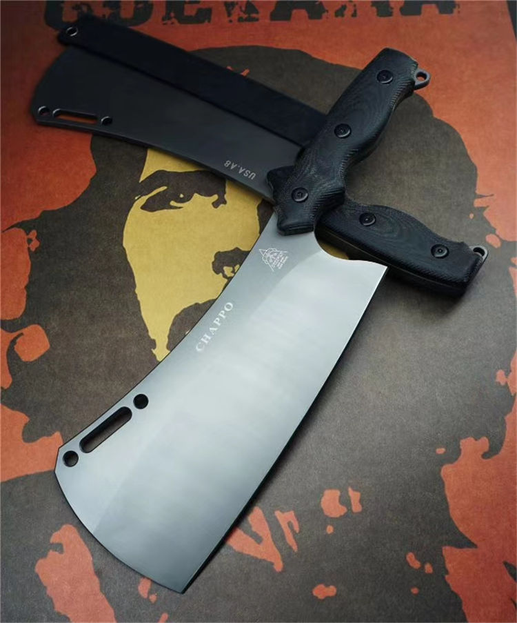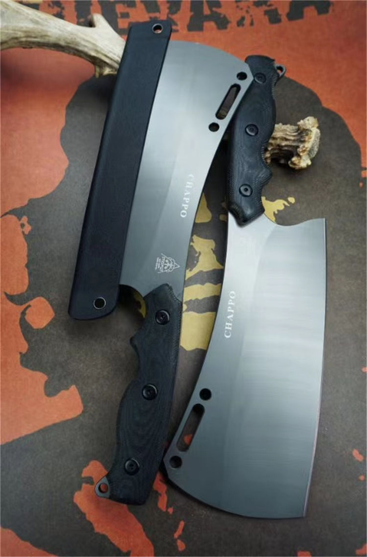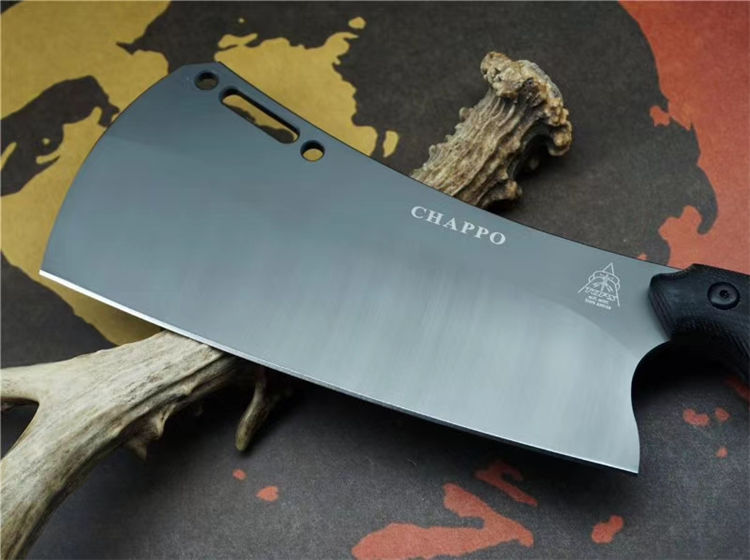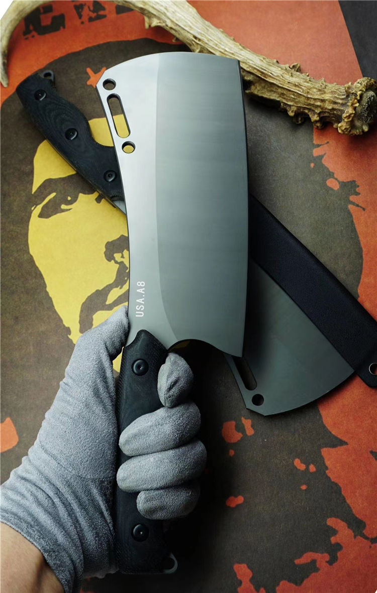 尖端战术厨刀 总长:300mm 刃长:175mm 刃厚:5mm 柄长:125mm 刃口最宽处:90mm 开口方式:二次开刃,以锋利度为主 处理方式:真空碎油热处理 硬度:59-60RHC 钢材:进口A8高韧性模具钢 柄材:进口彩色米卡塔+钢钉 表面:镀灰钛效果,有着浓浓的战术味道 刃面:精准数控水磨效果,立体感完美 周边处理:精准电脑锣效果手感更加舒适 净重:550克(不含包装) 包装:精美手工盒(出口标准) 刀鞘:K鞘搭配