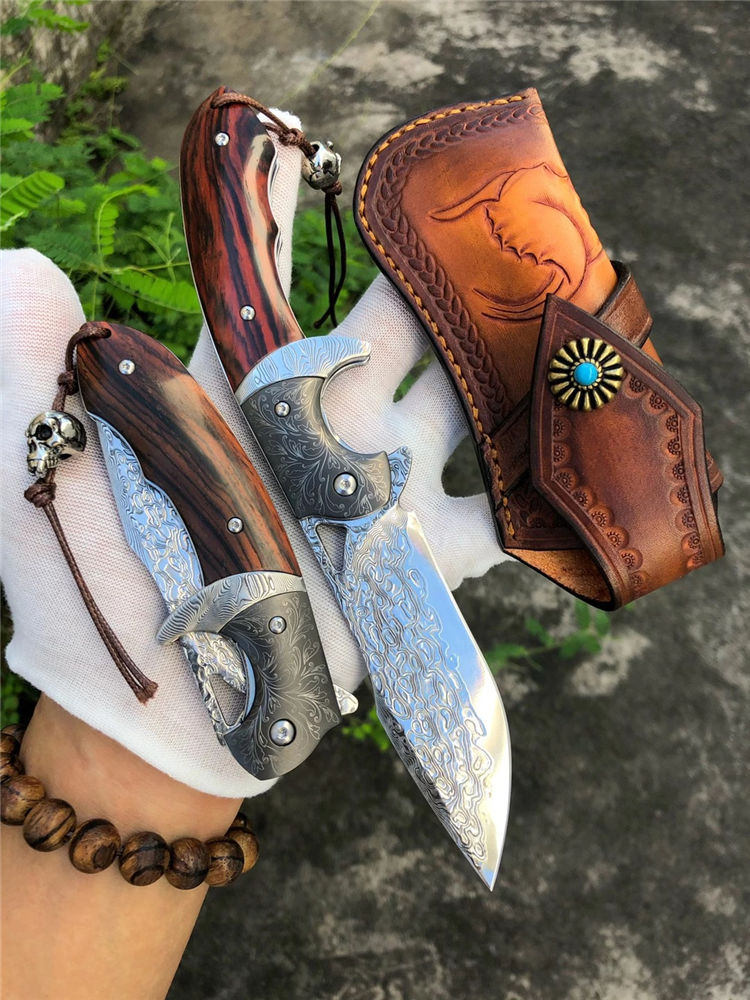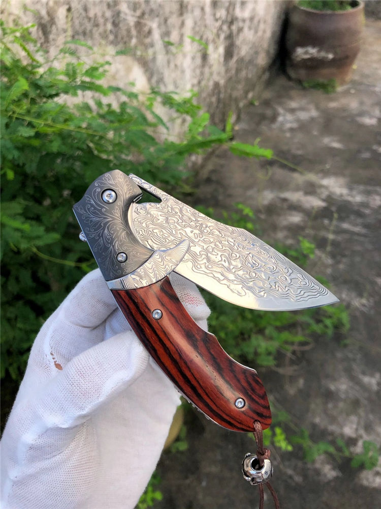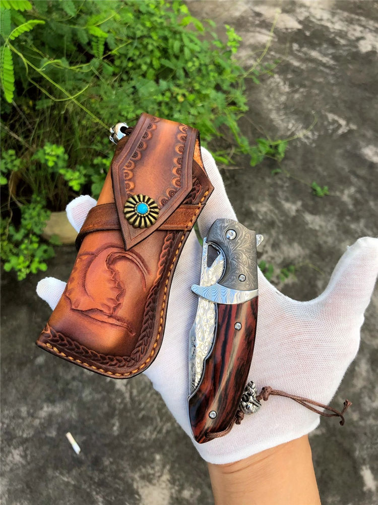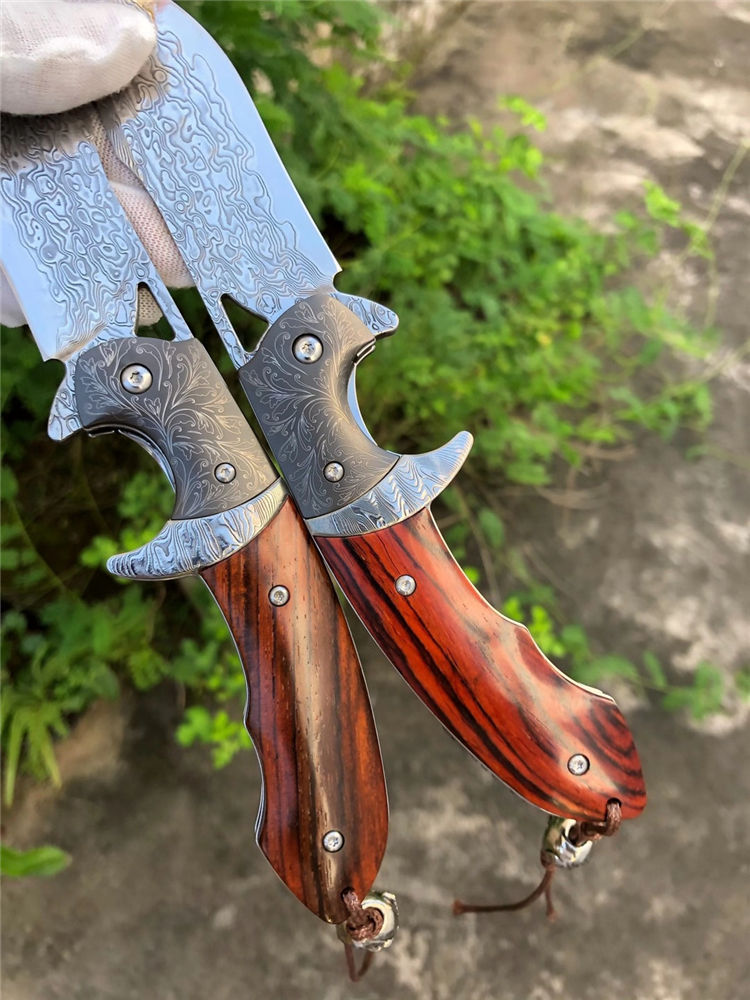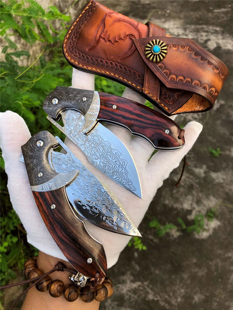 大马士革妖姬折刀 总长:22cm 刃长:9.9cm 柄长:12cm 刃厚:3.5MM 刃宽:3.1cm 刃材:大马士革VG10钢(83层) 硬度:60HRC 热处理方式:真快高温热处理 开刃方式:手工复次研磨 柄材:不锈钢头表面激花+大马士革钢片材料+微粒黄檀木 皮套:意大利手工雕花植糅皮 包装:黑色小盒+骷髅吊坠+手工皮套