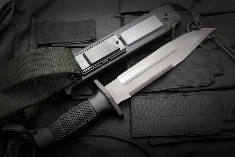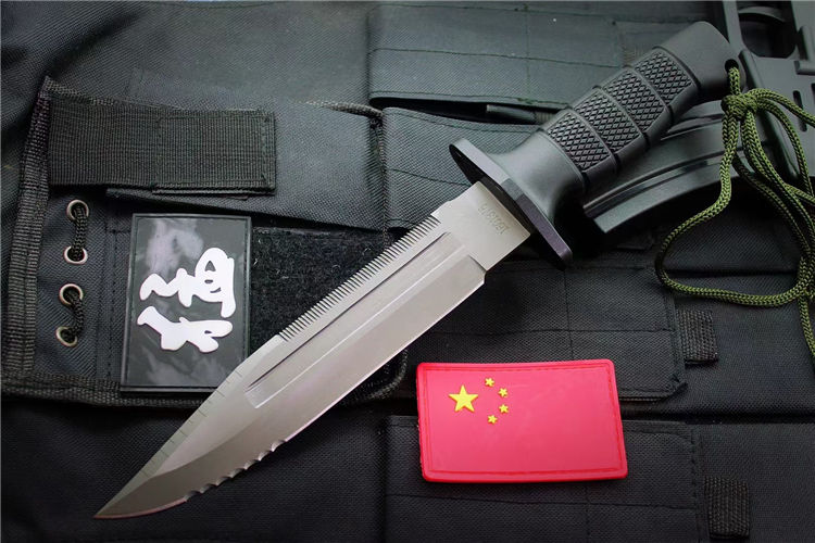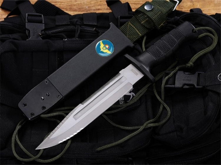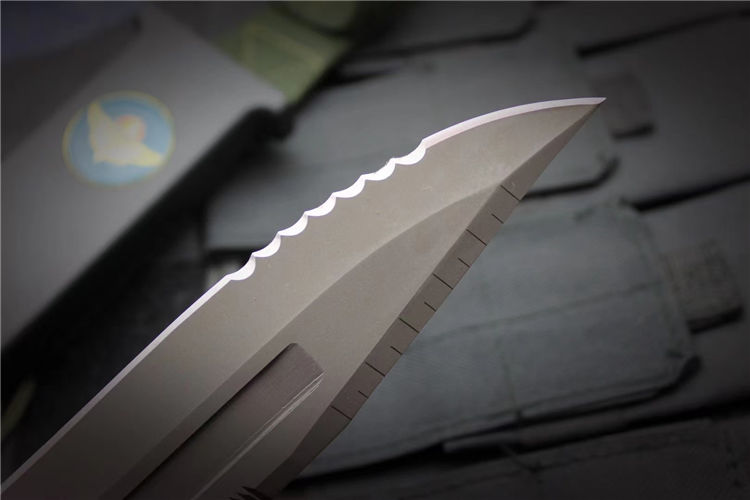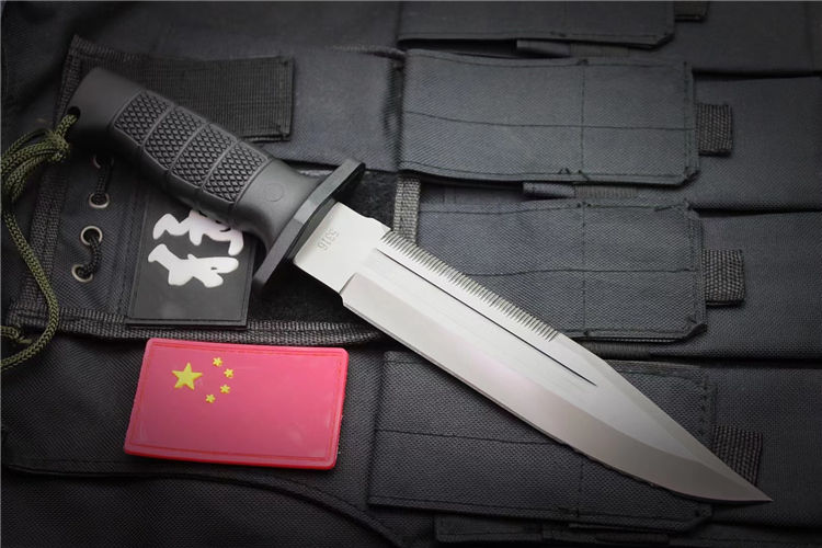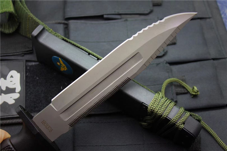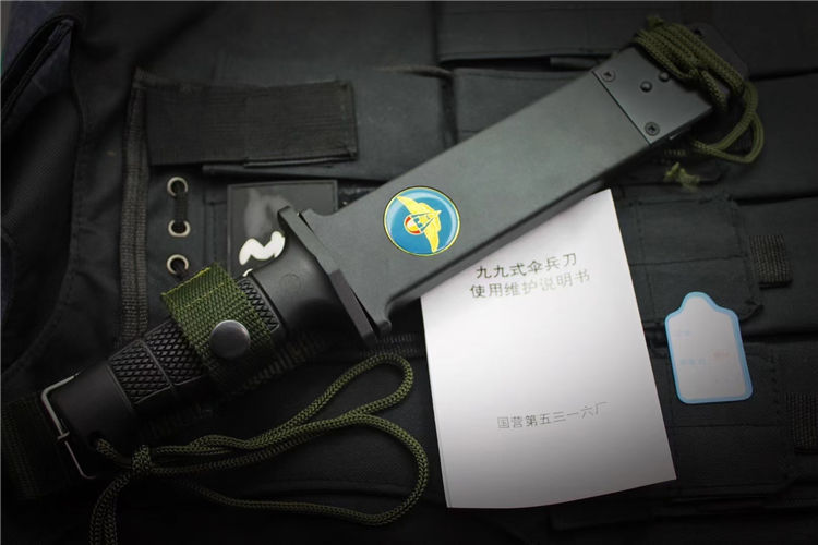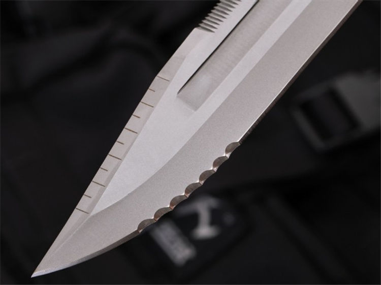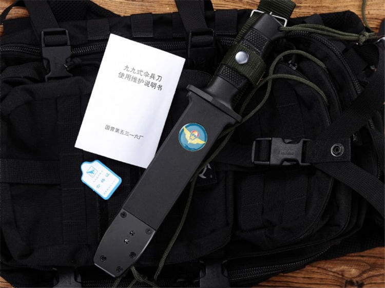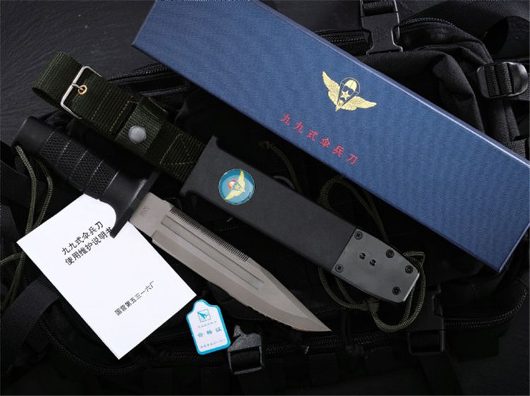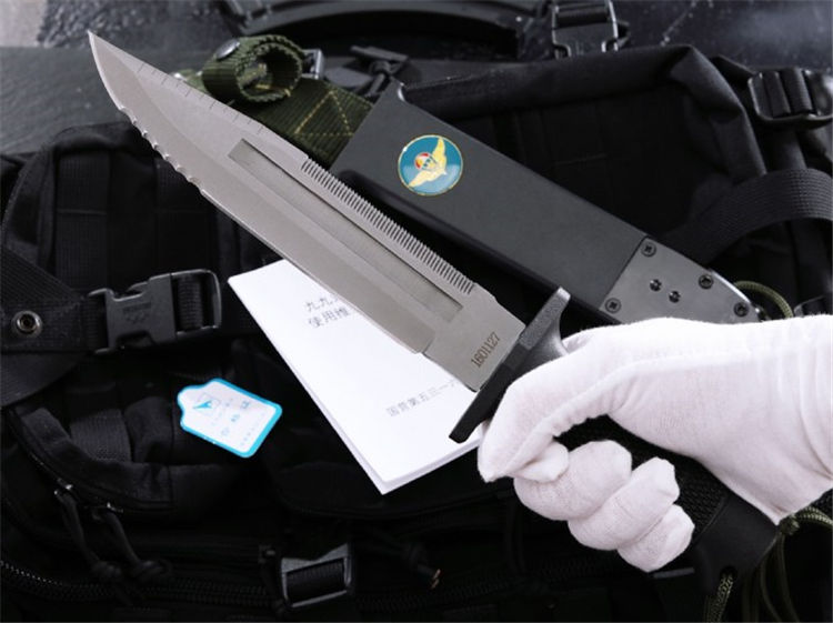刀体为锋利的单面刃口,能快速割断降落伞伞绳和其它绳索。刀背有一段坚利锯齿,能锯断f飞机铝壳体和电缆。刀体刻有血槽,刺入敌人身体后,能顺利拔出,同时使刀体重量降低至320克,并增强了刀体的刚度,提高抗弯抗扭能力。刀体材料为高强度防酸高碳不锈钢。为防止刀体反光,提高隐蔽性,表面经喷砂处理使之呈暗灰色