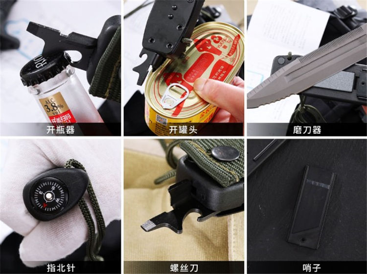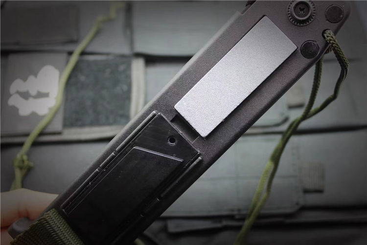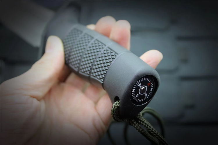 刀柄表面刻有网纹和环形槽,不但握持舒适,手感好,而且防滑、绝缘性能好。横截面为实心椭圆形,前段设有横挡护手,护手上有孔。尾部有小型防震指北|针和保险绳。刀柄材料选用黑色高强度工程塑料制成,具有比重轻,强度高,塑性好,耐冲击,耐高低温,耐腐蚀,耐老化等优点