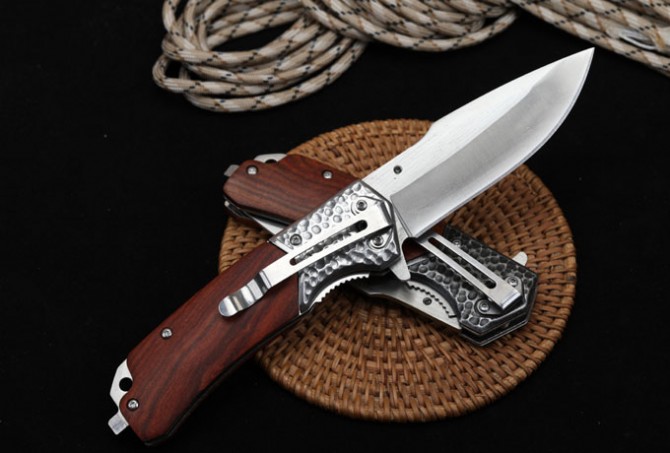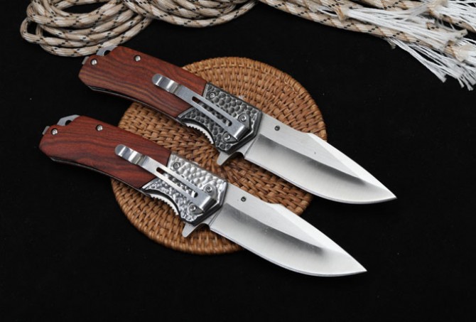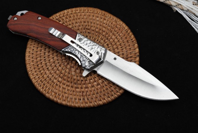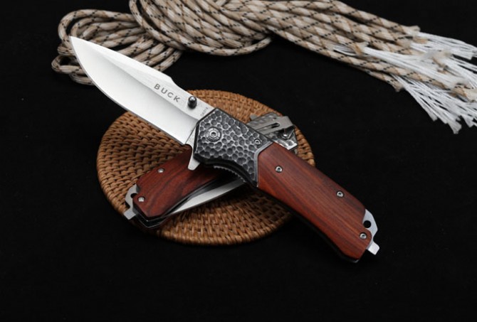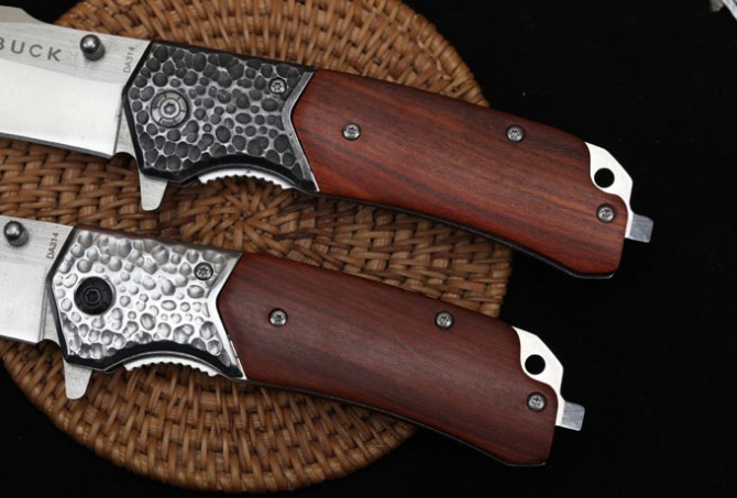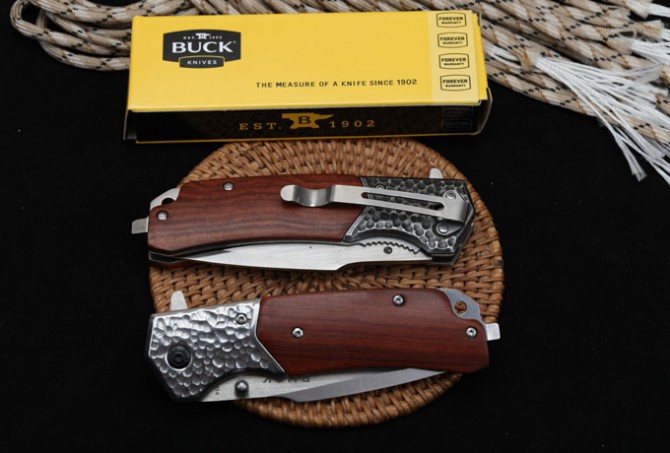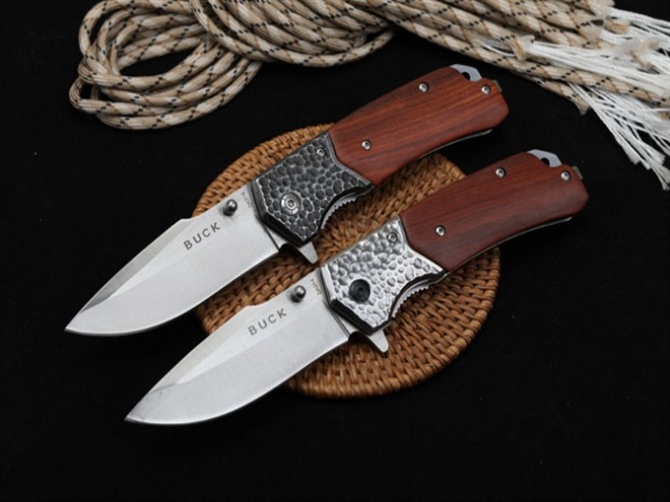 巴克DA314快开折刀 全长:22.3cm 刃长:9.1cm 柄长:11.6cm 刃宽:2.9mm 刃厚:0.28mm 刃材:440C 重量:174g(含包装物) 硬度:58HRC 表面:灰钛真空镀钛处理 柄材:钢+酸枝木 锁型:线锁 其他:配彩盒