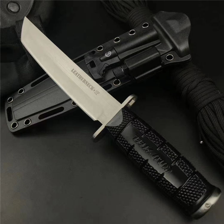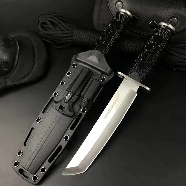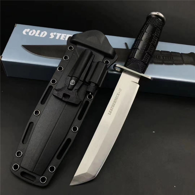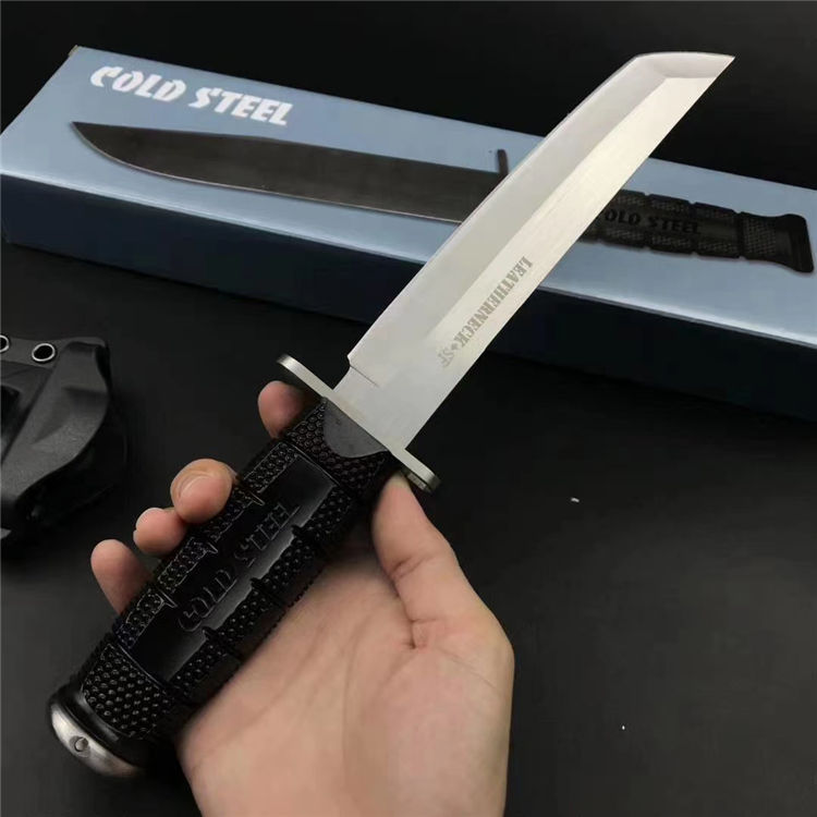 新款冷钢39LSFDT方头丛林直刀 全长:28.9cm 刃长:16.5cm 柄长:11.3cm 刃宽:3.1cm(最宽处) 刃厚:3.5mm 刃材:8CR13MOV 硬度: 58HRC 刀柄:玻纤防滑手柄 表面:沙光 刀重: 281克 重量:457克(含包装) 备注:配置打火棒,小手电筒,原厂礼品盒,优质玻纤鞘,可以拴大皮带,方便取刀