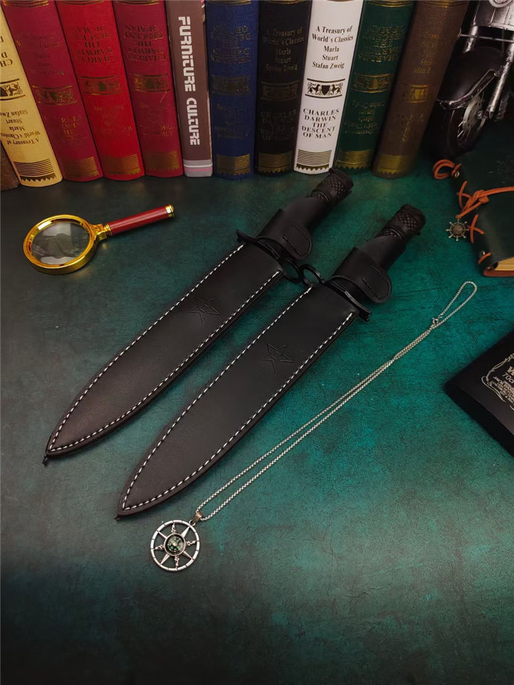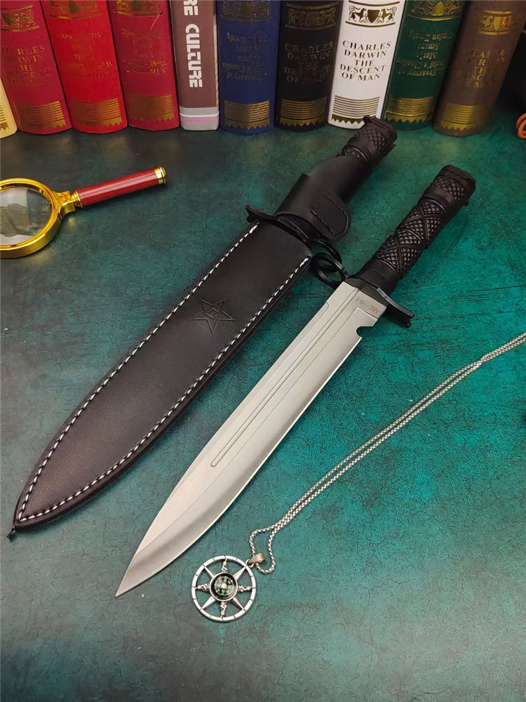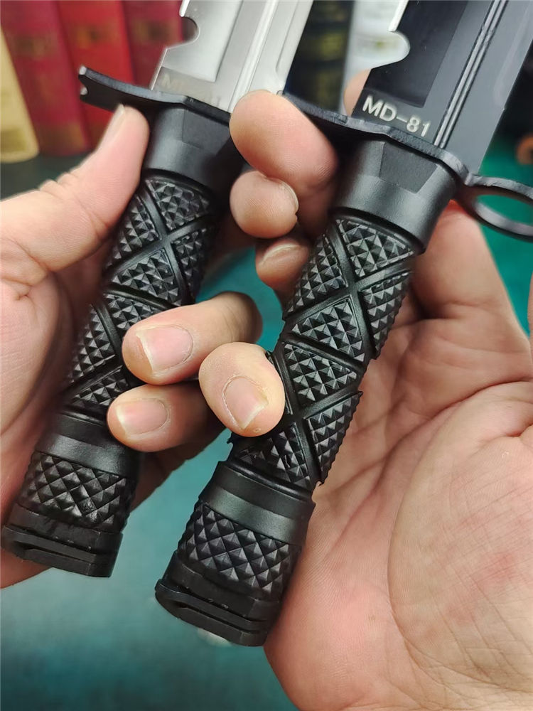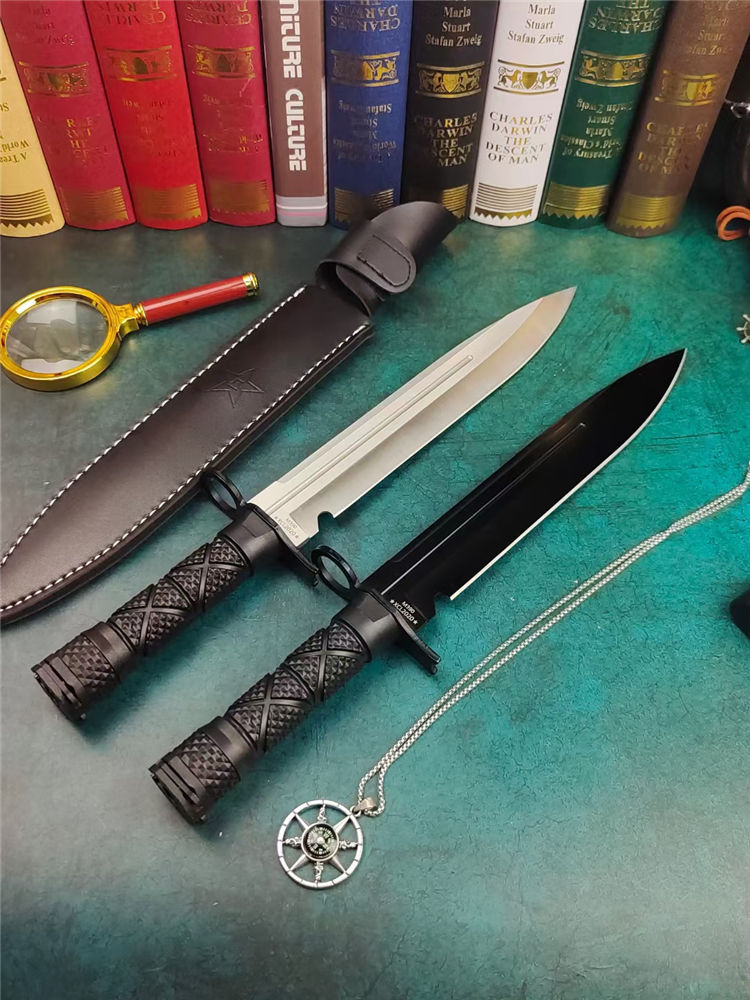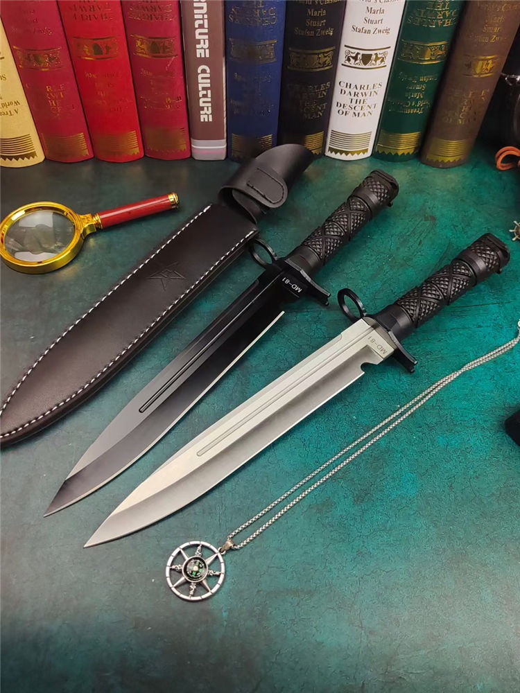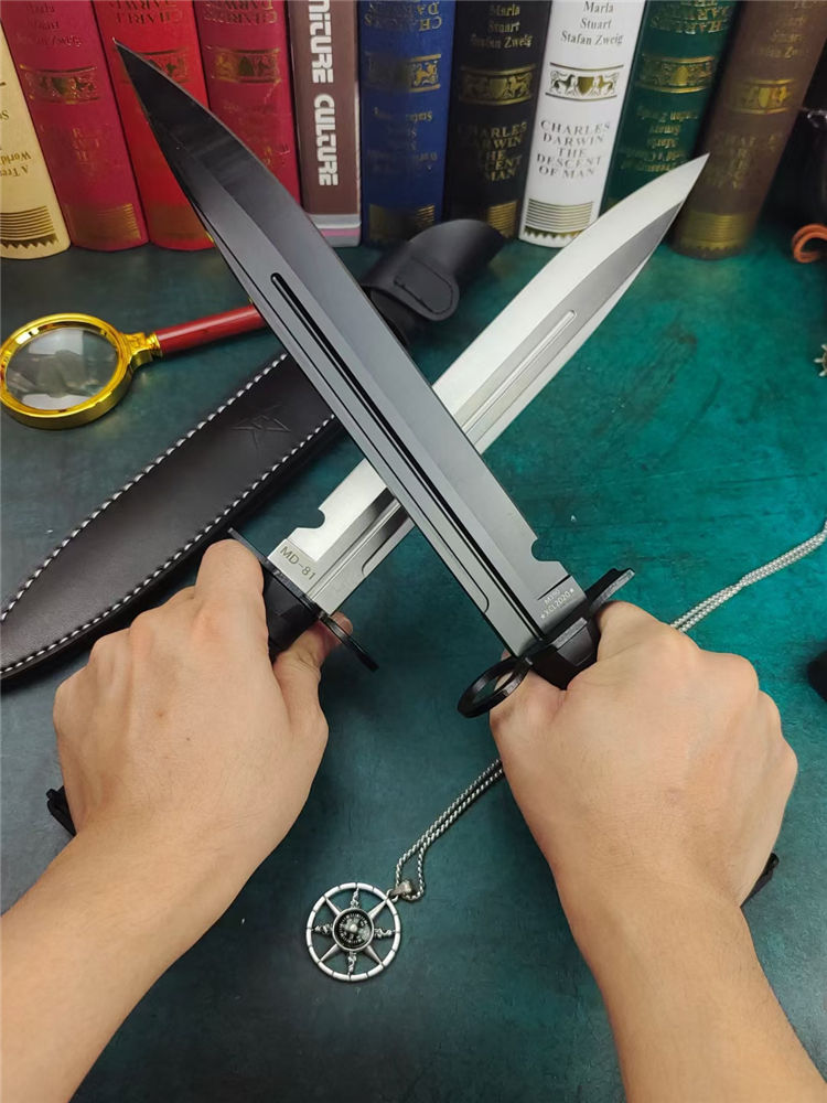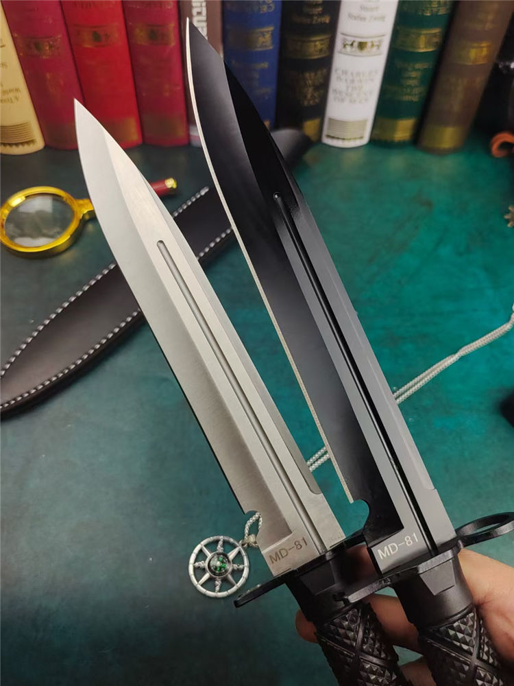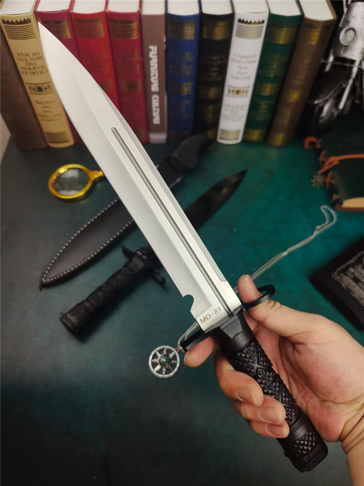 八一丛林救生刀 全长:38cm 刃长:25cm 柄长:12.8cm 刃宽:3.4cm 刃厚:0.45cm 刃材:7cr15特种钢 硬度:59HRC 重量:352g含皮套 附带仿皮刀套