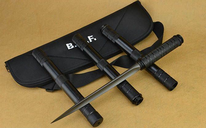 B.M.F.水管组合三棱刺 品牌:美国United联合刀具(代工品) 完全正合长度:88CM 完全反驳长度:113.5CM 刃长:24.5CM 管径: 2.8CM 重量: 1320g 硬度: 56HRC 刀材质:不锈钢 表面处理:电泳黑化 管材: 钢管 柄材: 钢管 其他:尼龙套 可接驳成长刺和长棍。(只供收藏)