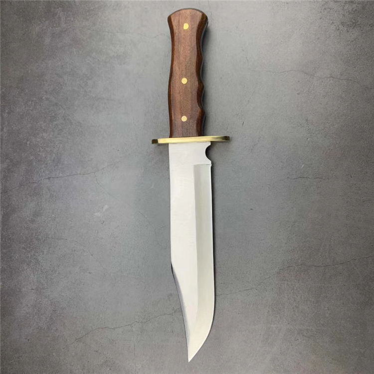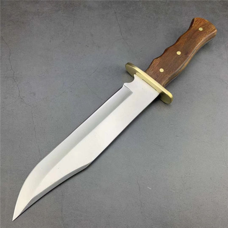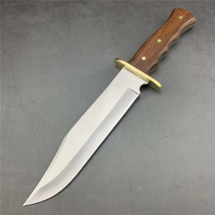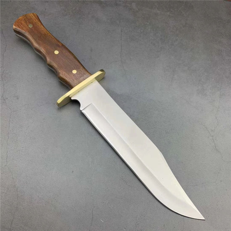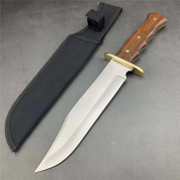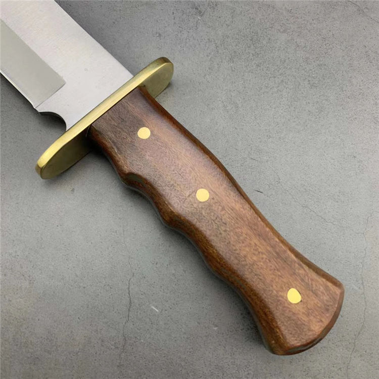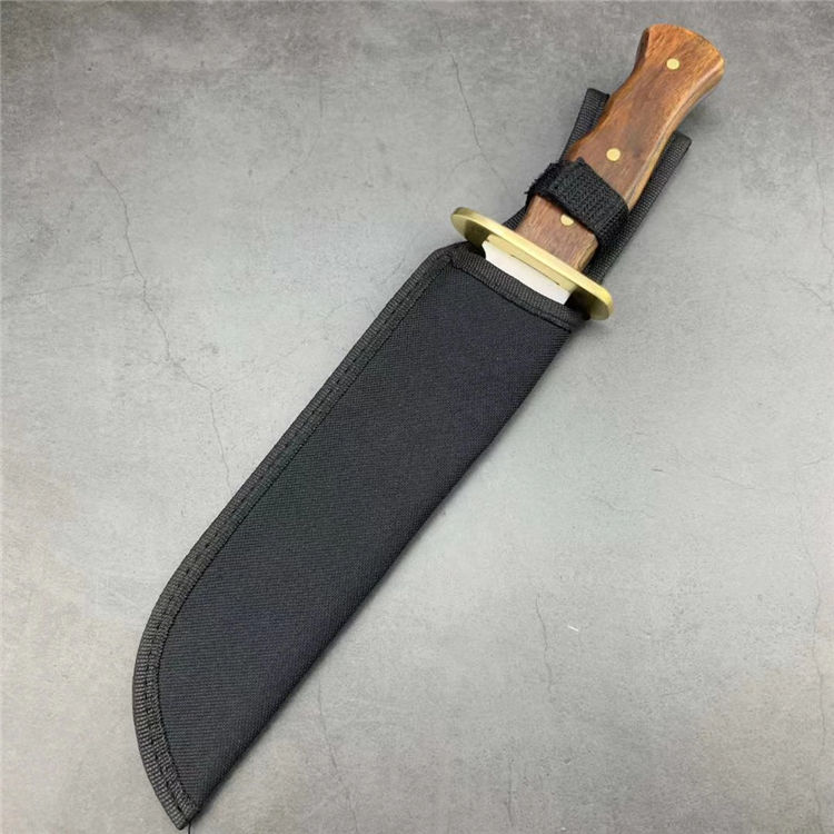 美军博伊刀 材质:特种高碳钢 刀套:尼龙套 硬度:58-60HRC 类型:军刀 全长:35.5厘米 刃长:23厘米 柄长:10.2厘米 厚度:0.5厘米 宽度:5.2厘米 重量:550克 柄材:红檀木(天然木柄颜色各异)