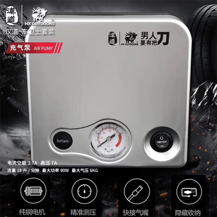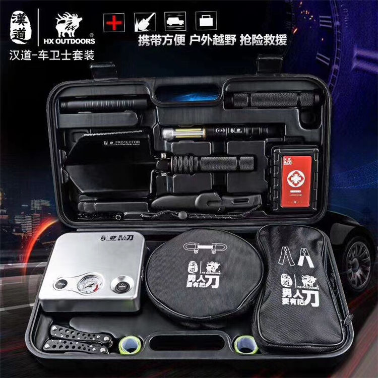 汉道车卫士套装 为自驾越野而生,汉道车卫士套装配备充气泵,拖车绳,汽车电瓶搭火线,守护者多功能铲,电筒,生存刀,纱布剪,反光条,急救包,钳子配件,多功能钳,组成一套完整的车载工具套装。使用便携手提箱收纳,携带方便;功能全面,车载应急,务实好用