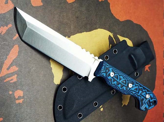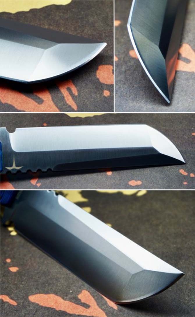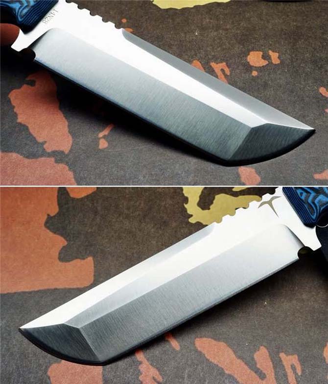 战神户外直刀 钢材:14N28山特维克(新材料) 开料:线切割开料 总长:280mm 刃长:155mm 柄长:125mm 刀刃最宽处:4mm 热处理方式:真空碎油热处理 硬度:59—69RHC 净重:415克(不含包装) 柄材:彩色黑蓝G10(电脑锣凹凸)纹防滑效果 刃表面:数控水磨开三重刃有着超强立体感 刀鞘:K鞘搭配(美国进口K料) 包装:精美手工合子 男人需要一把好刀