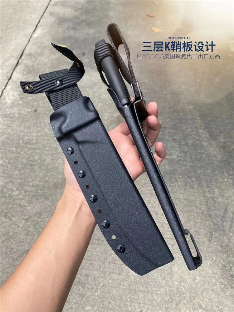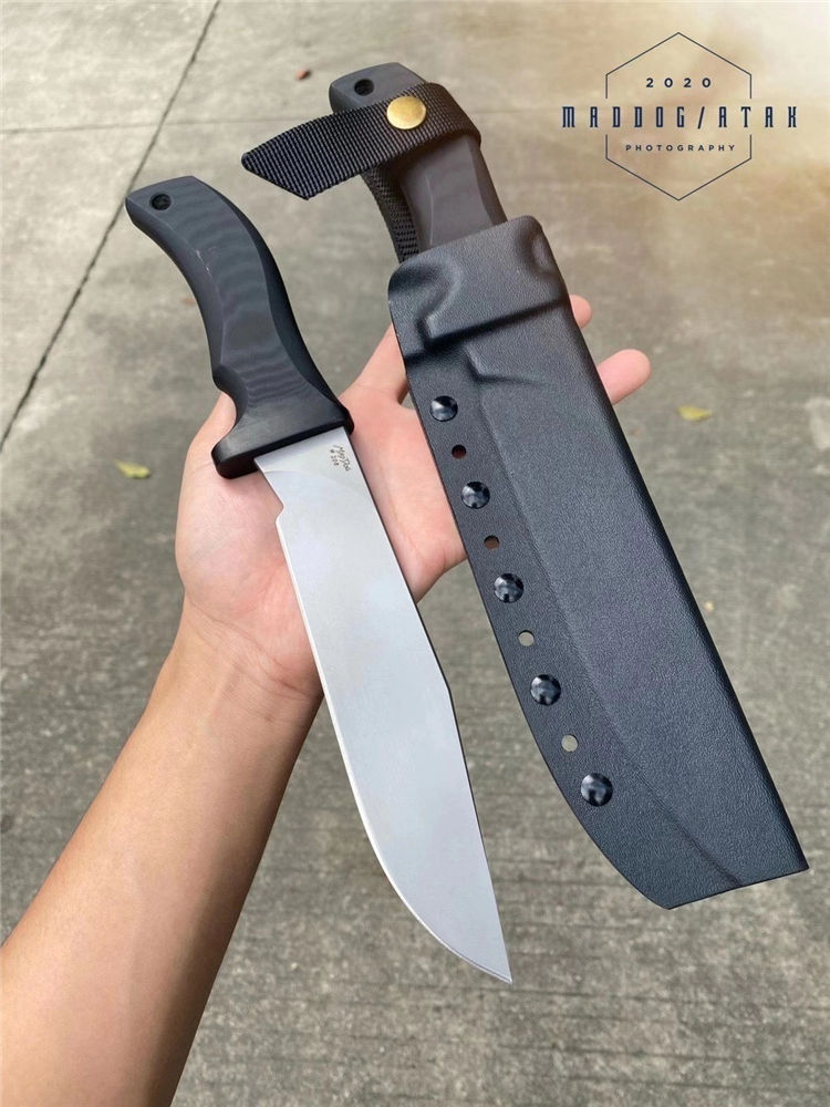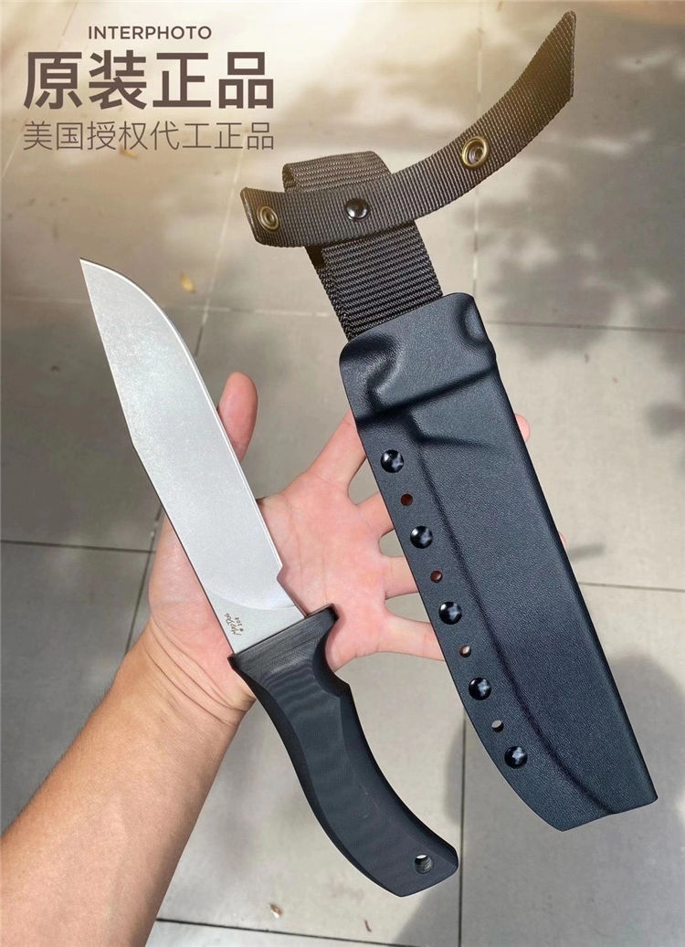 柄材: 黑色G10复合材质+环氧基树脂合成材质,全包柄设计,龙骨结构,一体A8钢龙骨入柄内凹槽锁定,刀鞘: 战术三层进口K板刀鞘 对应编号刀鞘