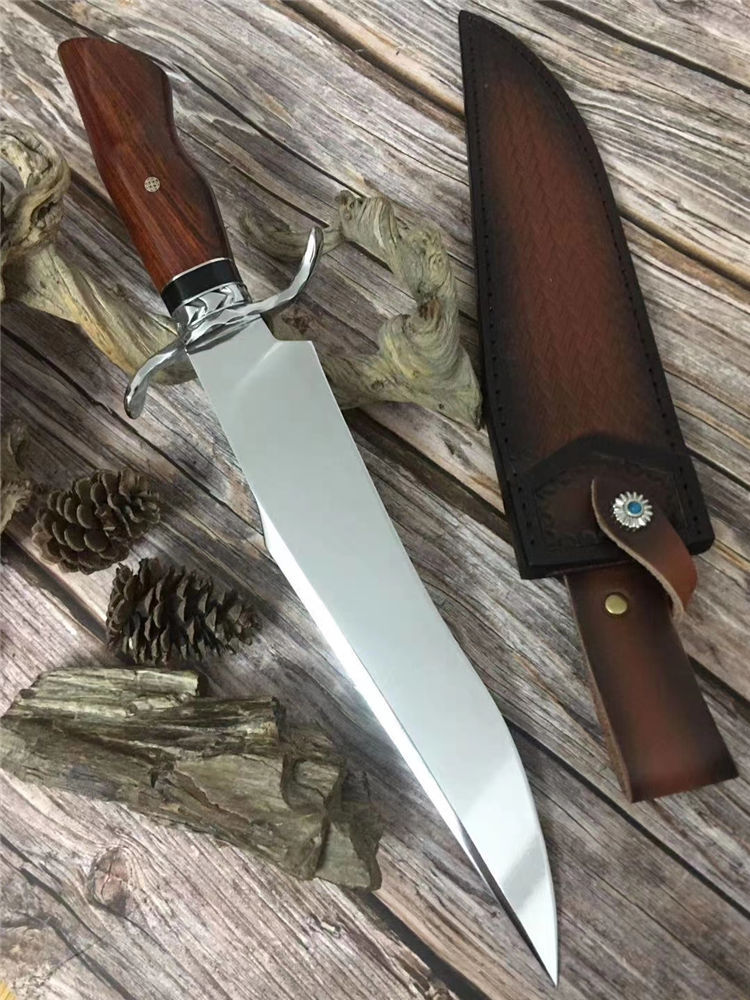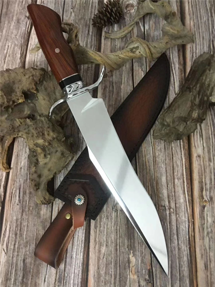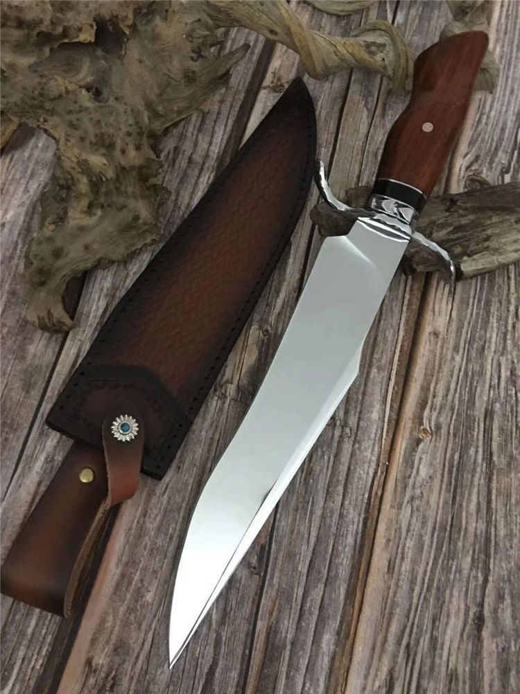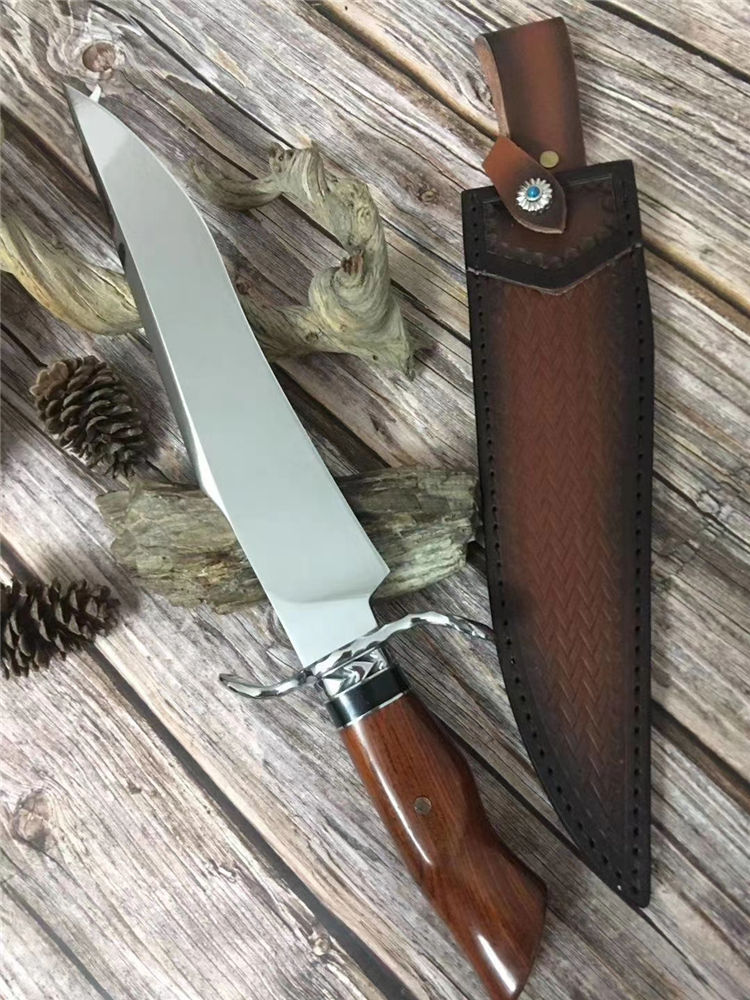 寒冰大型博弈直刀 总长:42.5cm 刃长:28cm 柄长:14cm 宽度:5CM 刃厚:0.6cm 钢材:进口VG10真实钢材 柄材:进口微粒黄檀木 硬度:61HRC 重量:518g净重 热处理:真空深冷热处理 表面效果: 镜光效果可当镜子 护手:430不锈钢电脑CNC 皮套:意大利进口手工雕花手工缝线植鞣皮