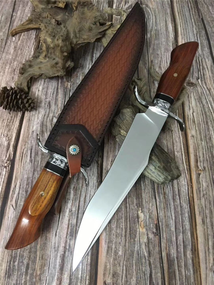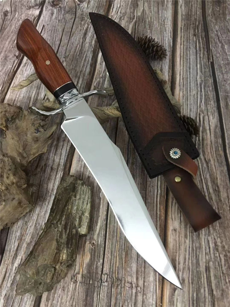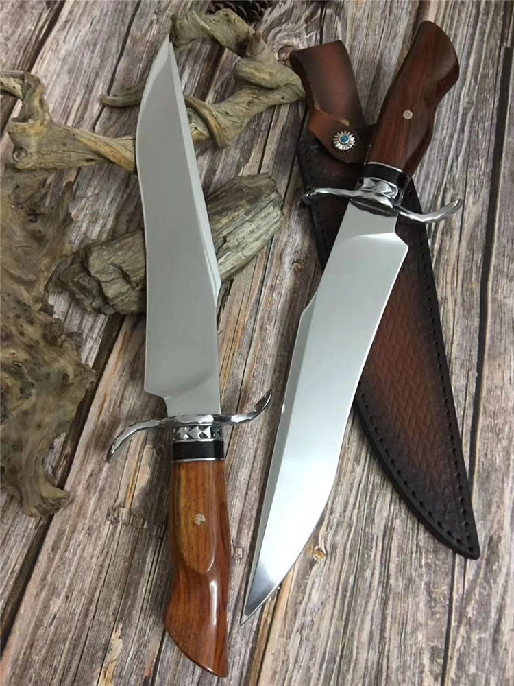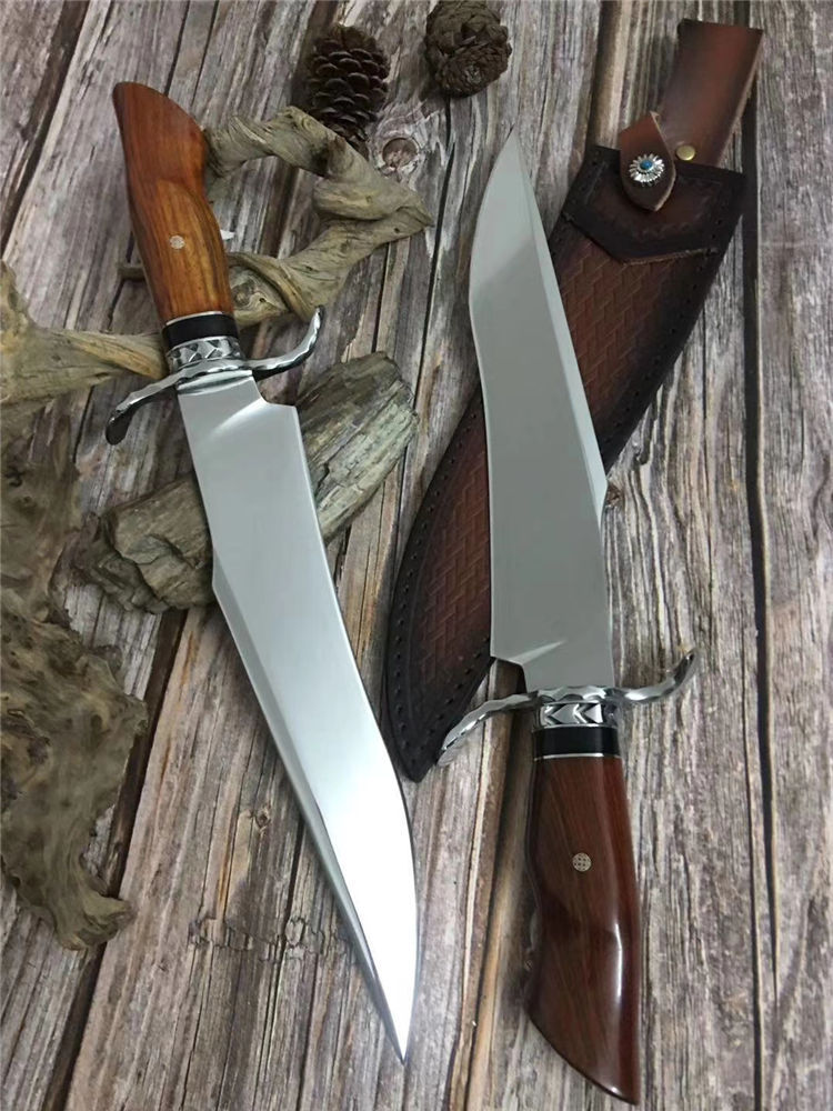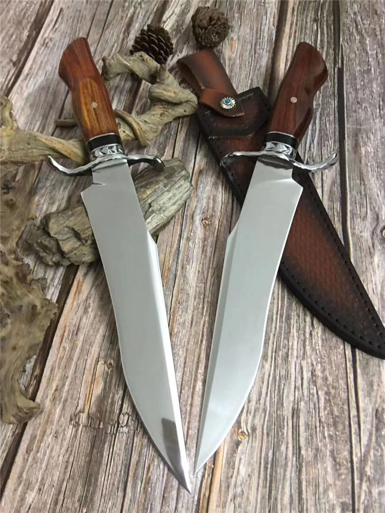 寒冰大型博弈直刀 总长:42.5cm 刃长:28cm 柄长:14cm 宽度:5CM 刃厚:0.6cm 钢材:进口VG10真实钢材 柄材:进口微粒黄檀木 硬度:61HRC 重量:518g净重 热处理:真空深冷热处理 表面效果: 镜光效果可当镜子 护手:430不锈钢电脑CNC 皮套:意大利进口手工雕花手工缝线植鞣皮