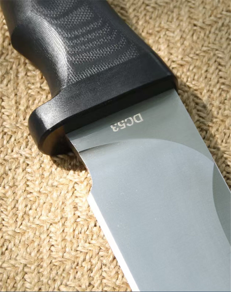 博尔特疯狗突击直刀 全长:367mm 刃长:237mm 柄长:131mm 刃厚:6mm 刀最宽处:41mm 刃材:欧标DC53(线切割开料) 柄材:G10护手和柄+管钉 表面:数控V磨,平面幼拉丝 类型:以锋利度,韧性保持度和稳定性最出色 开刃方式:二次开刃 热处理方式:真空淬油热处理 硬度:61—62HRC 净重:830g(不含包装和刀鞘) 刀鞘:进口K鞘+360度旋转腰夹 包装:黑色硬纸盒+护刀油
