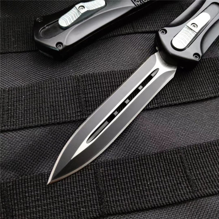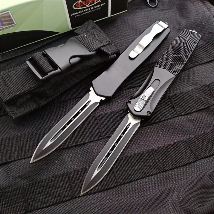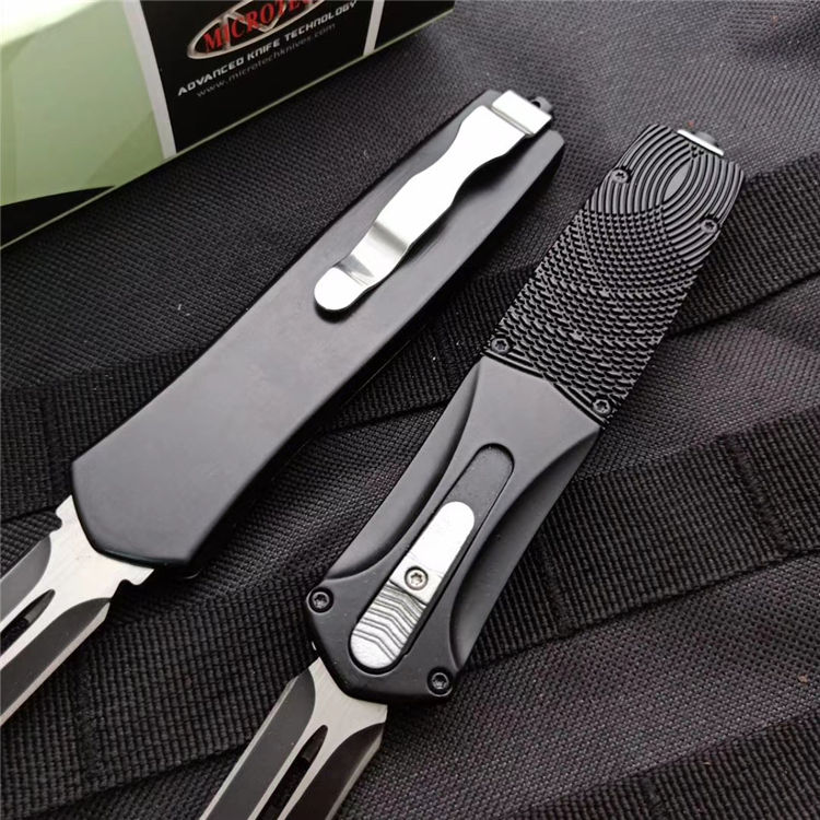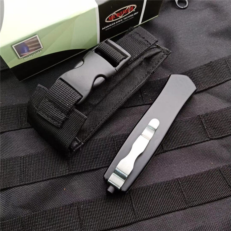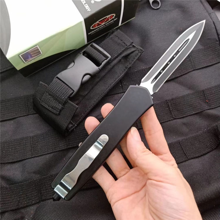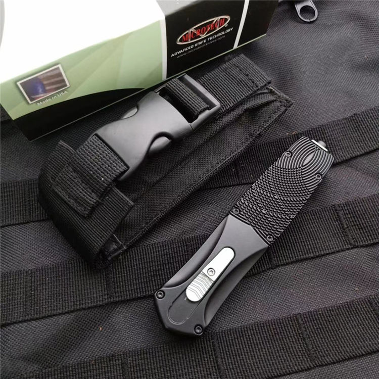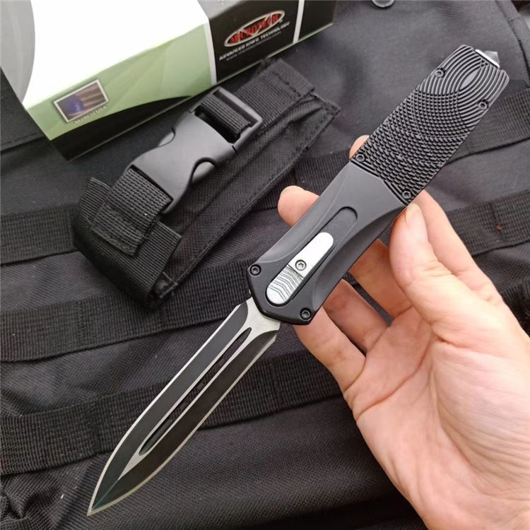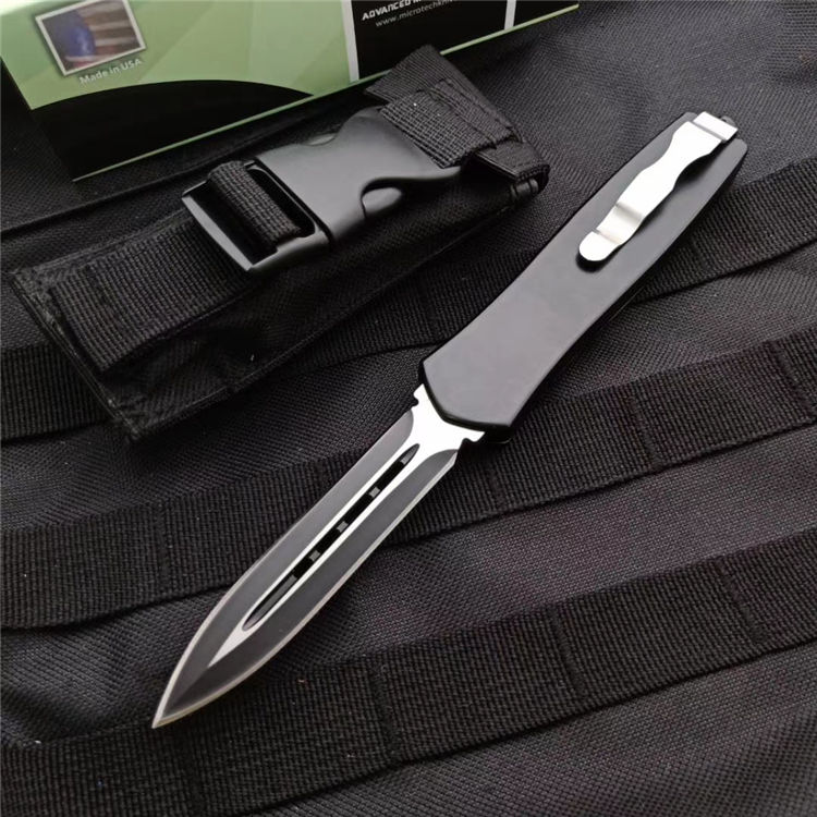 微技术网纹直出跳刀 全长:23cm 刃长:9cm 刃厚:3mm 刃宽:1.5cm 柄长:14cm 刃材:3洛钢 硬度:57 柄材:不锈钢柄 刀套:尼龙套 备注:带腰夹