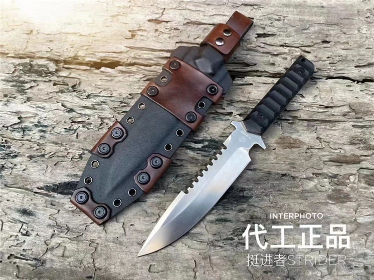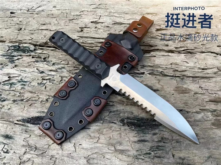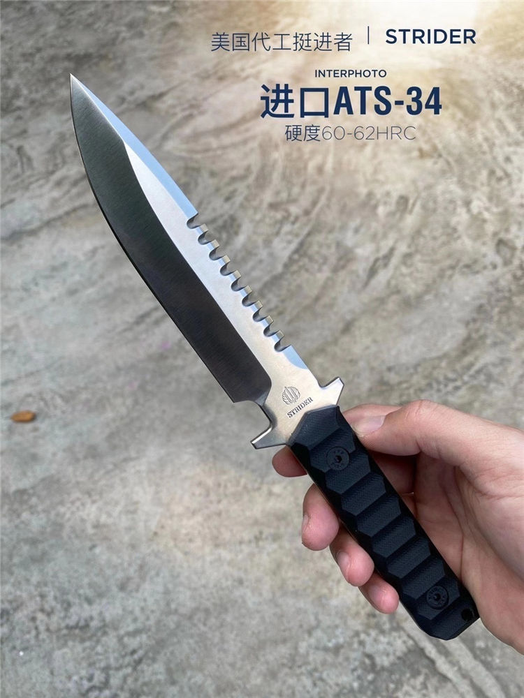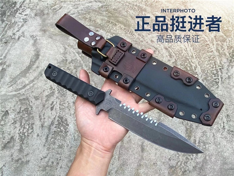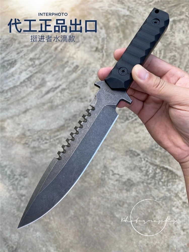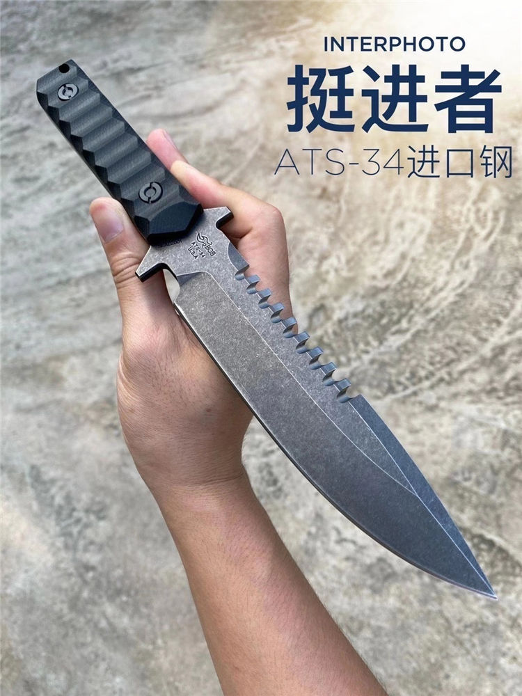 挺进者海豹特击队直刀 全长:29CM 刃长:15CM 刃厚:6MM 刃宽:3.5CM 重量:单刀330G 钢材:公司提供日立ATS-34钢 硬度:60-62HRC 热处理:BOS专业真空热处理油淬 表面处理:砂光效果与灰黑石洗效果 柄材:黑色复合G10材质 刀鞘:进口K版+植鞣皮做旧效果 产地:中国授权代工出口OEM