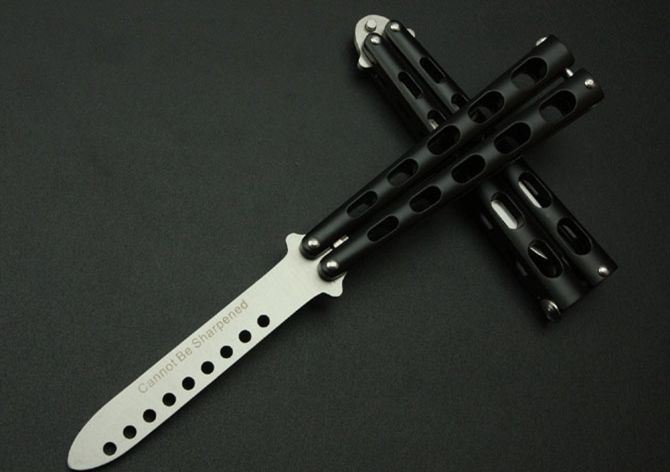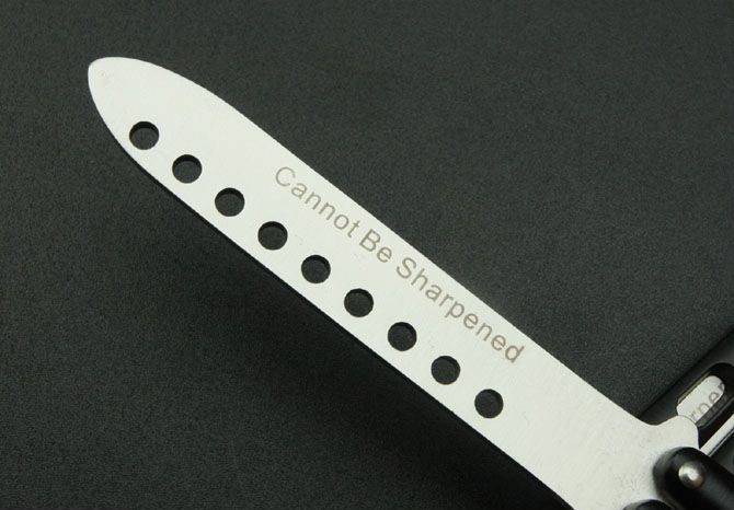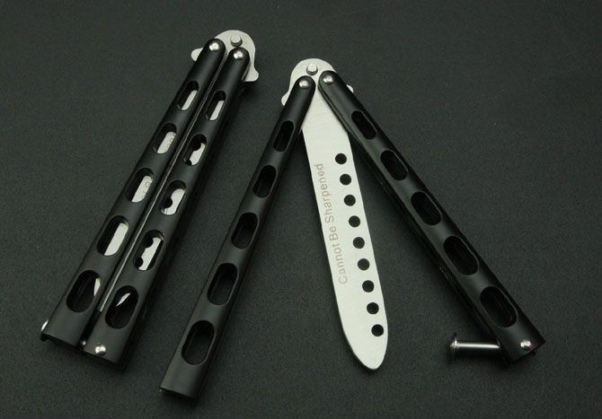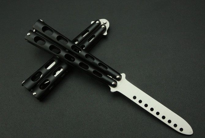 蝴蝶C34训练甩刀(黑色和白色) 全长:22.7cm 刃长:10cm 刃厚:0.32cm 柄长:12.5cm 刃宽:1.7cm 刃材:5Cr13MoV 柄材:全金属 硬度:56HRC 重量:160g 表面处理:氧化黑+砂光 锁型:甩刀
