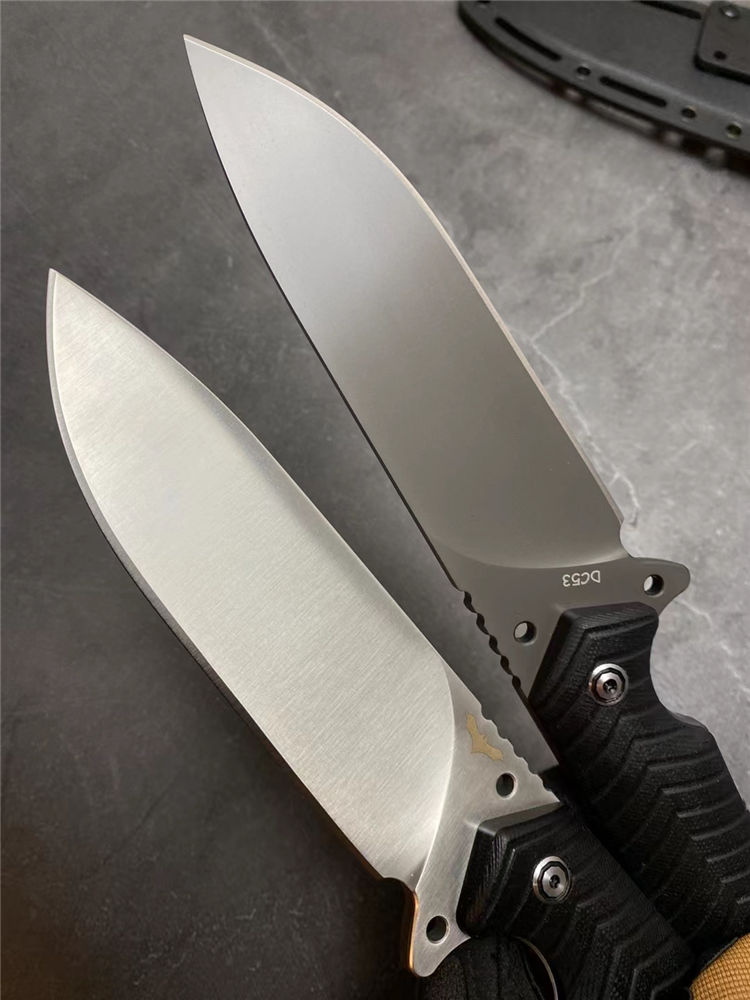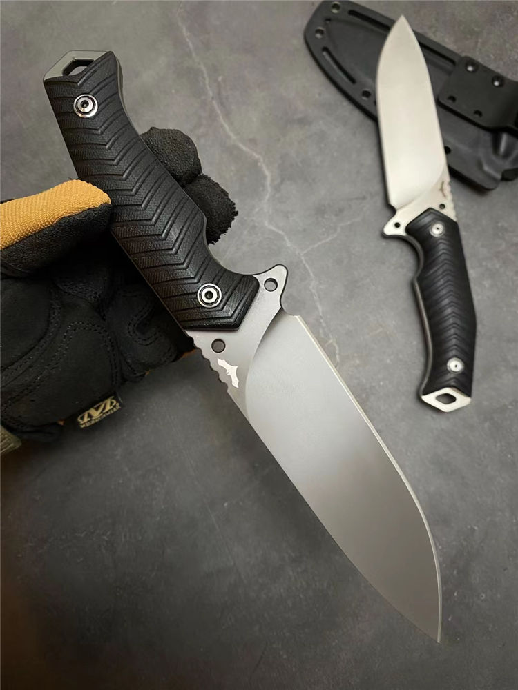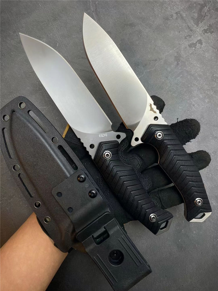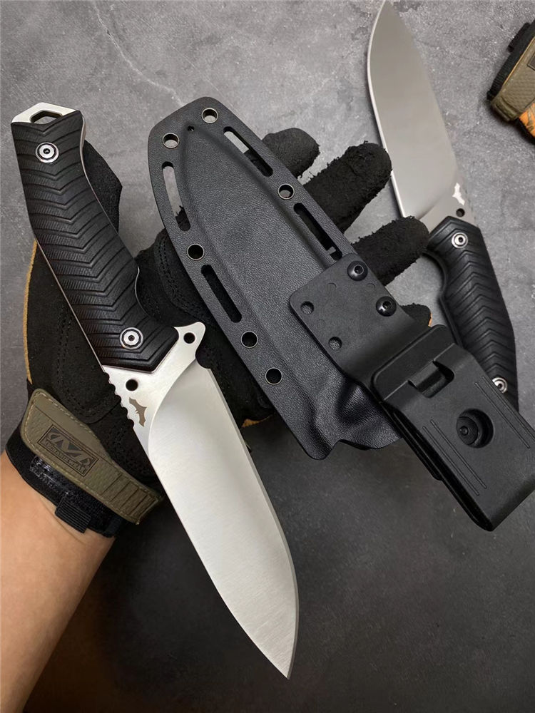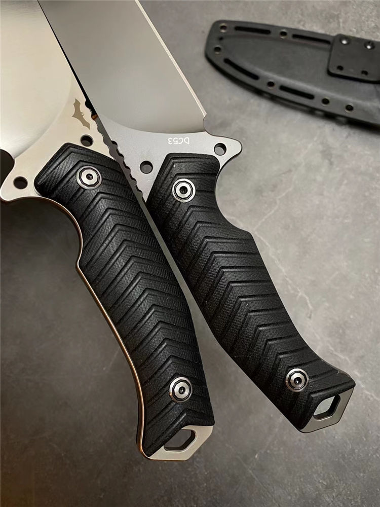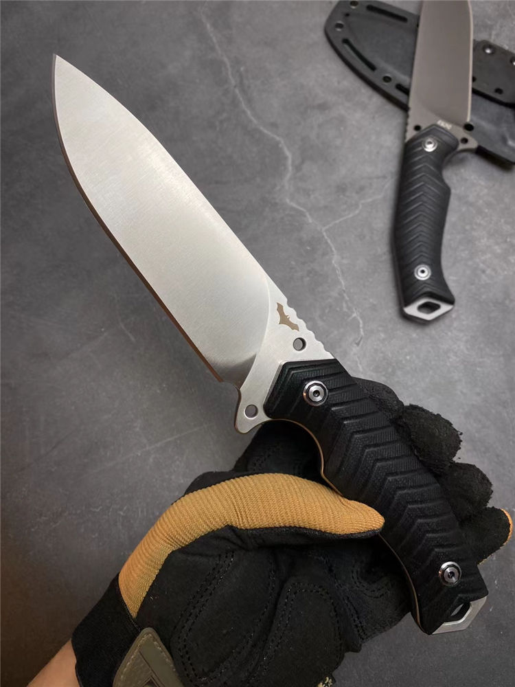 蝙蝠悍将直刀 总长:26CM 刃长:13CM 刃厚:5MM 刃宽:3.9CM 重量:275克(不含K鞘) 钢材:进口DC53模具钢 硬度:60-61HRC,硬度韧性非常好 热处理:真空热处理,3次回火,稳定性能强 柄材:复合G10材质CNC磨箭头纹,防滑手感出色 结构:一体龙骨结构,G10复合材质贴片,强悍牢固 表面效果:砂光效果与灰钛效果 开刃方式:多次开刃 刀套:进口K鞘刀套 包装:黑色礼盒包装